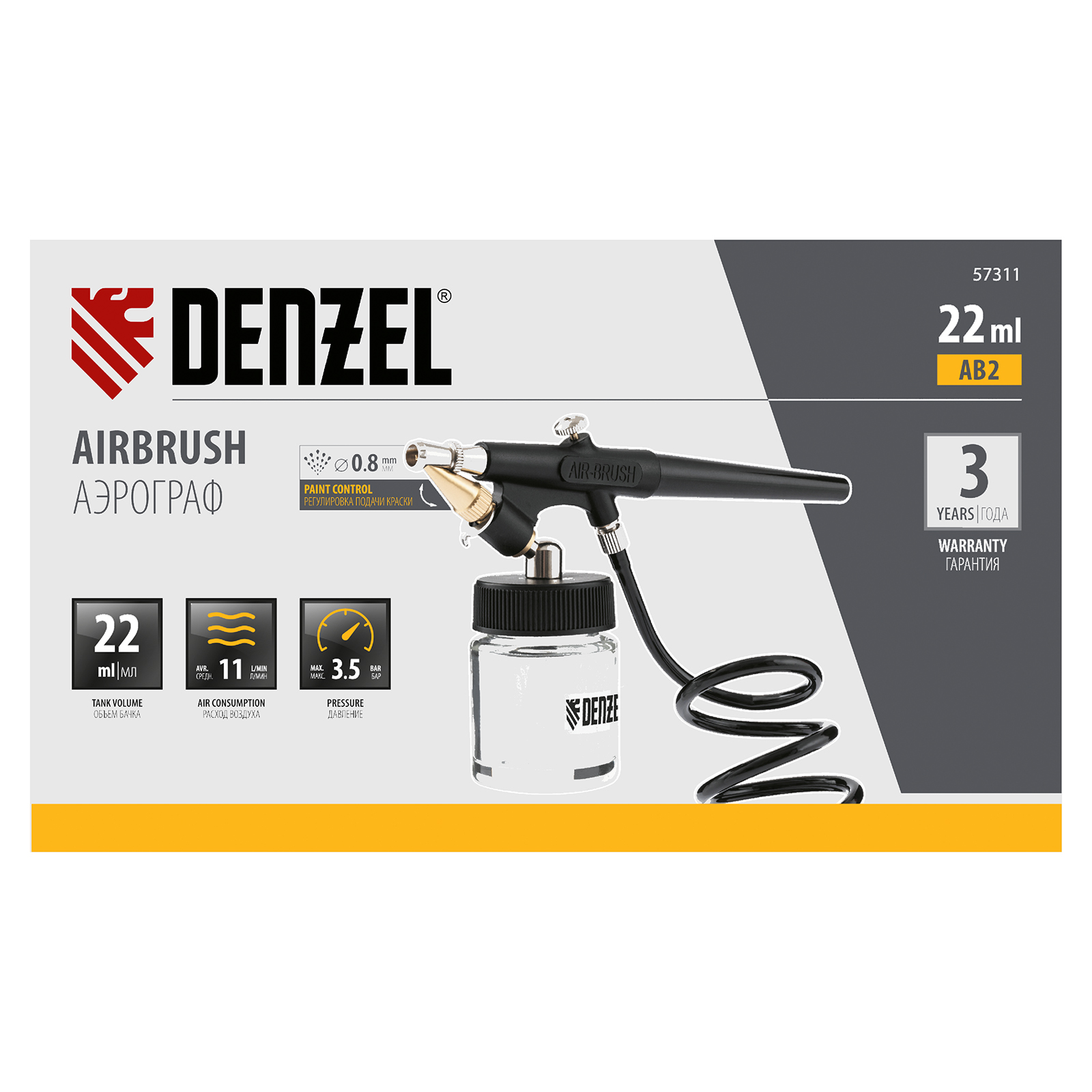 Аэрограф Denzel AB2 57311 с нижним бачком объемом 22 мл расходует 11 л сжатого воздуха в минуту и формирует струю краски диаметром 0,8 мм. Предназначен для выполнения тонких художественно-декоративных и покрасочных работ. Имеет курок одинарного действия: скорость воздушного потока постоянна на протяжении всего времени работы. Аэрограф позволяет создавать рисунки на кузовных элементах автомобилей, мото- и другой техники, а также на прочих поверхностях.