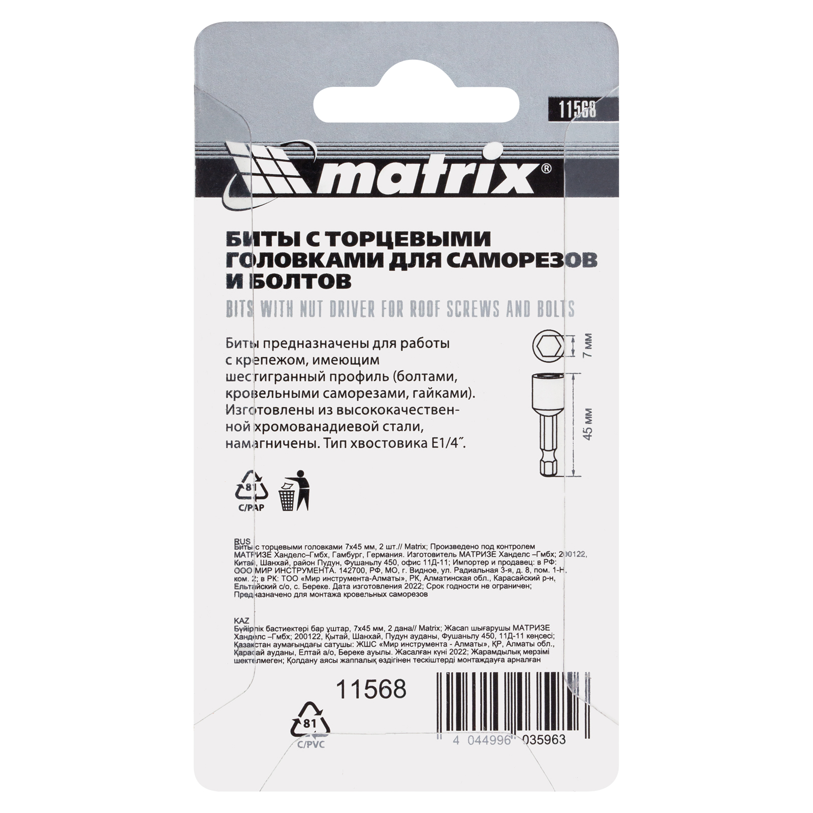 Биты с торцевыми головками 7 мм, 45 мм, 2 шт. Matrix