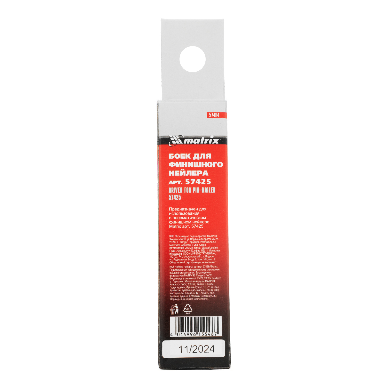 Боек Matrix 57484 устанавливается на финишный нейлер 57425. Снабжен уплотнительным кольцом, обеспечивающим герметичность ударного механизма при давлении до 10 МПа и не теряющим своих свойств при температуре воздуха до -20 градусов C.