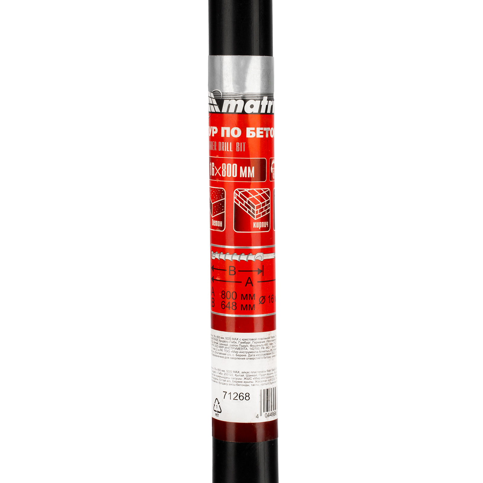 Бур по бетону Matrix 71268 размером 16 х 800 мм используется в качестве оснастки на тяжелых перфораторах с хвостовиком SDS MAX. Подходит для сверления глубоких отверстий в кирпиче и особо прочных материалах: армированном бетоне, природном и искусственном камне.