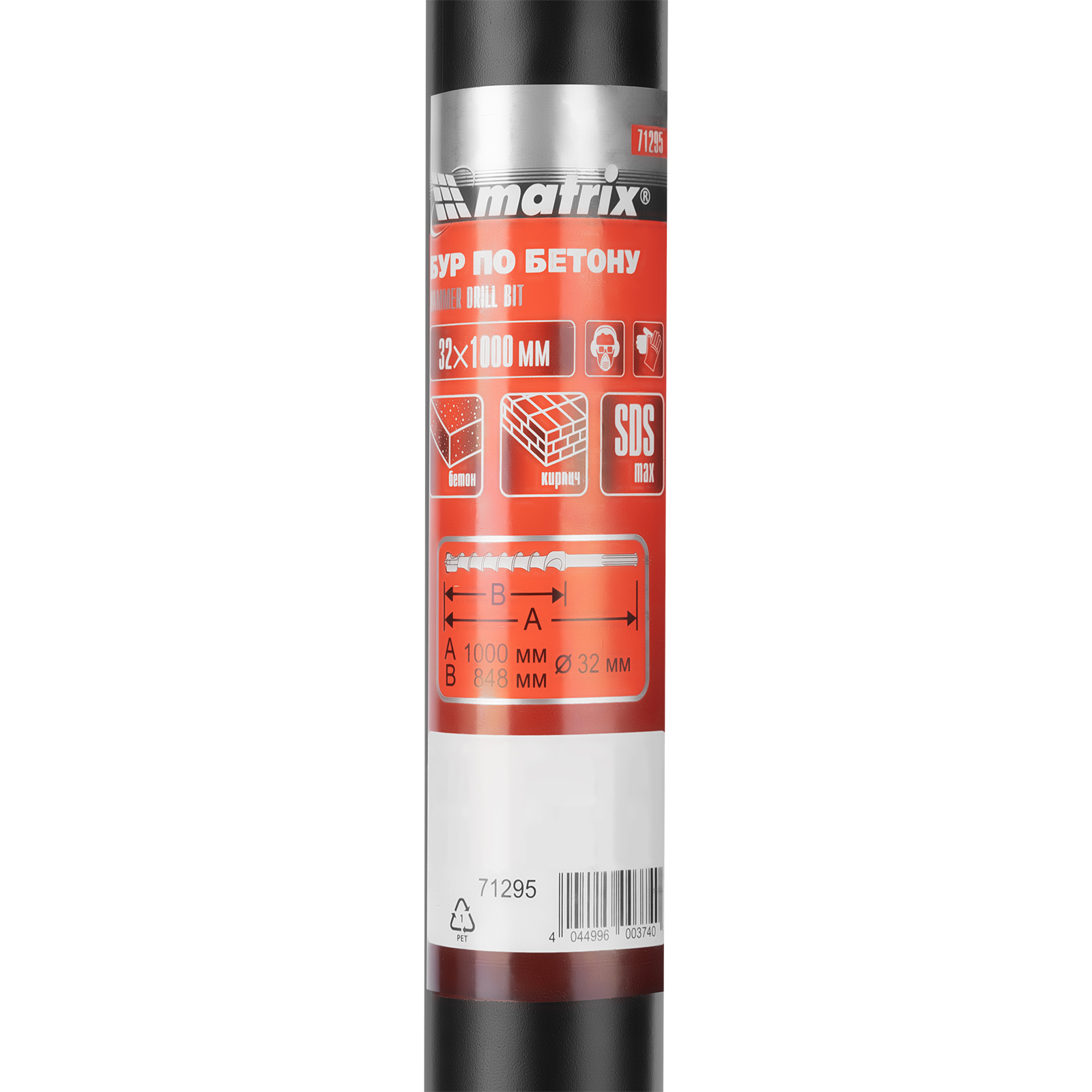 Бур по бетону Matrix 71295 размером 32 х 1000 мм используется в качестве оснастки на тяжелых перфораторах с хвостовиком SDS MAX. Подходит для сверления глубоких отверстий в кирпиче и особо прочных материалах: армированном бетоне, природном и искусственном камне.