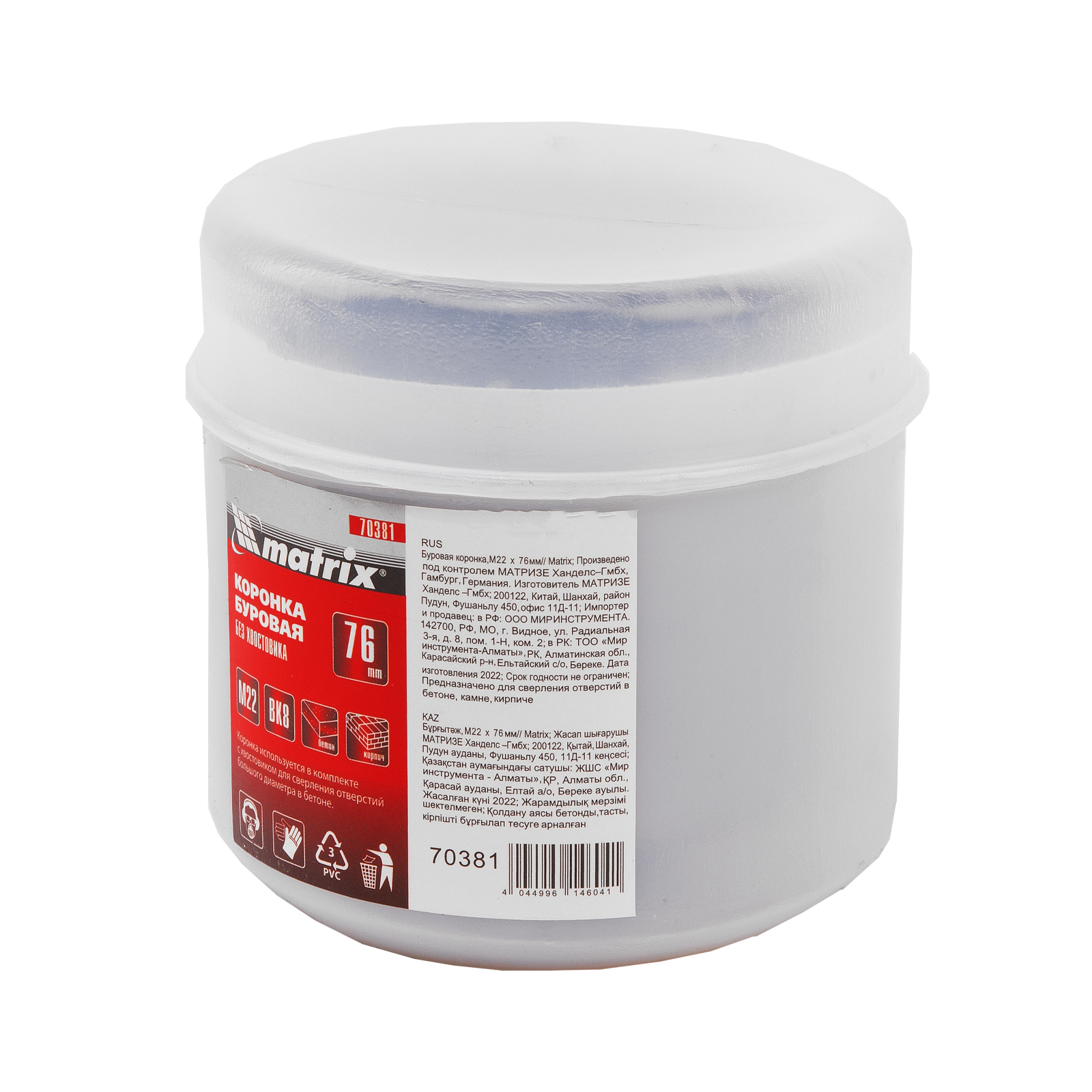 Буровая коронка M22 х 76 мм Matrix 70381 рассчитана на сверление отверстий в бетоне, кирпиче, граните, природном и искусственном камне. Устанавливается на ударные дрели или перфораторы с патронами под хвостовик SDS-Plus или SDS-Max. Коронка позволяет получить большие отверстия, поэтому пригодится для монтажа розеток, выключателей и прокладки труб.
