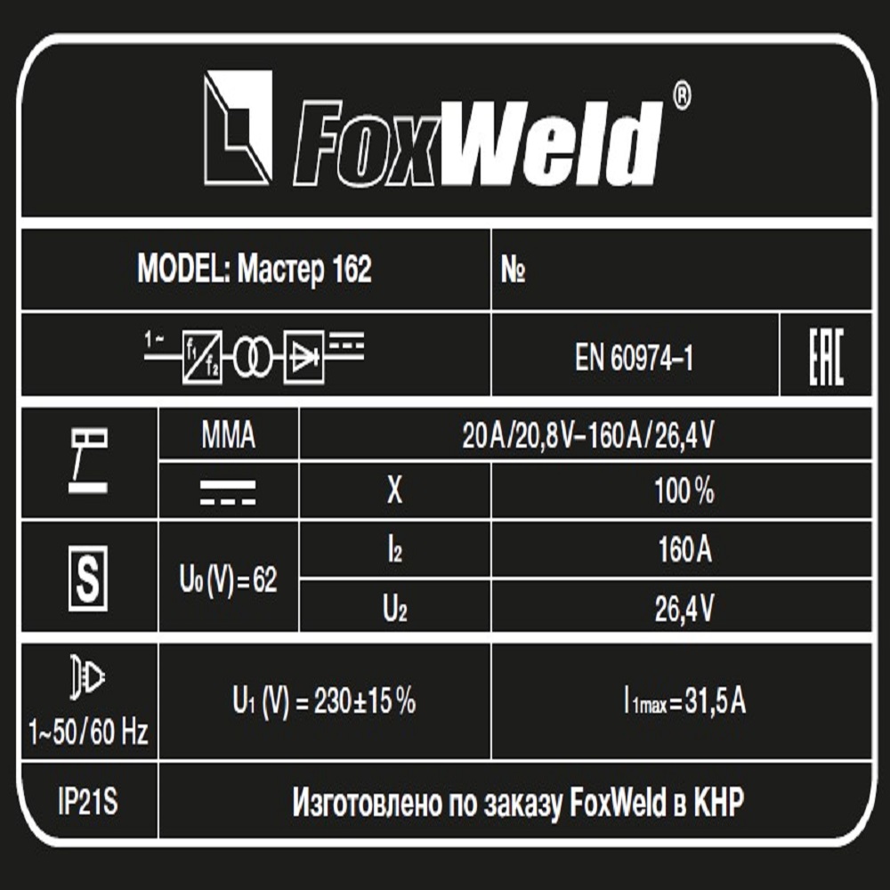 Сварочный аппарат инверторного типа FOXWELD МАСТЕР 162 разработан и сделан для профессионалов, главные особенности - мощность, надежность, компактность. МАСТЕР 162 выполнен для реализации исключительно одного процесса сварки: электродуговая сварка покрытым электродом (MMA). Улучшенная схема стабилизации сварочного процесса дает хороший поджиг и «мягкую» сварочную дугу с минимальным разбрызгиванием. Для облегчения процесса сварки в режиме ММА и получения более качественного сварного соединения, аппарат имеет встроенные функции: AntiSticking (антиприваривание), Arc Force (форсаж дуги) и Hot Start (горячий старт). Модель отличается простой панелью управления и возможностью работать при пониженном напряжении. Вся мощность сварочного тока передаётся от инвертора к сварочным розеткам (байонетам) через медные шины большого сечения. Розетки имеют большой размер 35-50, что также положительно сказывается на передаче полной мощности и долговечности мест соединения: кабельная розетка – кабельная вилка.РАБОТА БЕЗ ОСТАНОВКИ: Параметр ПВ 100% на максимальном токе при КПД 85% обеспечивает бесперебойную устойчивую работу сварочного аппарата в течении всего рабочего дня. Это позволяет производить безостановочный сварочный процесс и выполнять работы, которые требуют больших временных затрат, что повышает скорость и производительность.РАБОТА ПРИ ПОНИЖЕННОМ НАПРЯЖЕНИИ: Аппарат работает от однофазной сети 220 В при перепадах напряжения от 140 до 270 В. Это даёт возможность производить сварочные работы в «плохих» сетях – на даче, в домашних условиях при пониженном или нестабильном напряжении.НЕБОЛЬШОЙ ВЕС: Небольшой вес и размеры сварочного аппарата плюс ручка на корпусе добавляют мобильности, компактности и идеально подходят для бытового и профессионального использования.ИНФОРМАТИВНАЯ ПАНЕЛЬ УПРАВЛЕНИЯ: Регулировочная ручка и цифровой дисплей для отображения информации позволяют установить значения сварочного тока. На передней панели также расположен светодиодный индикатор перегрева/неисправности.ПРЕИМУЩЕСТВА:Небольшой и компактный сварочный инверторРеально соответствует заявленным характеристикамПитание от обычной сети 230 ВУверенно выдерживает пониженное и повышенное напряжение, работает при падении напряжения до 140 ВОдна из самых лучших систем стабилизации сварочного процесса и минимизации разбрызгивания за счёт улучшенной схемы управления сварочным процессомСварочные клеммы увеличенного сечения (35 мм² вместо 25 мм², как у большинства профессиональных аппаратов)Плавная регулировка сварочного токаВстроенная функция облегчения поджига дуги (Hot Start)Функция стабилизации и препятствия залипанию в процессе сварки (Arc Force)Функция снижения сварочного тока в случае замыкания электрода или электрододержателя (Anti Sticking)Цифровой дисплей на панели управления для отображения настроек сварочного токаОчень долгий период производства и продаж, при минимальном обращении в сервис для обслуживанияФУНКЦИОНАЛЬНЫЕ ОСОБЕННОСТИ:РЕЖИМ MMA: Работает с входным напряжением от 140 до 270 вольт;Может работать с диаметром покрытого электрода до 4 мм;Выставляется ток сварки от 20 до 160 ампер;Аппарат снабжён мощными и надёжными байонетами 35-50 мм;Для облегчения процесса сварки присутствуют функции: Hot Start, Arc Force и AntistickingКОМПЛЕКТАЦИЯ: Сварочный аппарат МАСТЕР 162 – 1 шт.; Эле