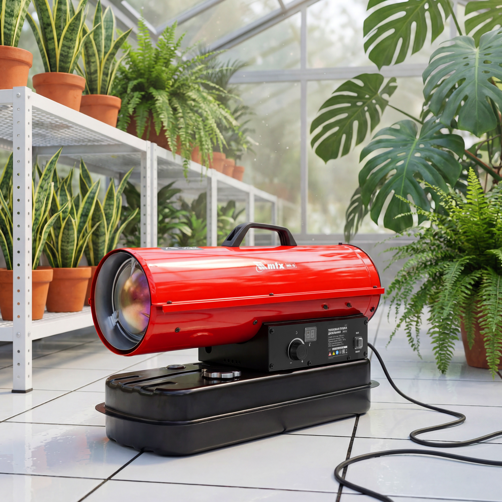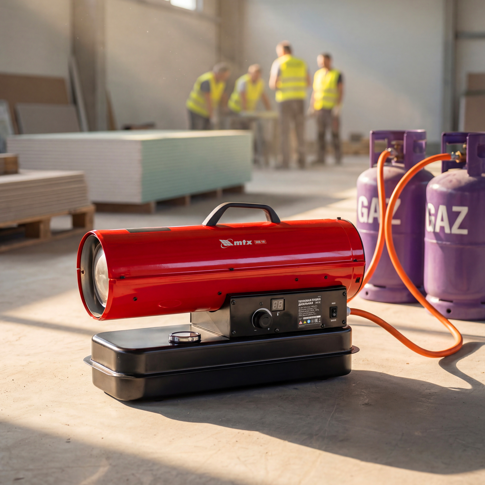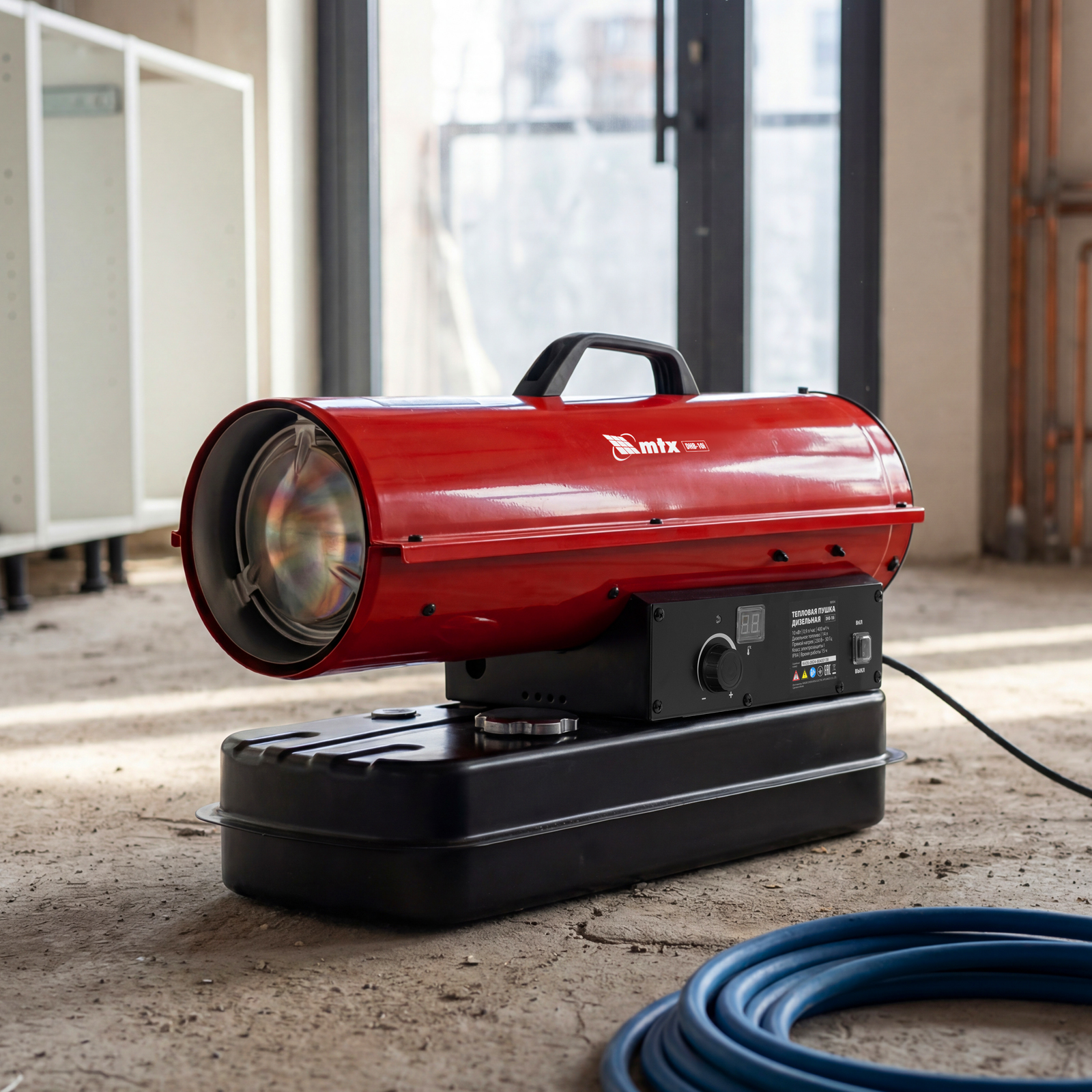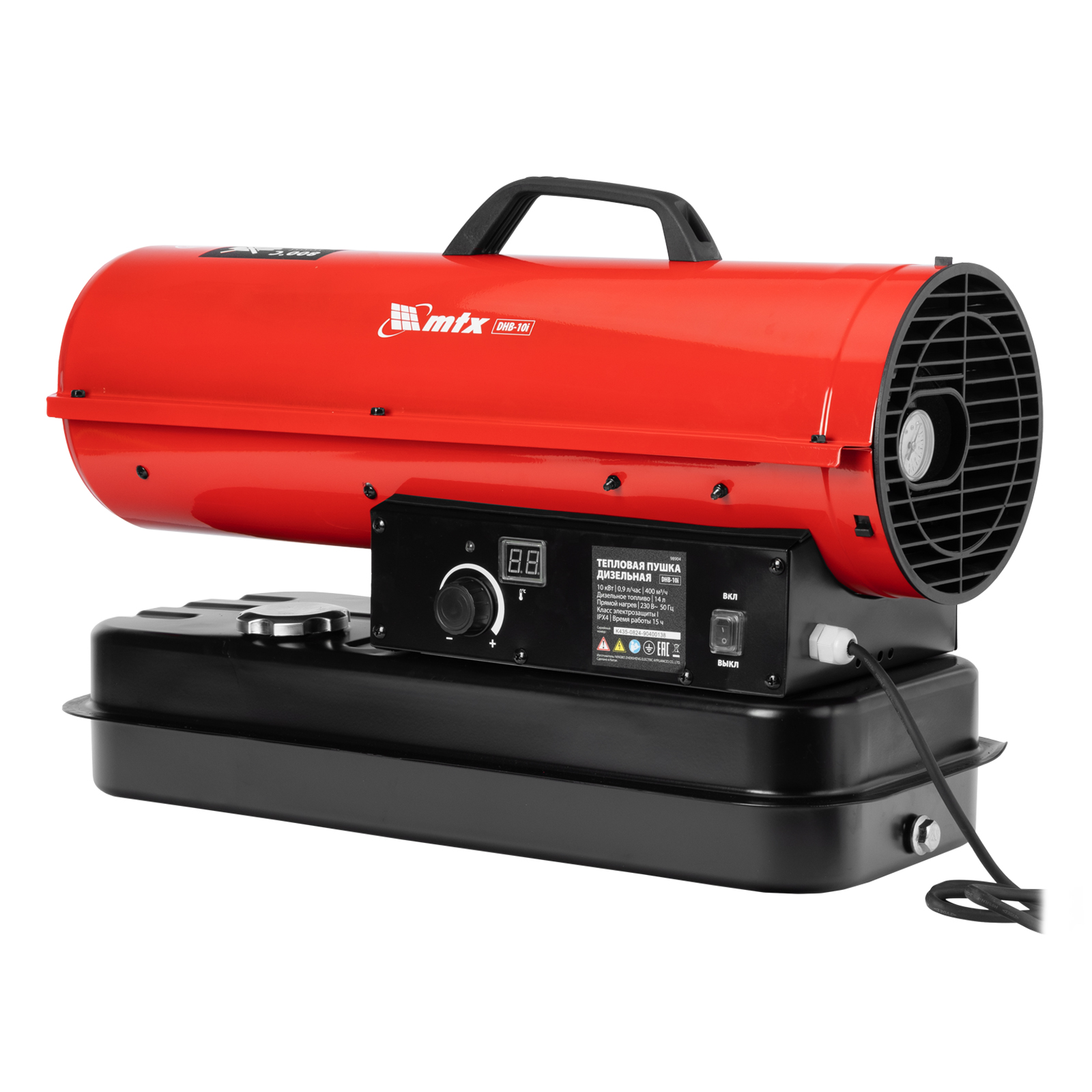 Дизельная тепловая пушка MTX DHB-10i 98904 тепловой мощностью 10 кВт и производительностью 400 м3/ч, с прямым типом нагрева и термостатом, предназначена для обогрева складов, цехов, теплиц и других нежилых помещений. Также используется на производстве и в строительстве: для прогрева бетона, просушки стен и разморозки траншей.