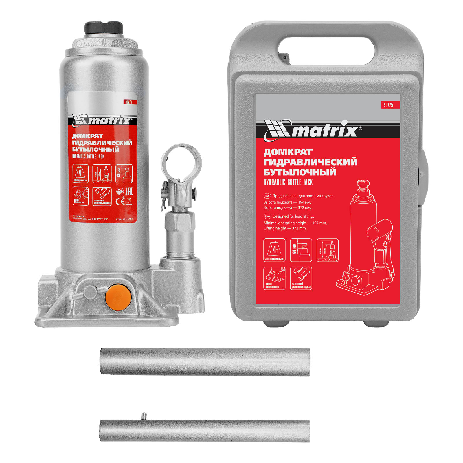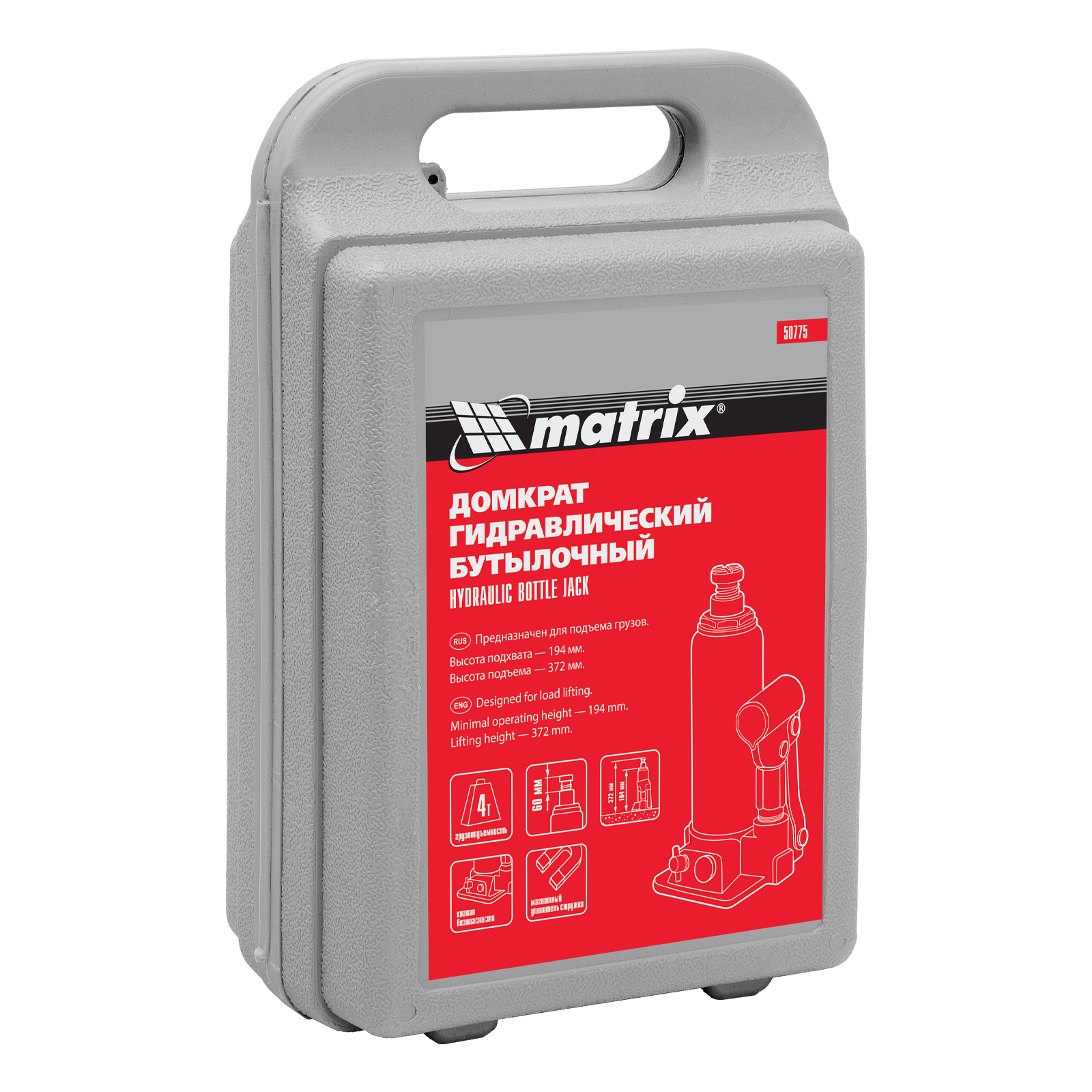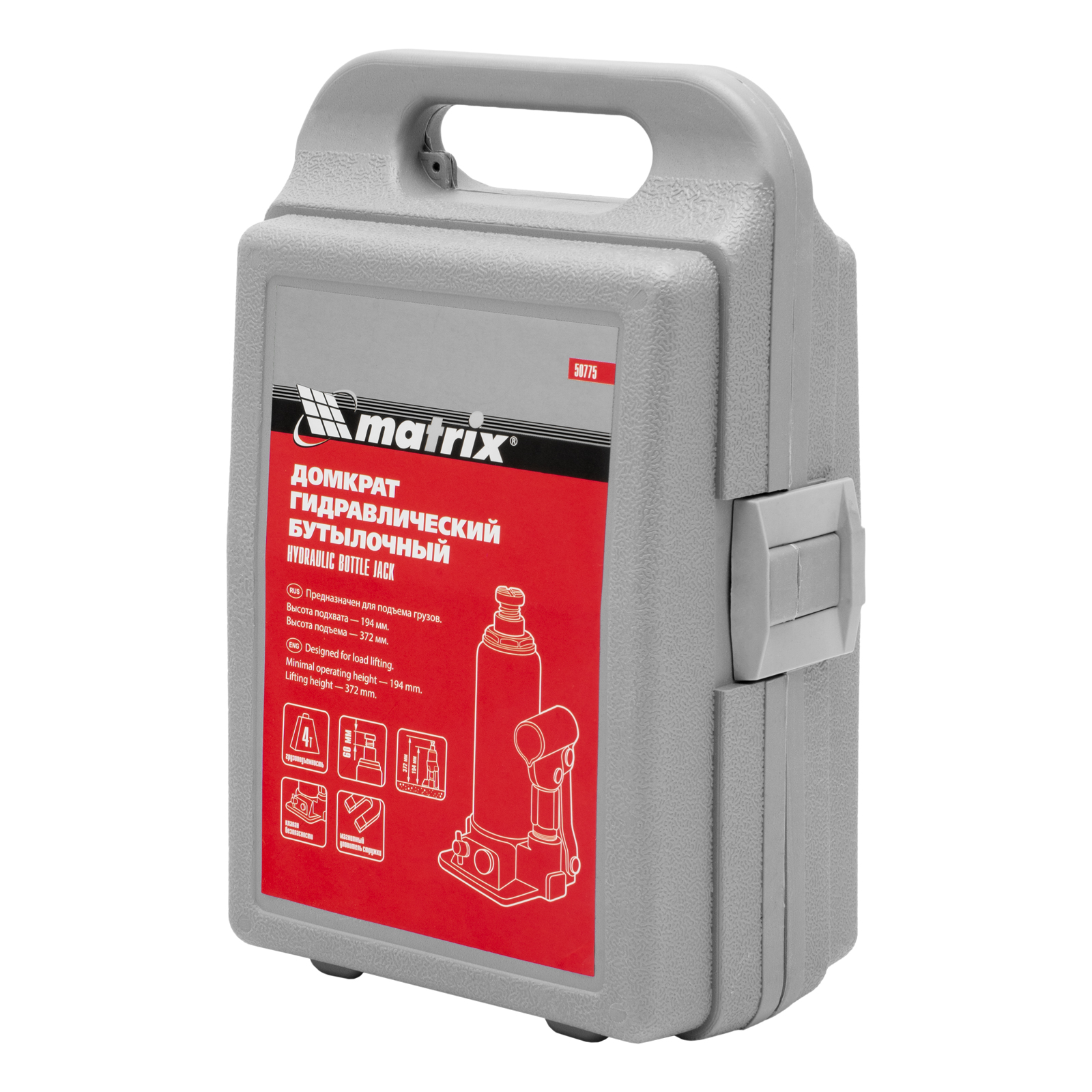 Домкрат гидравлический бутылочный, 4 т, h подъема 194-372 мм, в пластиковом кейсе Matrix в Санкт-Петербурге
