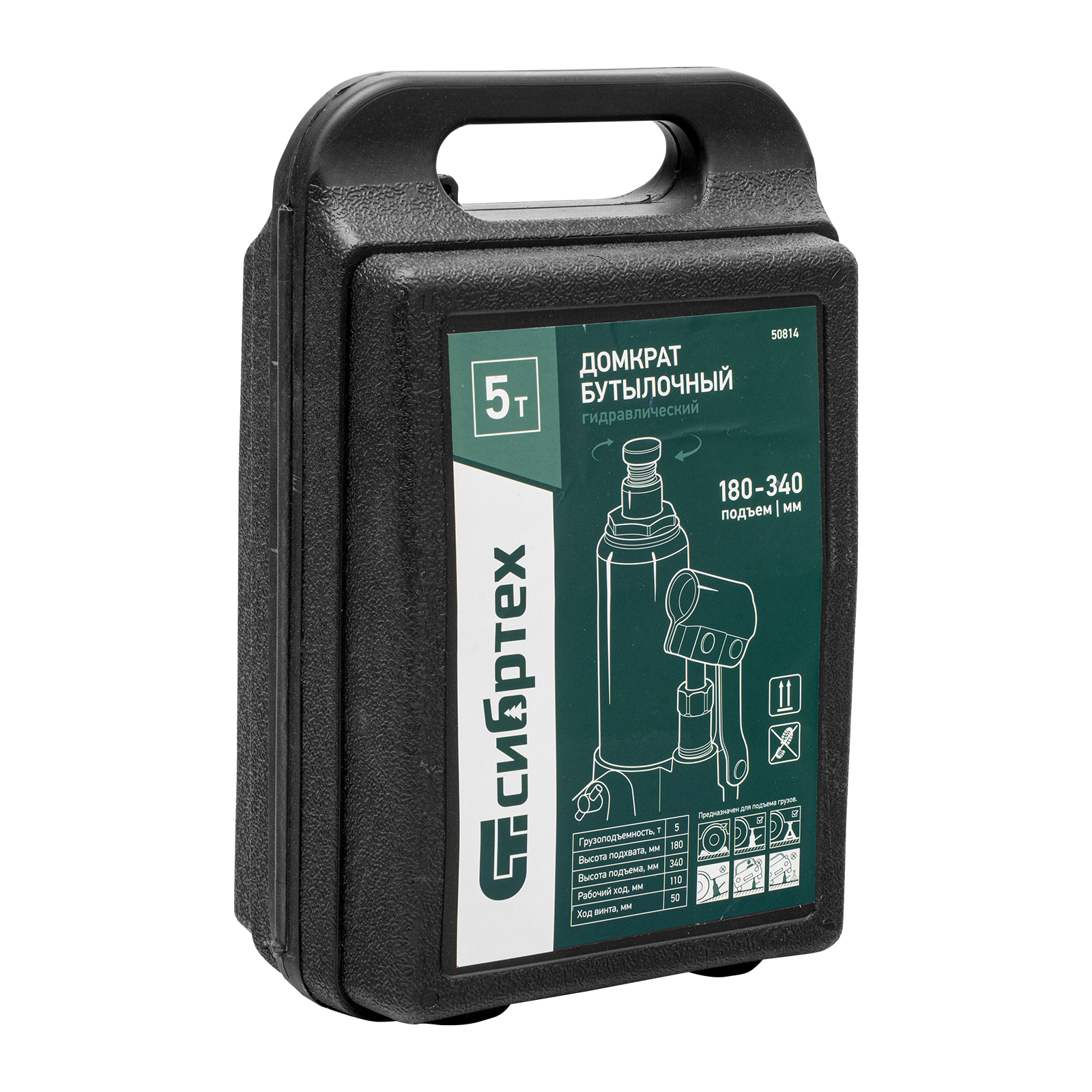 Домкрат гидравлический бутылочный Сибртех 50814, поставляющийся в пластиковом кейсе, предназначен для подъема грузов массой до 5 т на высоту от 180 до 340 мм. Не требует больших усилий от пользователя и значительно облегчает рабочий процесс. Домкрат будет полезен при проведении техобслуживания машины в автосервисе или гараже.