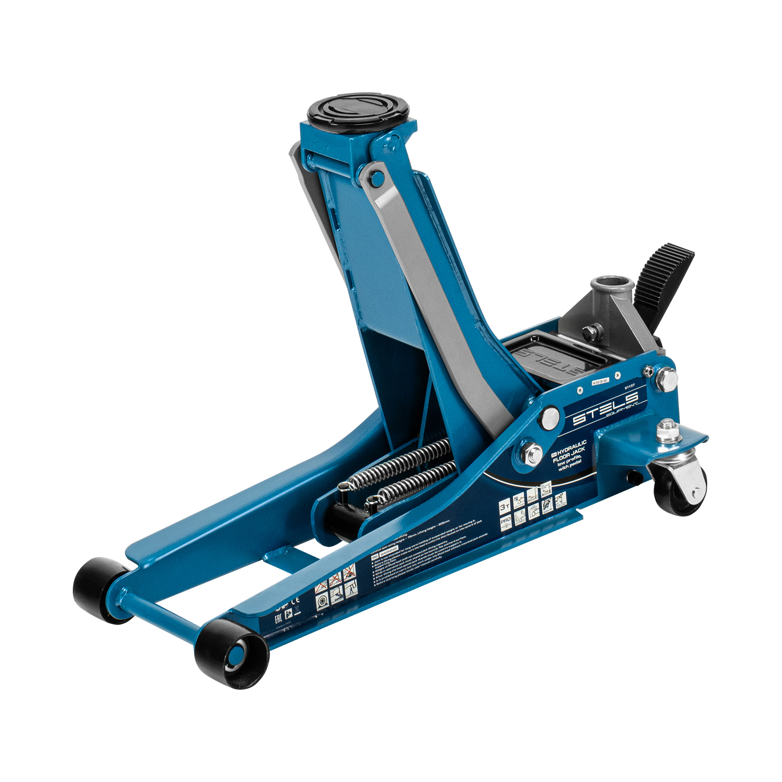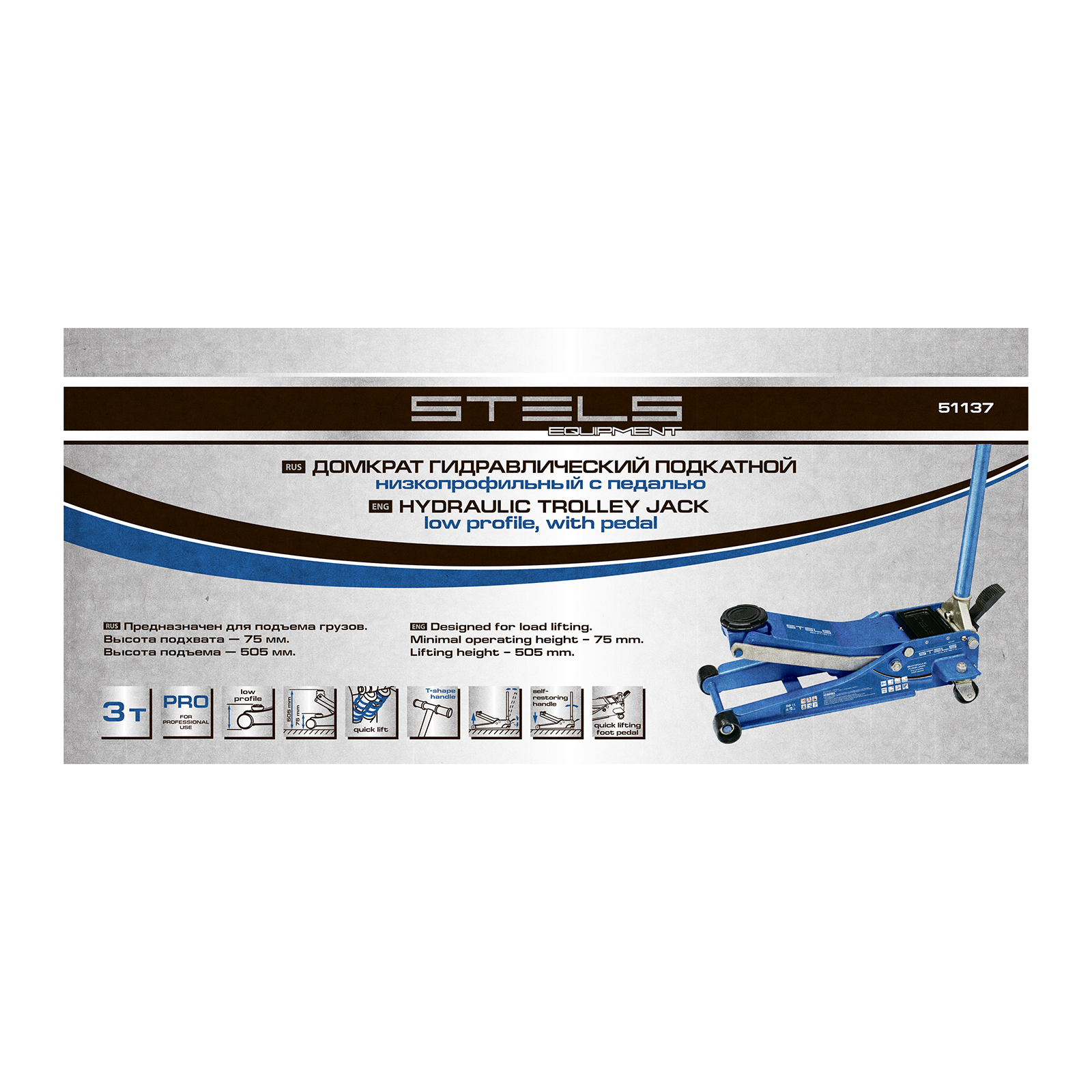 Гидравлический подкатной домкрат Stels QUICK LIFT 51137 с педалью и функцией быстрого подъема на высоту с 75 до 505 мм — эксклюзивная модель, разработанная для профессионального применения. Обладает сверхнизким подхватом 75 мм и поднимает груз до 3 тонн на высоту до 505 мм. Домкрат оснащен педалью, позволяющей быстро подвести опорную площадку к кузову автомашины. Система QUICK LIFT ускоряет поднятие автомобиля, а усиленная конструкция и инновационная система закрытия клапана в несколько раз повышают ресурс домкрата.