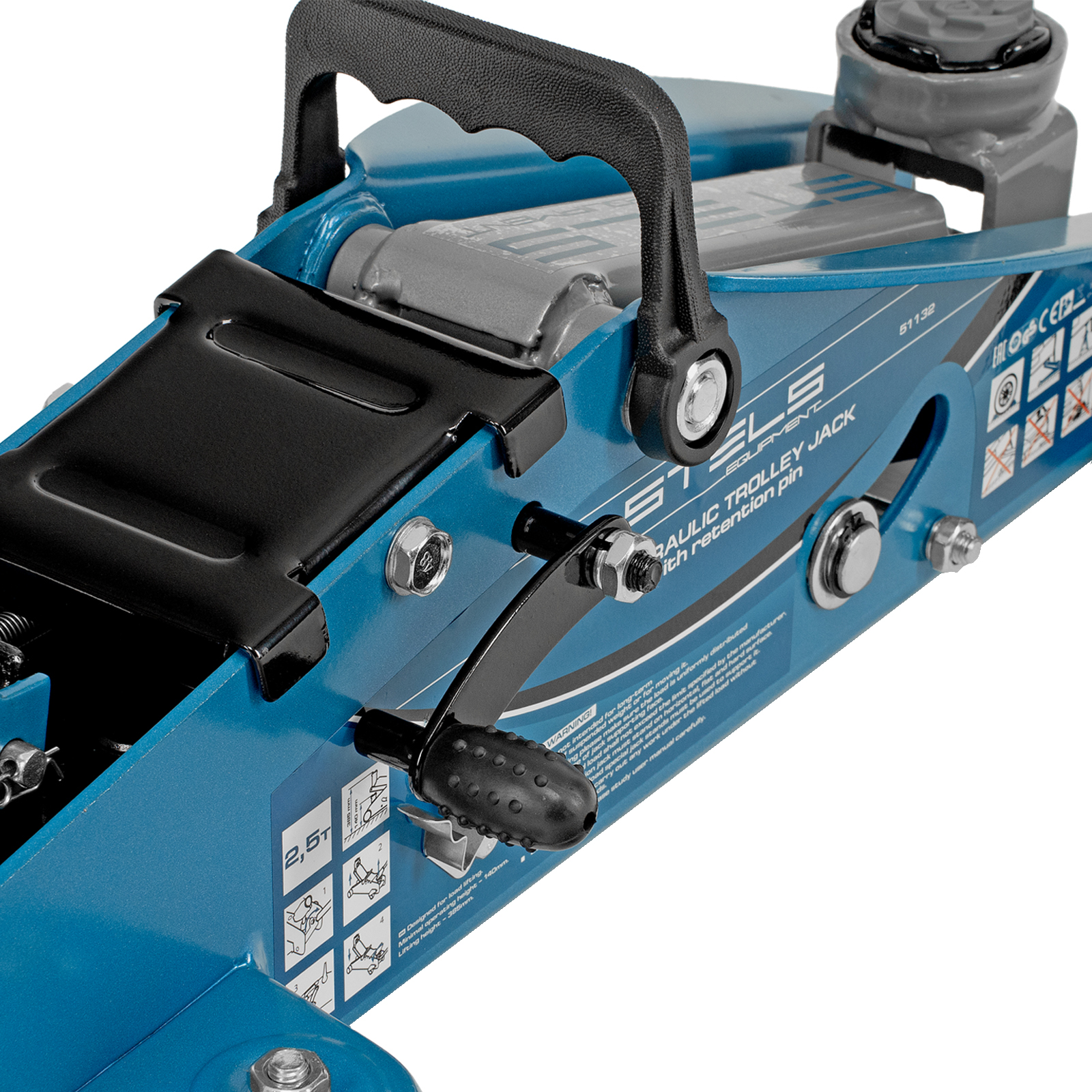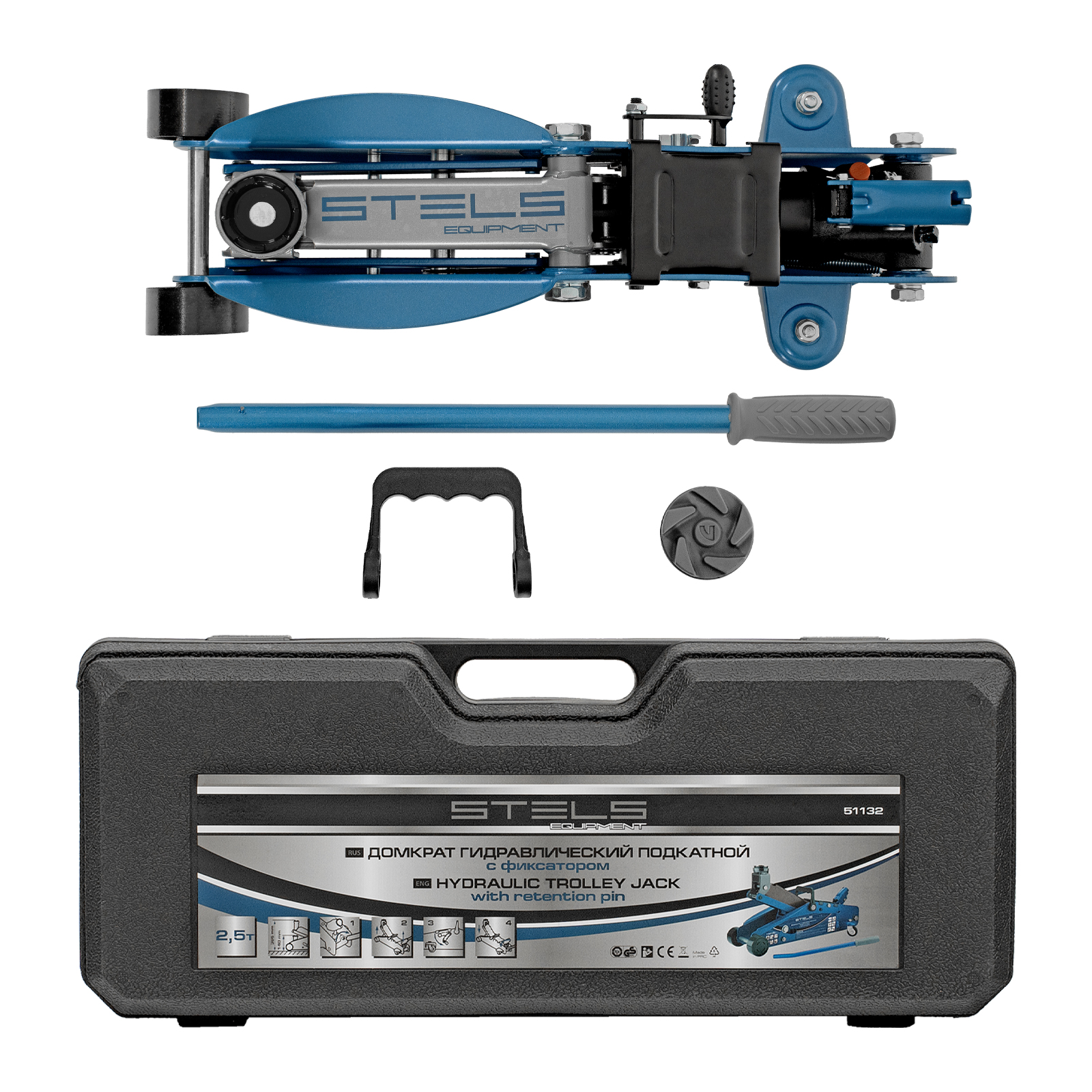 Подкатной гидравлический домкрат Stels Safety Pin 51132 с фиксатором, с высотой подхвата 140 мм, поставляющийся в кейсе, позволяет поднимать грузы весом до 2,5 т на высоту 385 мм. Используется для обслуживания автомобилей со стандартным дорожным просветом. Домкрат подходит для самостоятельного обслуживания авто.
