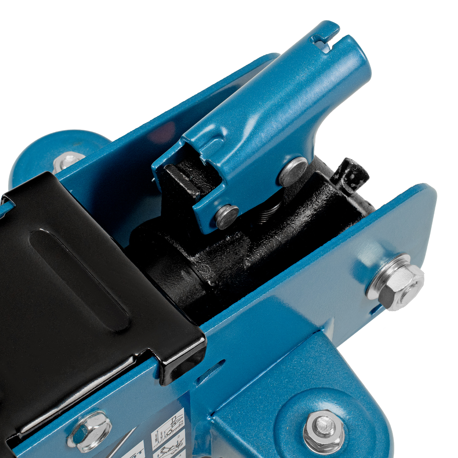- Эргономичность — рукоятка выполнена с подпальцевыми выемками, ее можно переставлять для удобного выкатывания и перемещения домкрата.