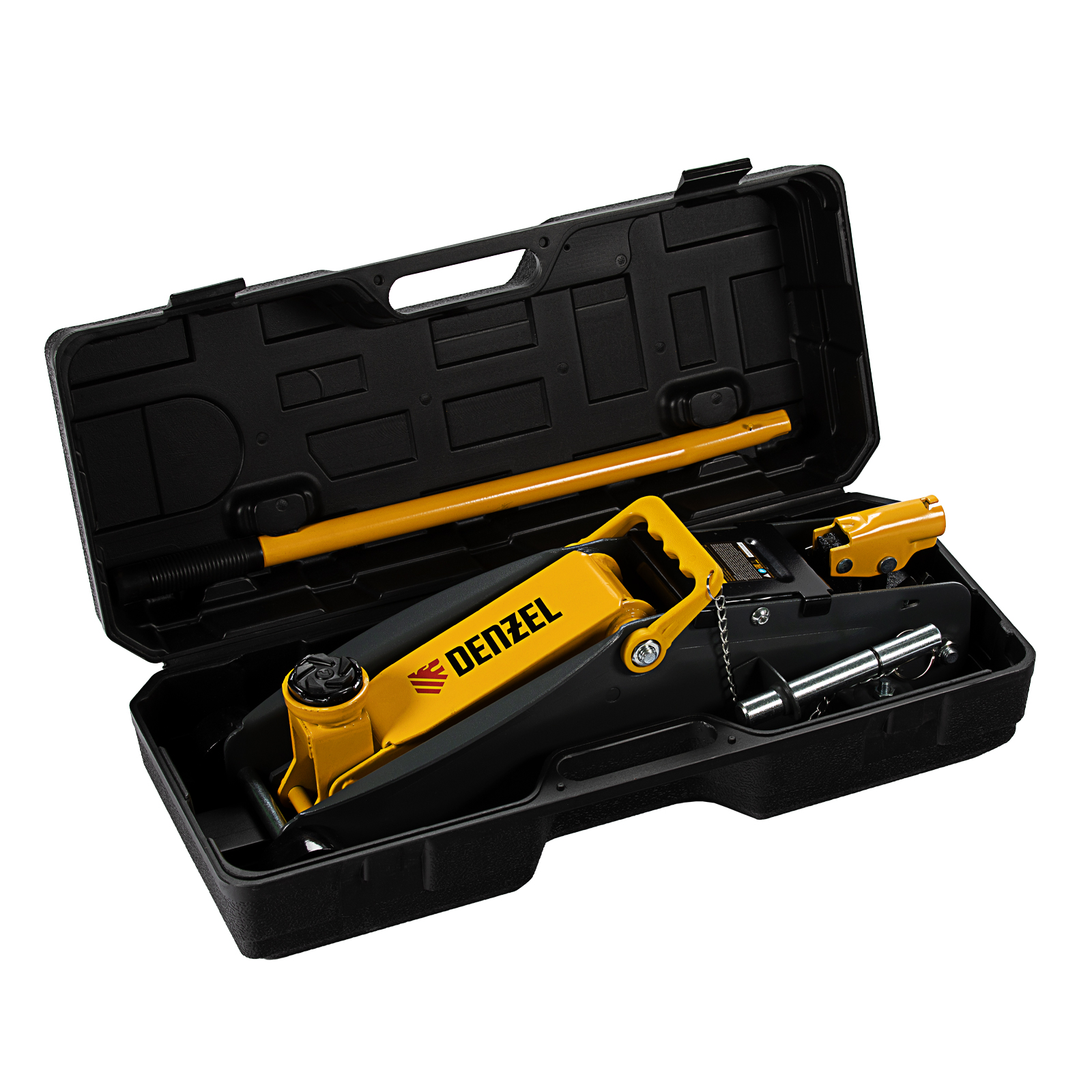 Домкрат гидравлический подкатной с фиксатором, 2,8 т, 135-385 мм, в кейсе Denzel