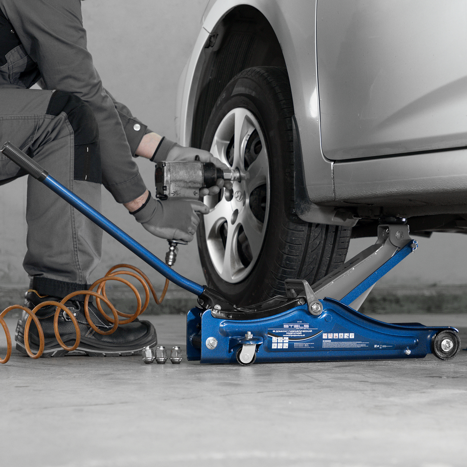 - Маневренность — благодаря поворотным колесам домкрат можно быстро подвести под груз.