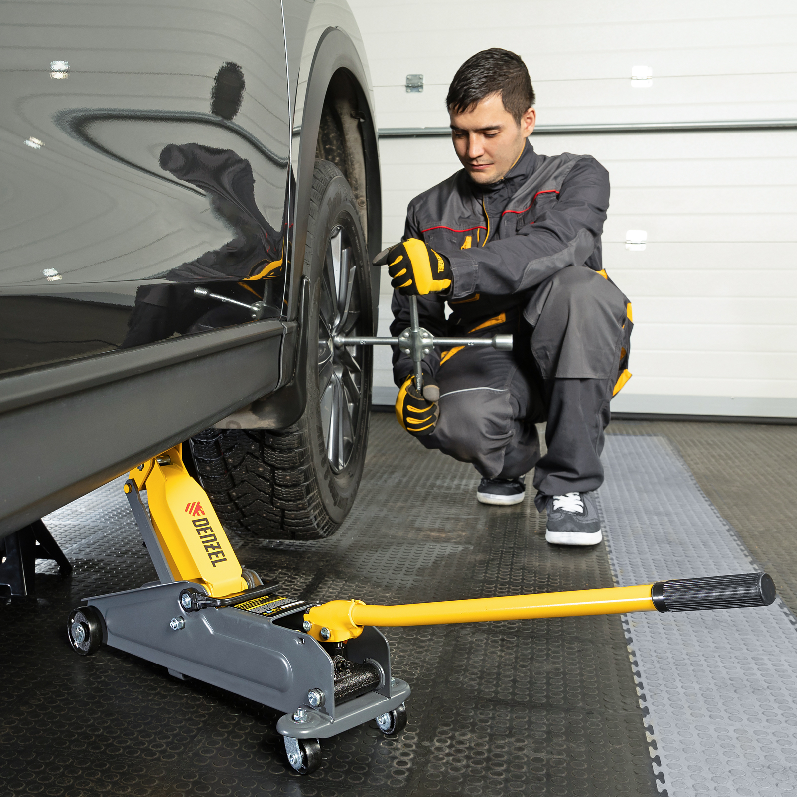 Гидравлический подкатной домкрат Denzel 51230 с высотой подхвата 135 мм предназначен для плавного подъема грузов массой до 2 т на высоту до 385 мм. Домкрат пригодится владельцам легковых автомобилей со стандартным клиренсом.