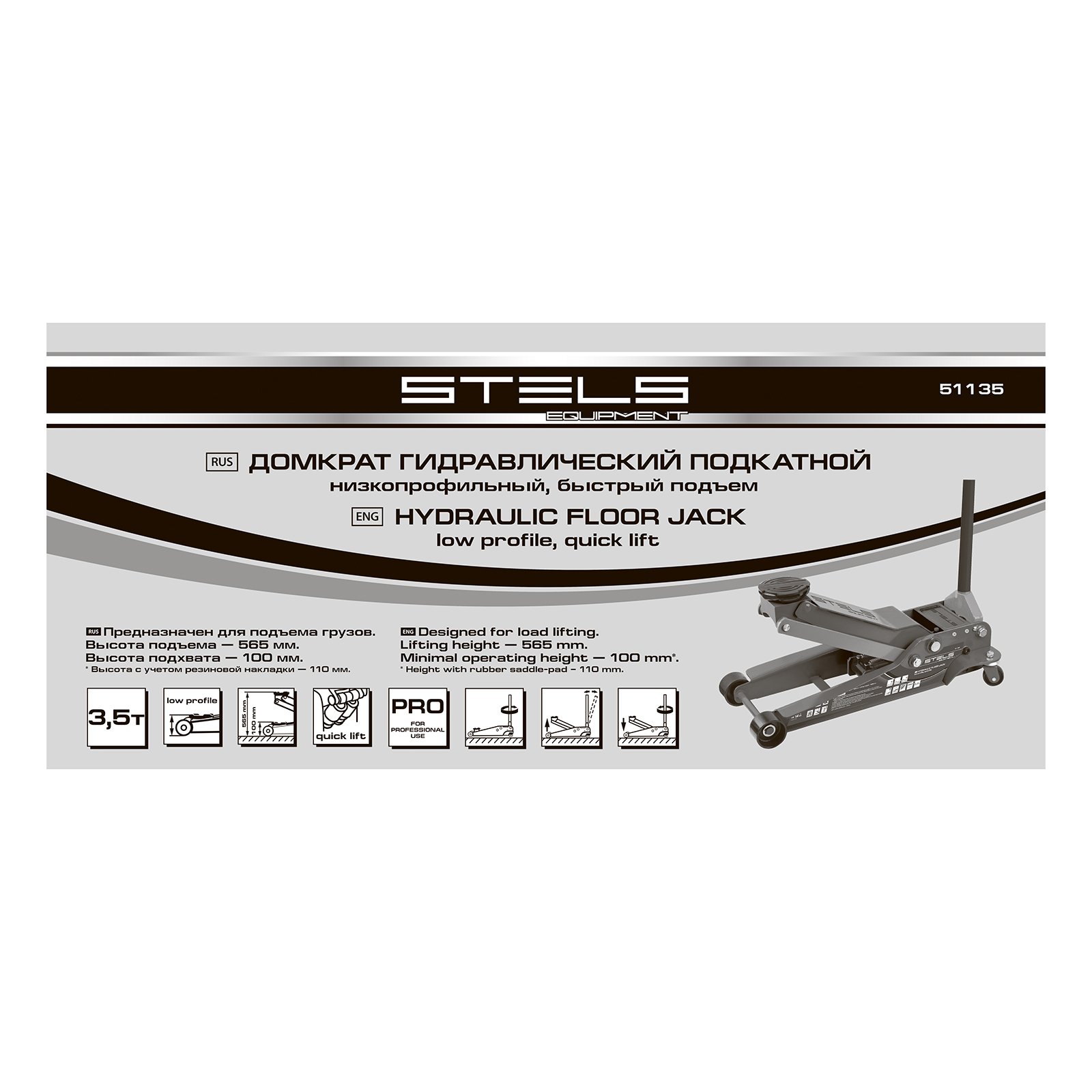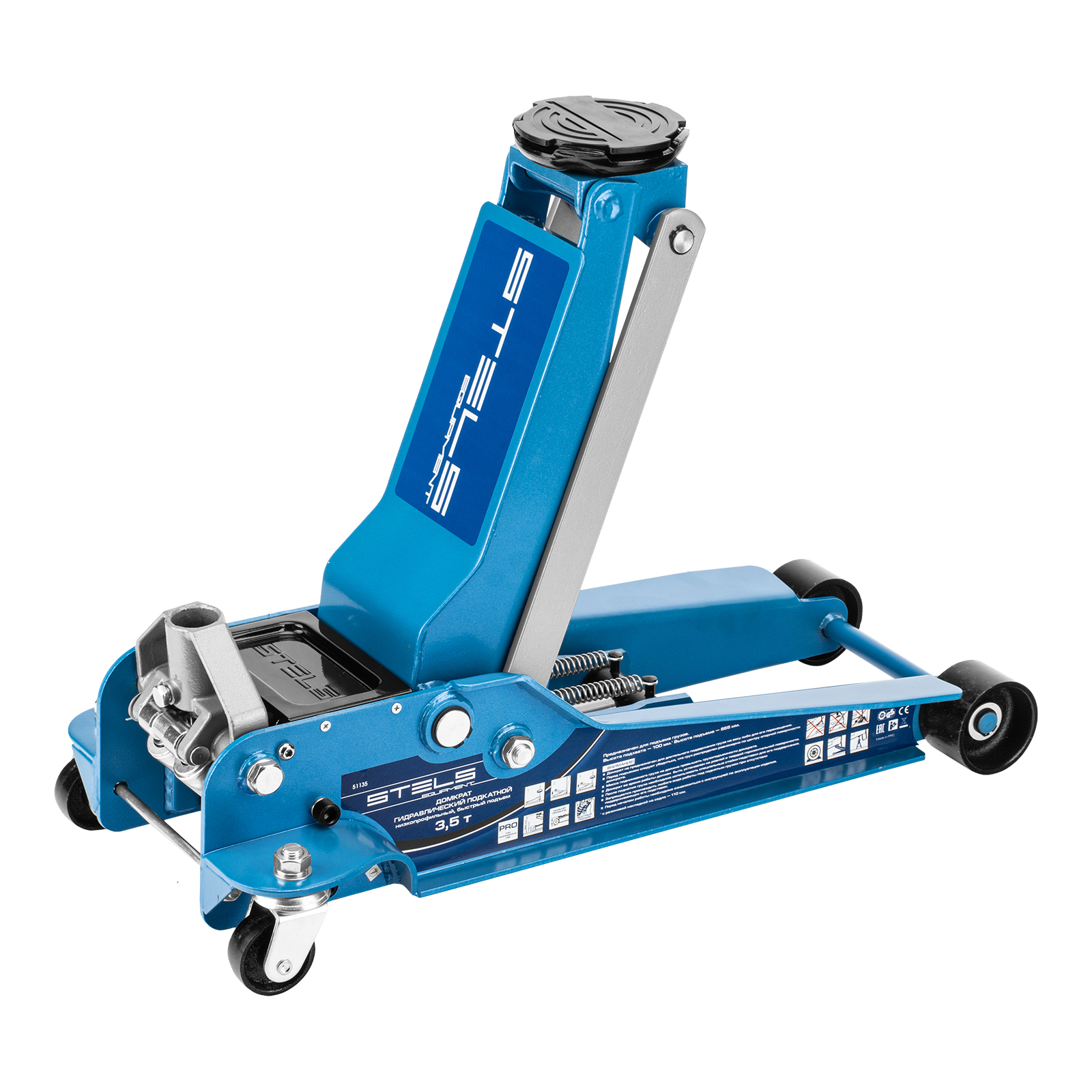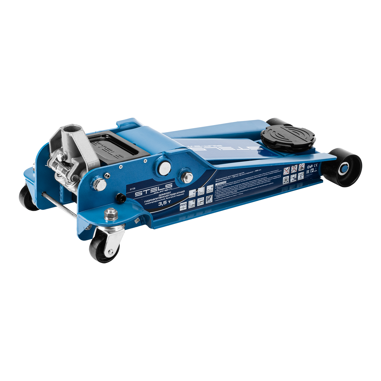 Профессиональный подкатной гидравлический домкрат Stels LOW PROFILE QUICK LIFT 51135 используется для быстрого подъема на высоту 100-565 мм всех типов автомобилей с низким клиренсом и массой до 3,5 тонн. Благодаря системе QUICK LIFT для достижения предельной высоты достаточно 10 качков рукоятки. Домкрат подходит для использования на станциях техобслуживания и шиномонтажа.