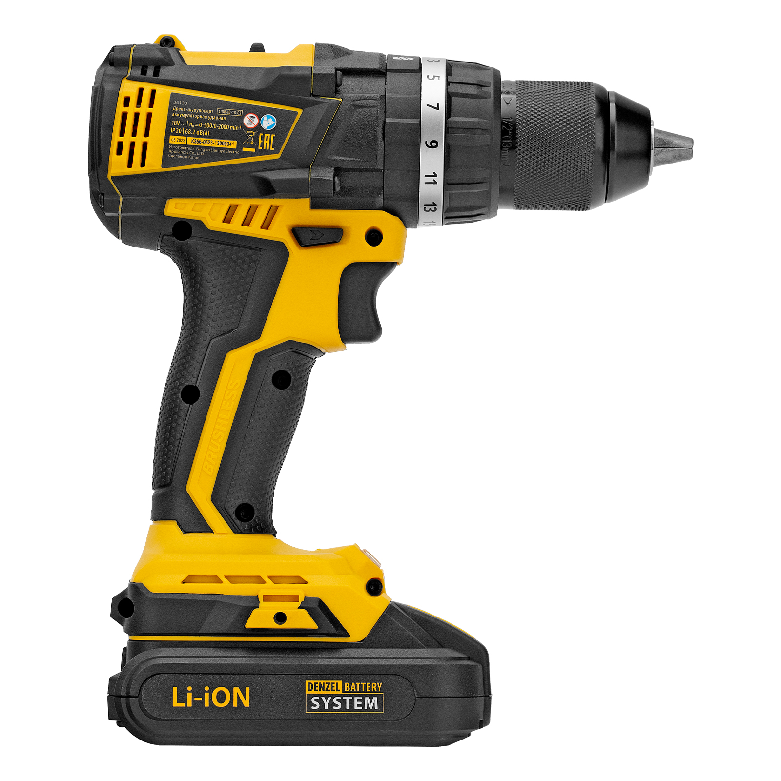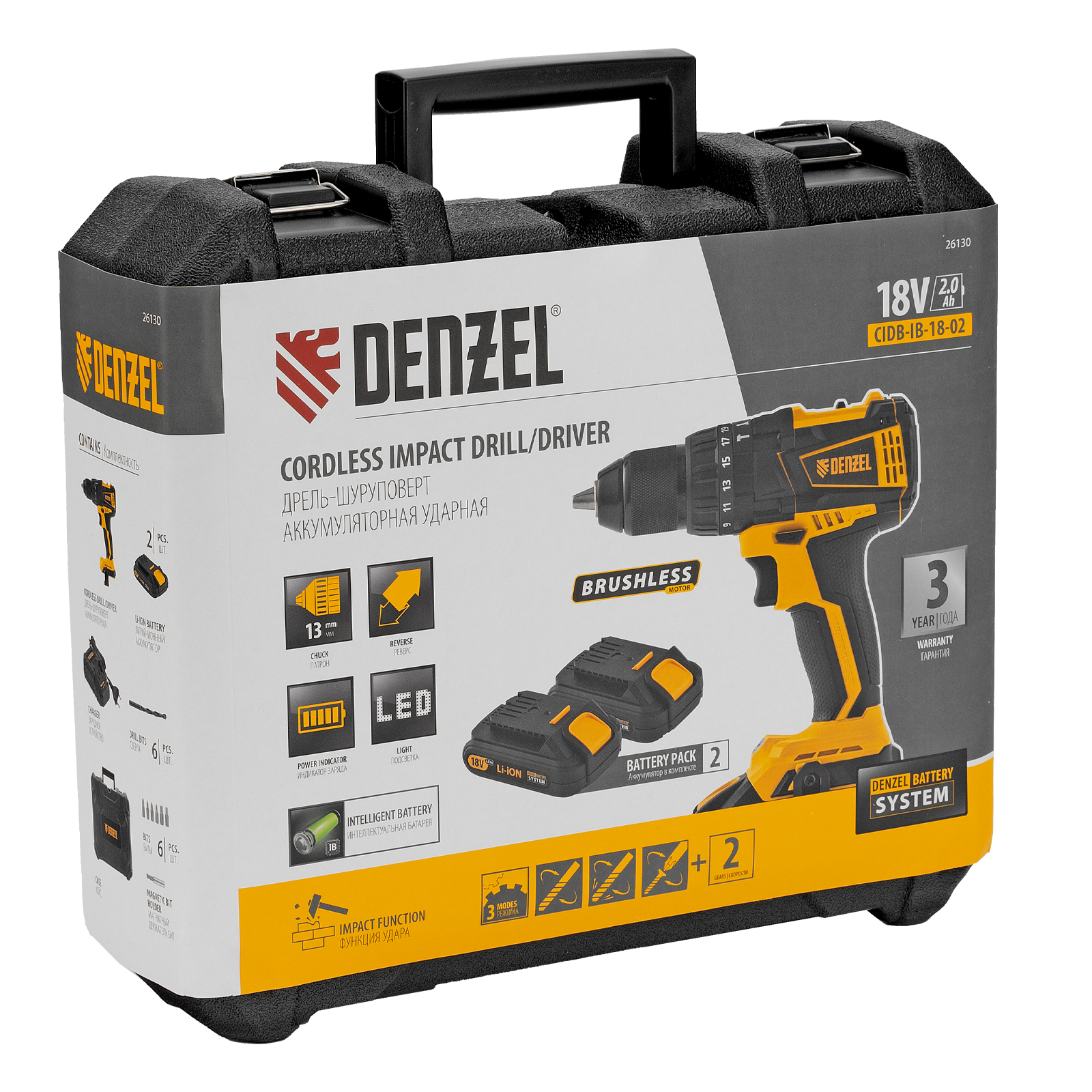 Дрель-шуруповерт аккумуляторная ударная бесщет CIDB-IB-18-02, Li-Ion, 18 В, 2 акк. Denzel