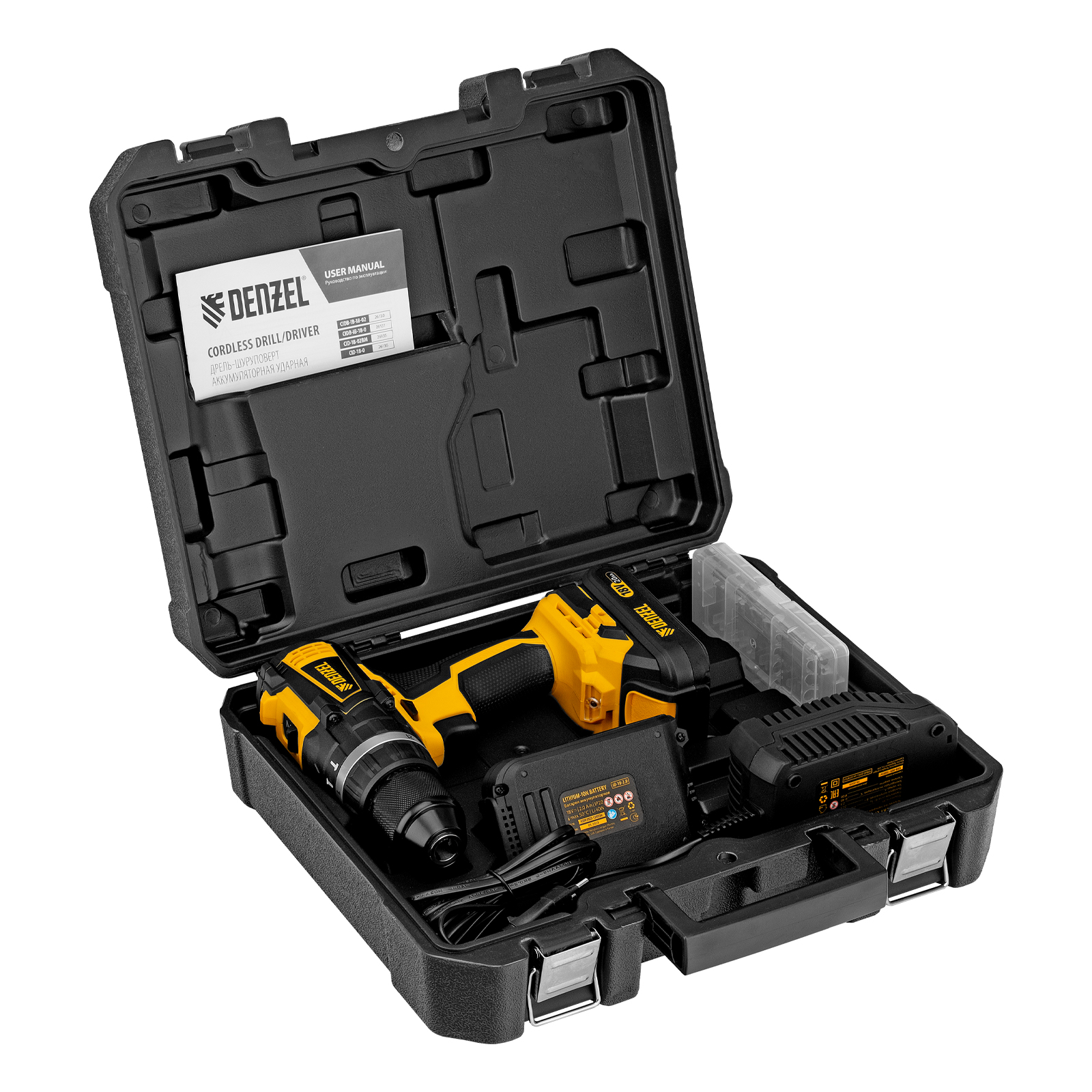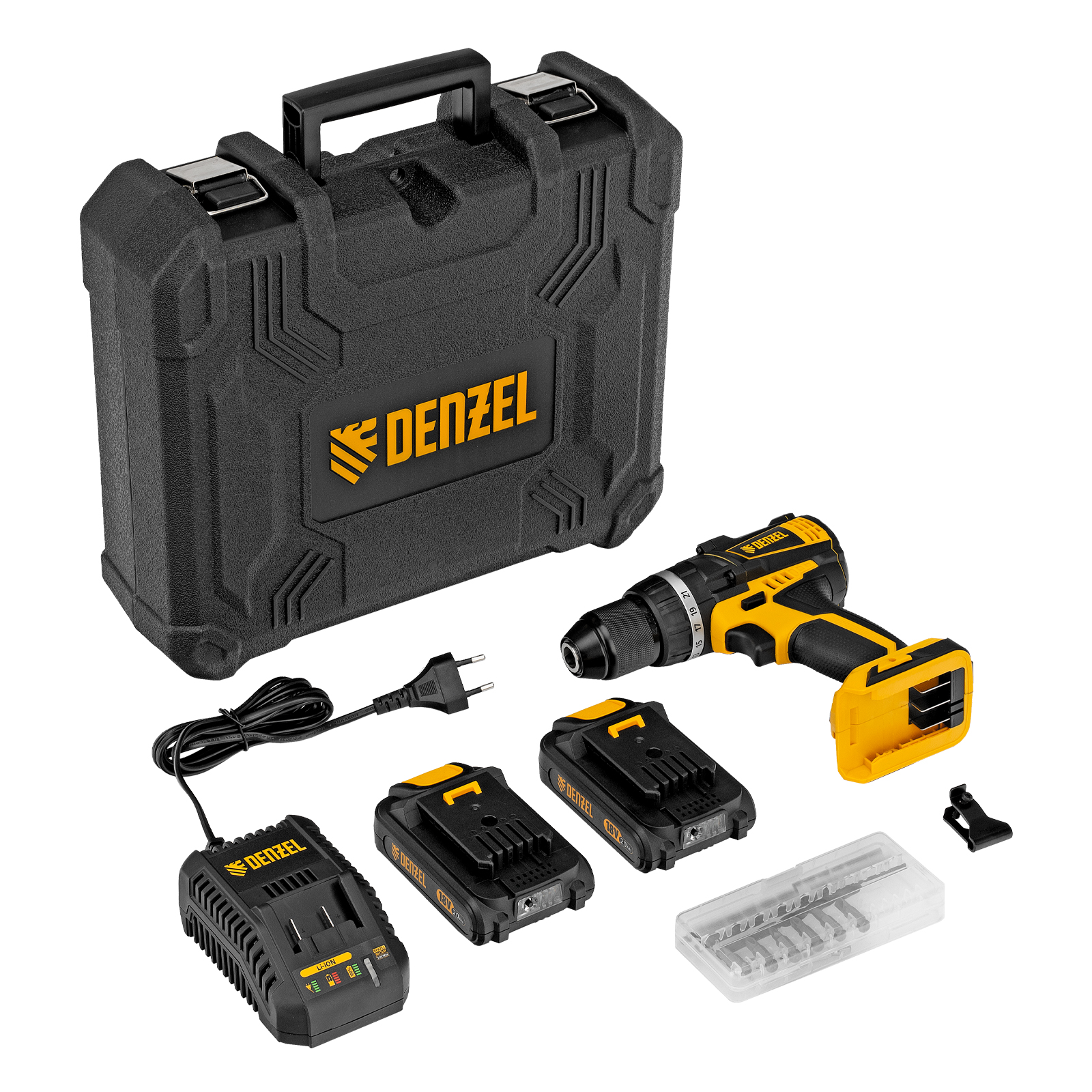 Дрель-шуруповерт аккумуляторная - 1 штБатарея аккумуляторная - 2 штУстройство зарядное - 1 штСверло спиральное по металлу - 6 штБита SL - 2 штБита PH - 2 штБита PZ - 2 штРуководство по эксплуатации с гарантийным талоном - 1 шт |