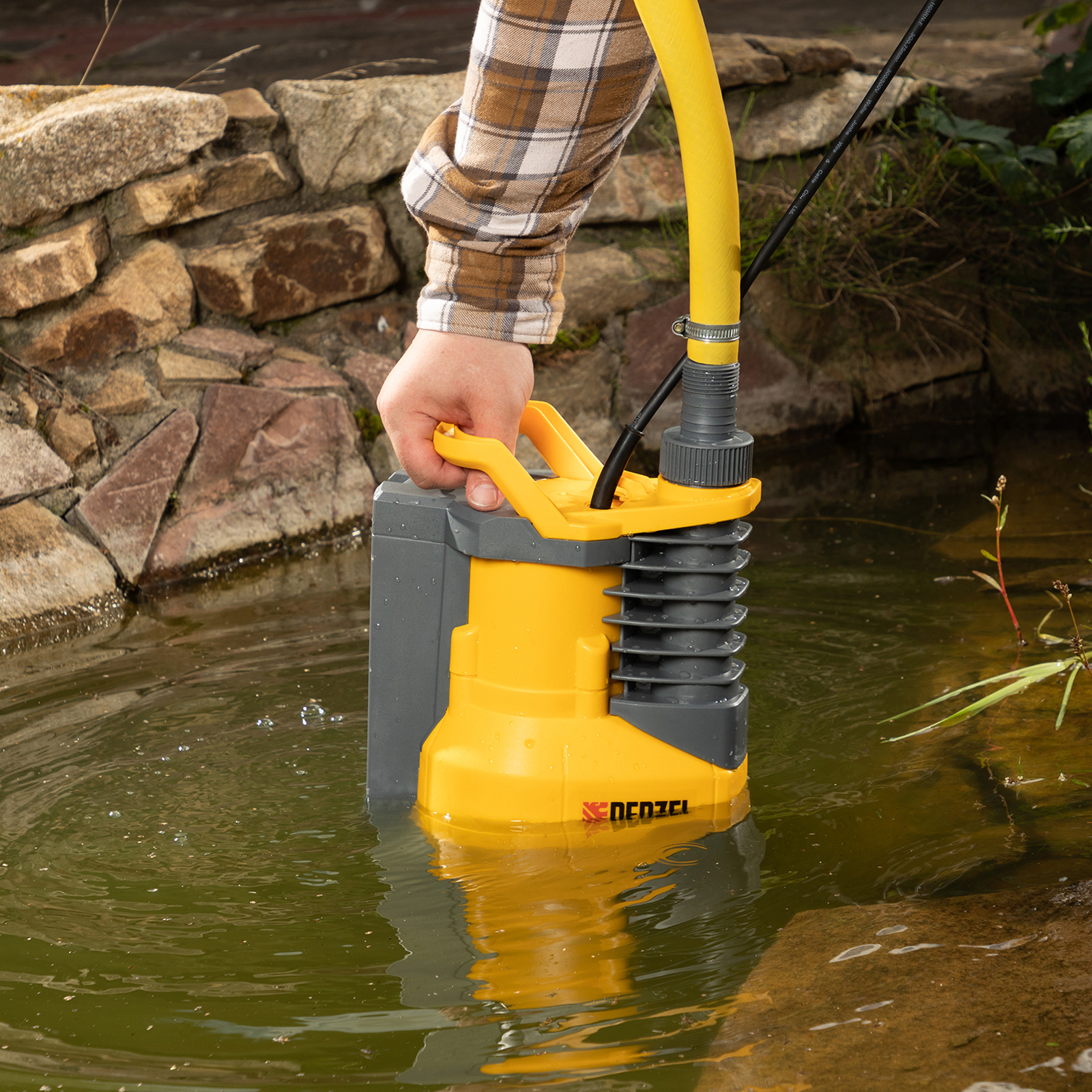 - Простой монтаж — насос опускается в вертикальном положении на глубину до 7 м с помощью троса.