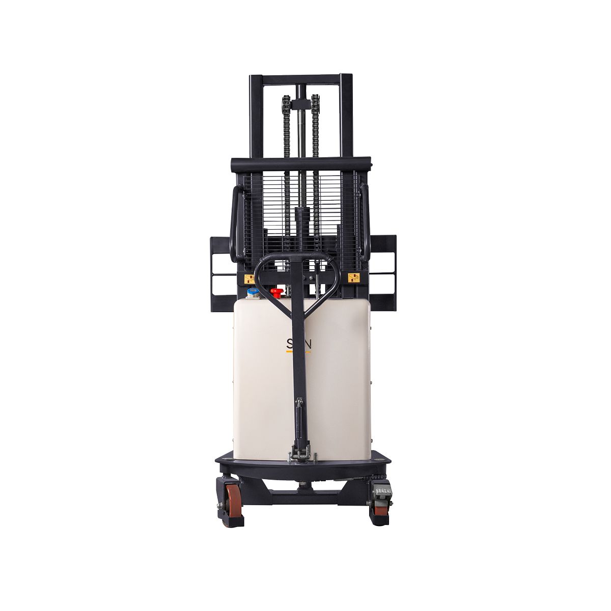 На штабелере установлен свинцово-кислотный аккумулятор ёмкостью 120 Ач. Штабелер оснащен надежным гидравлическим цилиндром. Прочные колеса из полиуретана обладают стойкостью к износу и обеспечивают плавный ход штабелера. Мачта с С-образным профилем оборудована дополнительными ребрами жесткости.