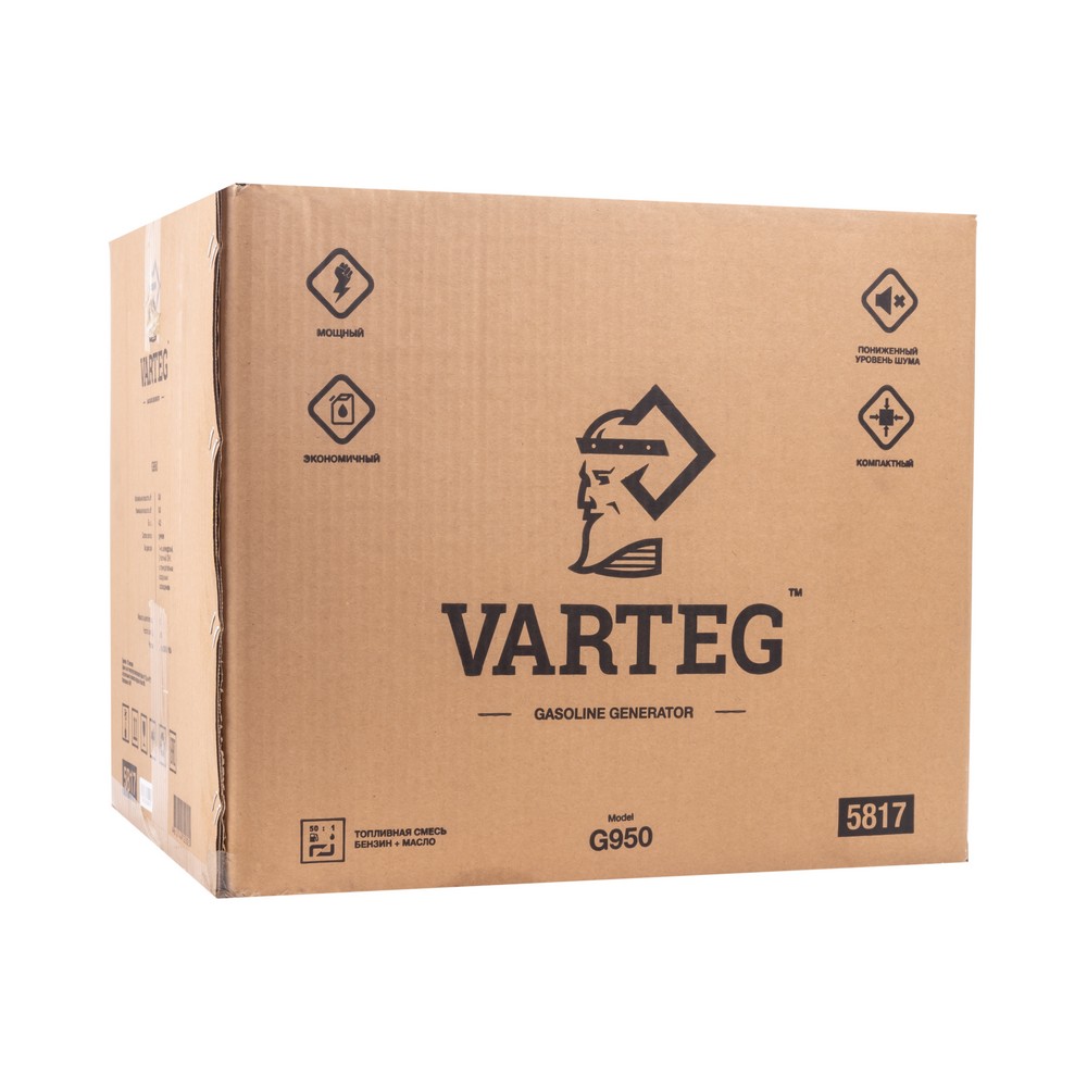 Бензиновый генератор Varteg G950 – компактный, лёгкий и простой в применении источник, предназначенный для обеспечения электричеством нетребовательных к пусковым токам электроприборов. Идеален для пикника, рыбалки, туризма и активного отдыха. 2х-тактный двигатель мощностью 2,4 л.с. с рабочим объёмом в 63 см³ работает на смеси 92-го бензина и масла для 2Т двигателей. Максимальная электрическая мощность генератора 8 кВт. Varteg G950 оснащён одной розеткой 230 В / 16 А и розеткой 12 В / 5 А, которая подойдет для зарядки АКБ. В комплекте поставки уже имеются соответствующие провода с клеммами.КОМПАКТНЫЙ: Компактный и эргономичный корпус с запатентованной компоновкой всех узлов внутри, технологичный двухтактный бензиновый двигатель – это одно из самых удобных решений для туризма, рыбалки, пикника и активного отдыха.НЕБОЛЬШОЙ ВЕС: Благодаря компактным габаритам и относительно небольшому весу (всего 15 кг) генератор идеально подходит для пикника, рыбалки, туризма и активного отдыха.ПОНИЖЕННЫЙ УРОВЕНЬ ШУМА: Благодаря улучшенной конфигурации глушителя генератор издаёт меньше шума, что обеспечивает комфорт в бытовых условиях использования.ЭКОНОМИЧНЫЙ: В зависимости от изменения мощности подсоединяемых потребителей происходит автоматическая регулировка оборотов двигателя, что позволяет экономить топливо и продлевает срок службы генератора.ПРЕИМУЩЕСТВА:Антикоррозийная обработка рамы и корпусных элементовНадёжный 2-х тактный бензиновый двигатель OHVАвтомат защиты на линию 230В / 16АДатчик аварийного уровня маслаСтрелочный вольтметрЗащита от перегрузокВибропоглощающие ножкиРучка для переноски в комплектеРозетка 16 А с защитой от детейДополнительный выход 12 ВКОМПЛЕКТАЦИЯ: Бензиновый генератор Varteg G950 – 1 шт.; ЕВРО вилки 230 В / 16 А – 1 шт.; Отвёртка (+/-) – 1 шт.; Провода с клеммами для зарядки 12 В АКБ – 1 шт.; Свечной ключ – 1 шт.; Ручка для переноски – 1 шт.; Инструкция по эксплуатации + Гарантийный талон – 1 компл.*Производитель оставляет за собой право менять комплектацию оборудования.