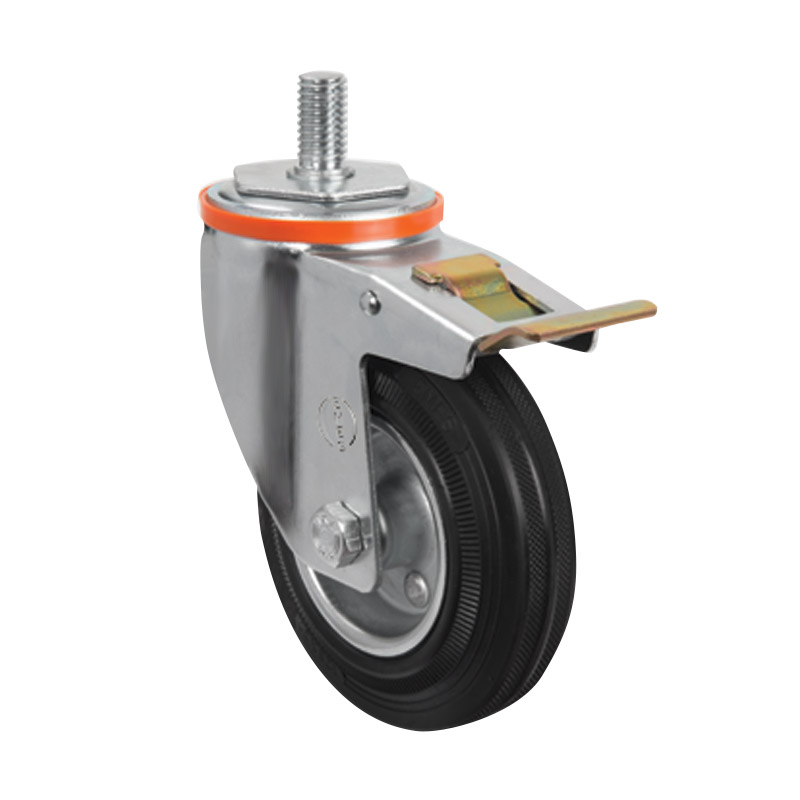 Грузоподъемность данного промышленного колеса составляет 130 кг, диаметр — 150 мм. Контактный слой изготовлен из литой черной резины, обод и кронштейн — из оцинкованной стали. Роликовый подшипник в оси обладает высокой стойкостью к радиальным нагрузкам. Модель подходит для установки на различное складское и строительное оборудование, контейнеры ТБО, может использоваться на поверхностях с уклонами и неровностями, во влажной среде.