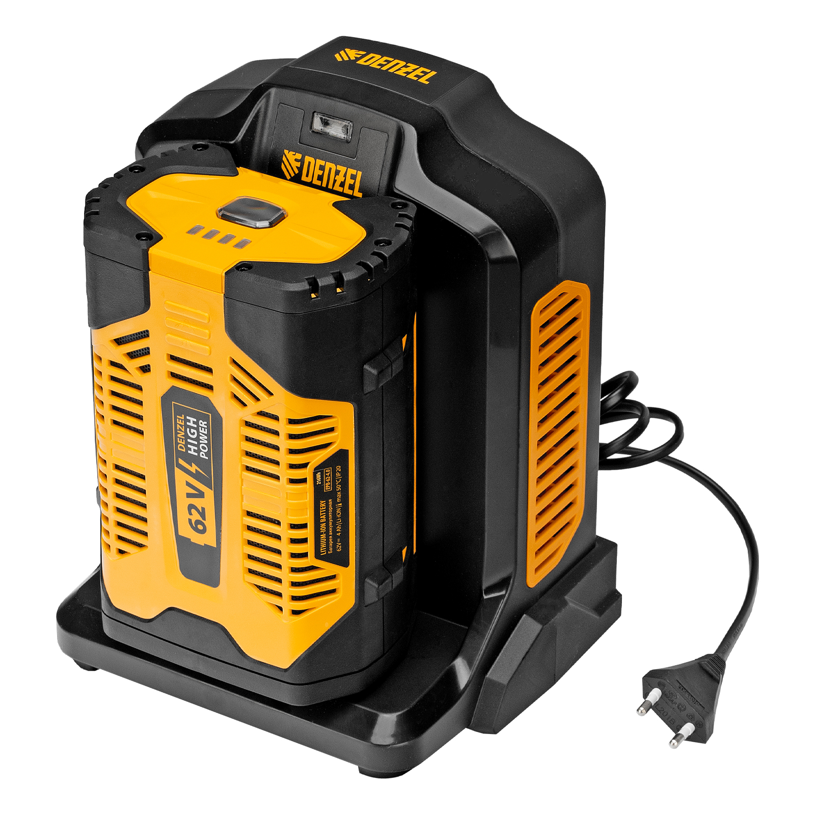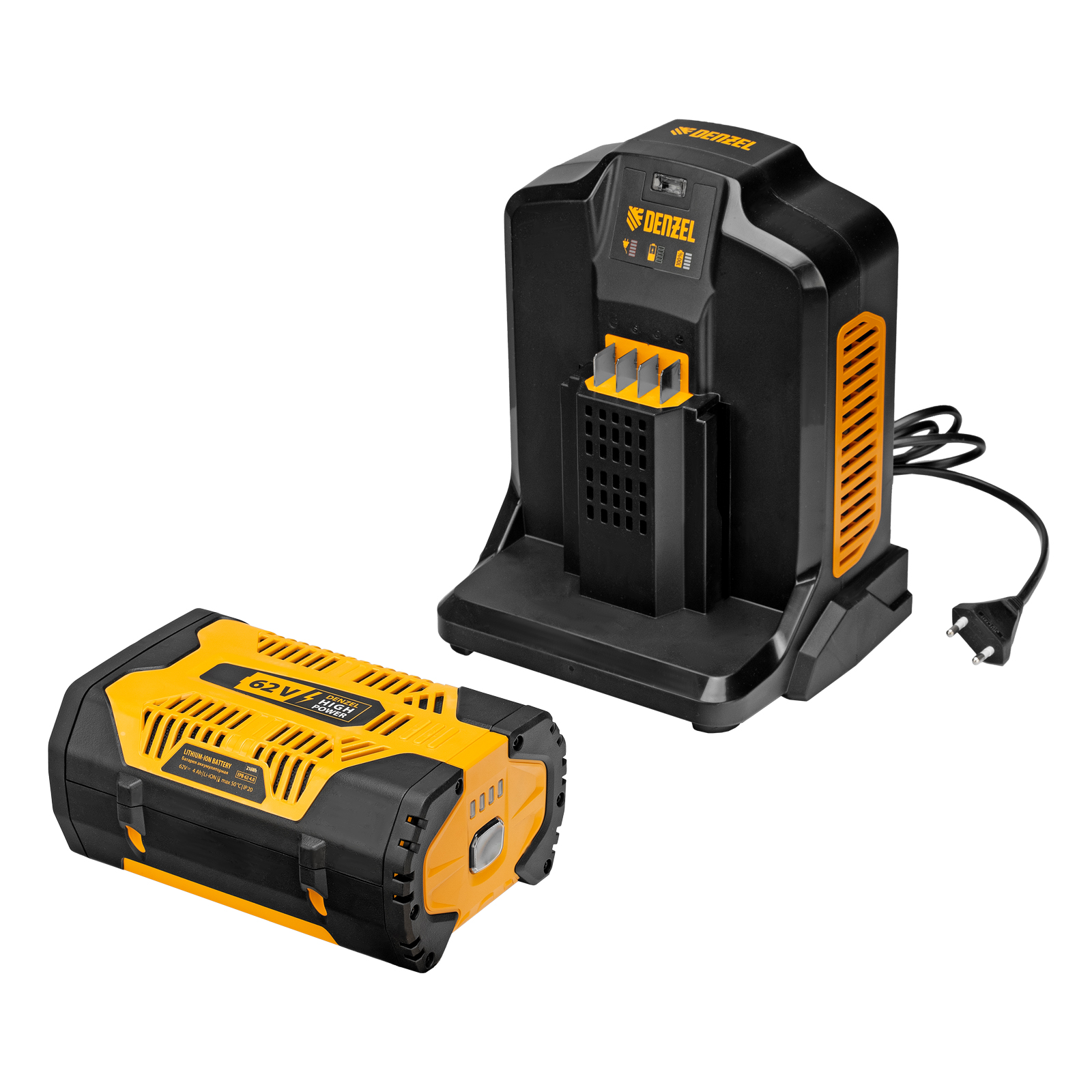 - Универсальность — аккумулятор подходит к любому инструменту, работающему на платформе Denzel High Power 62V.