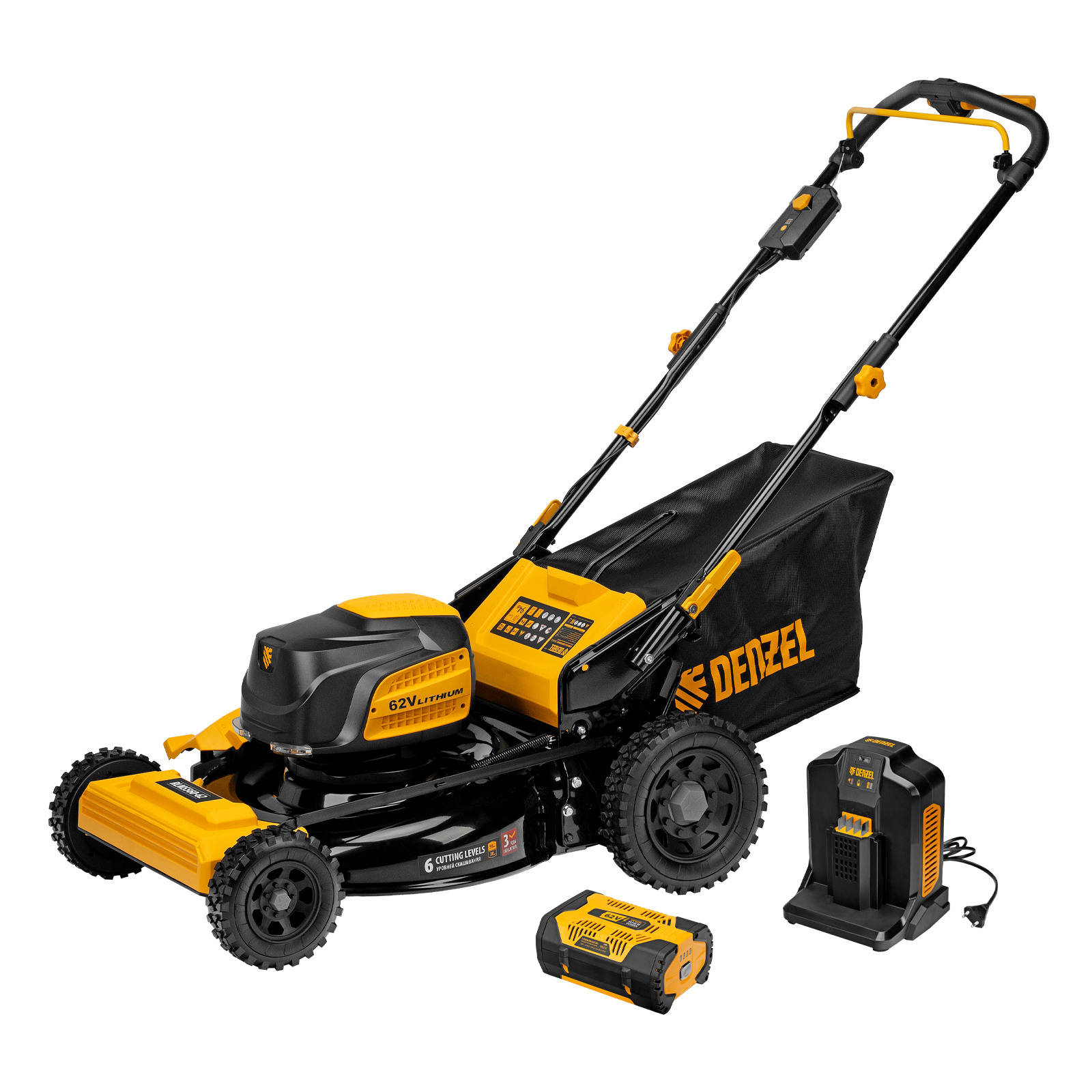 Газонокосилка в сборе с ножом и колесами - 1 штТравосборник - 1 штДефлектор бокового выброса - 1 штАккумуляторная батарея Li-Ion 62 В, 4 Ач - 1 штЗарядное устройство - 1 штРуководство по эксплуатации с гарантийным талоном - 1 шт |