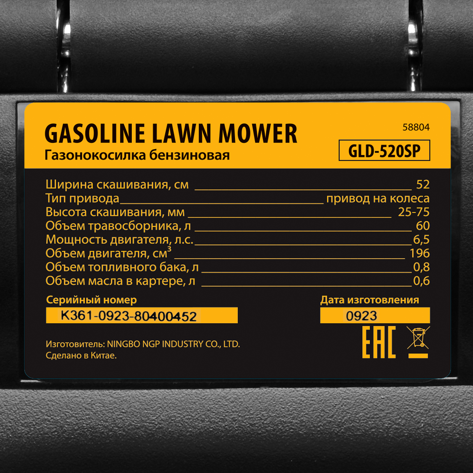Газонокосилка бензиновая GLD-520SP, 196 куб.см, ширина 52 см, привод, 7 уровней,травосборник 60 л Denzel