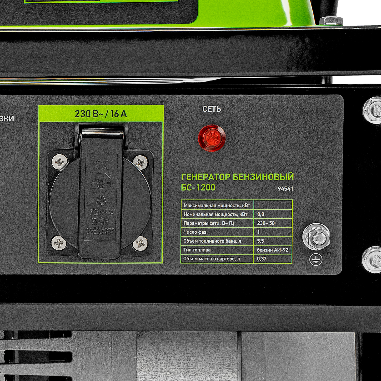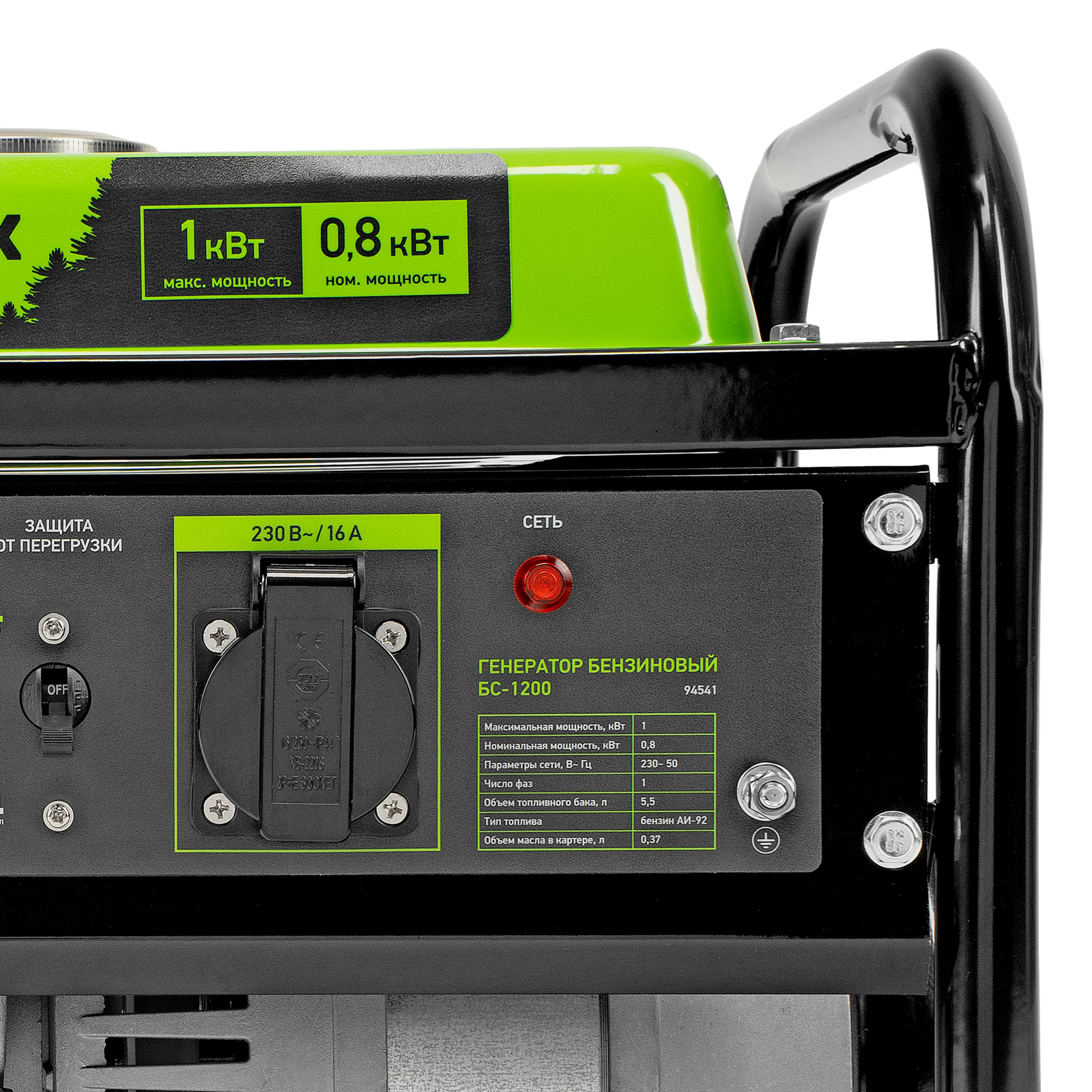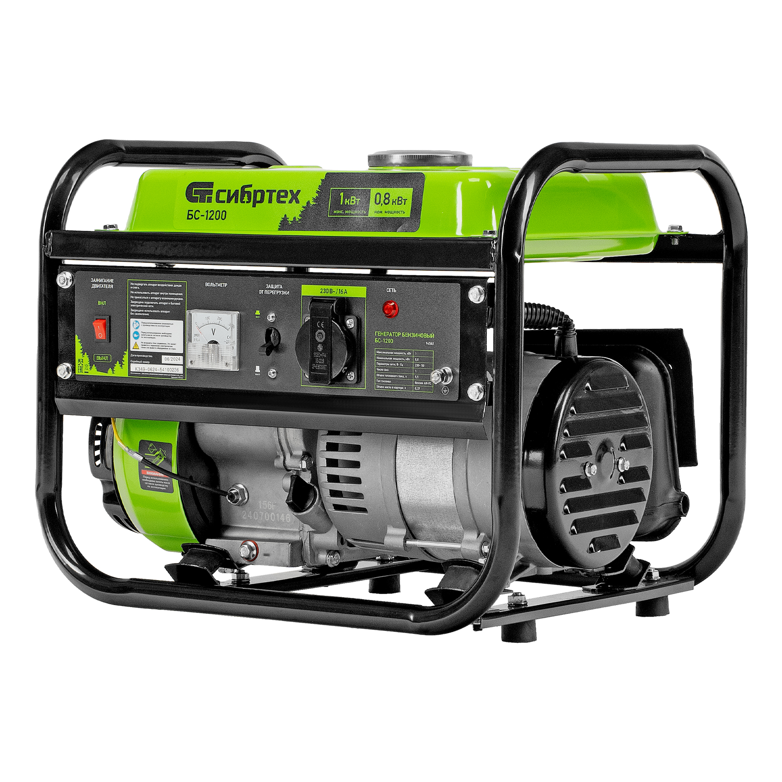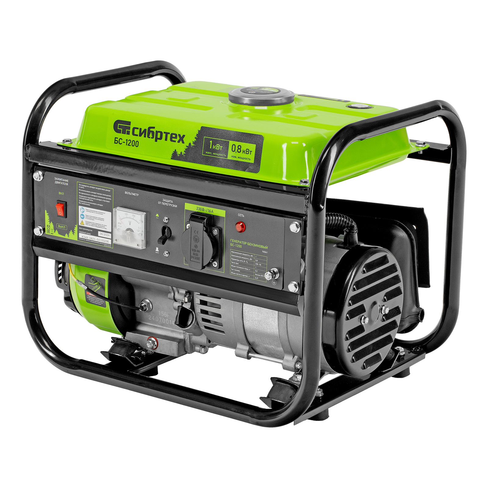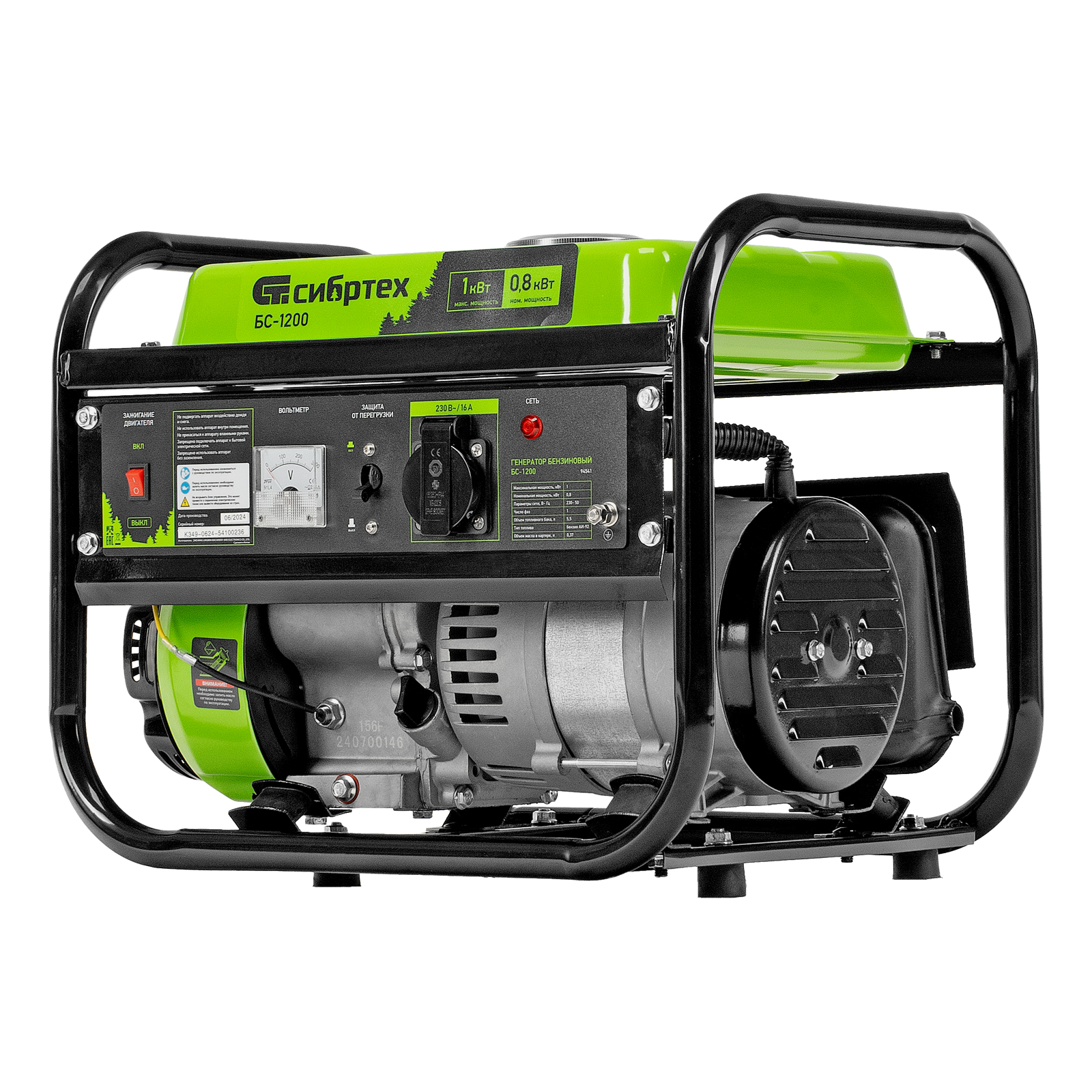 Бензиновый генератор Сибртех БС-1200 94541 на 230 В, максимальной мощностью 1 кВт, с 4-тактным двигателем, с баком на 5,5 л и ручным стартером, может использоваться в качестве простой резервной системы электроснабжения на природе, в мастерской или на даче. Вырабатываемой мощности в 800 Вт хватит для одновременного обеспечения электричеством 4 ламп накаливания, компьютера и роутера. Также возможно подключение одного инструмента с высоким пусковым током (не превышающим 1000 Вт), такого как дрель, перфоратор, углошлифовальная машина.