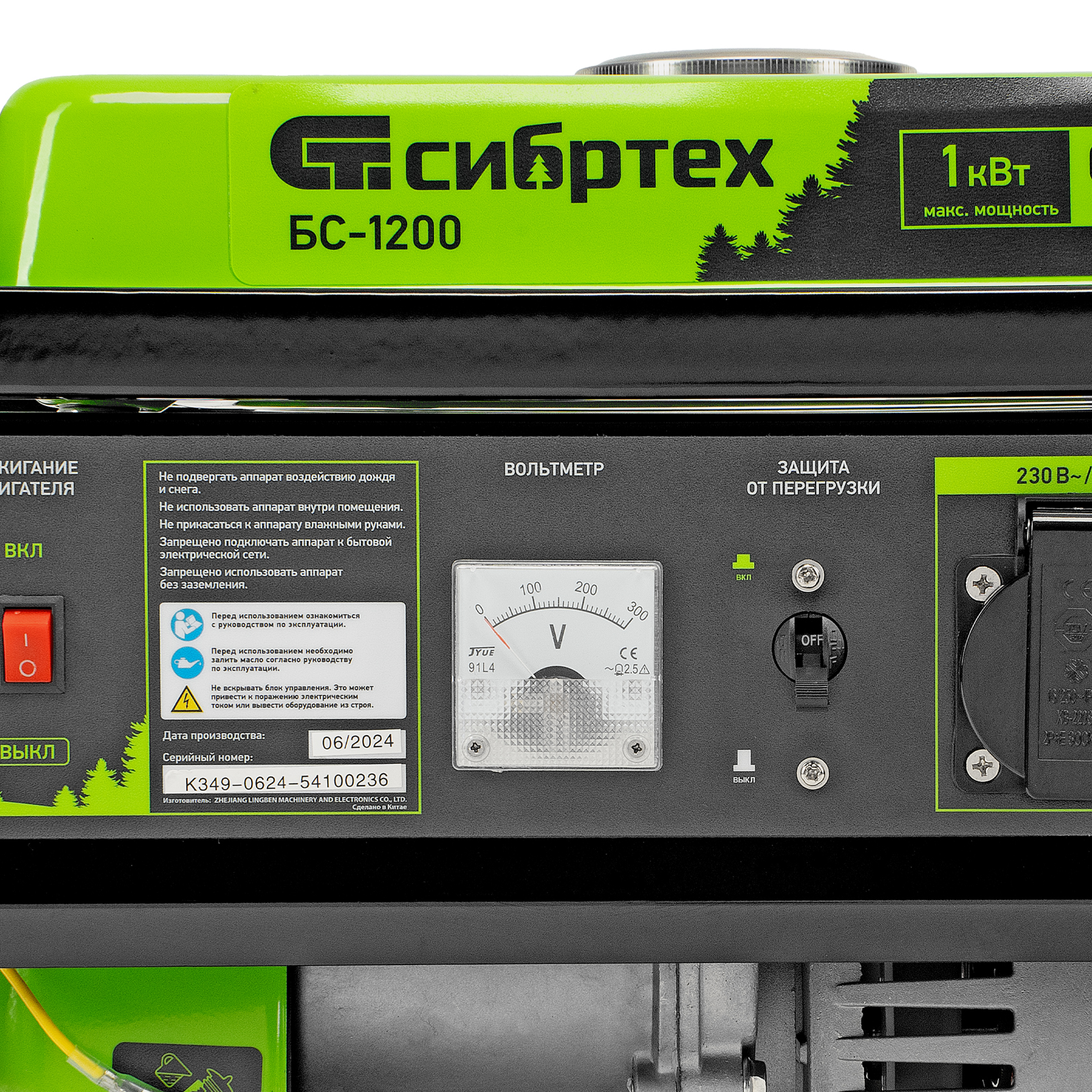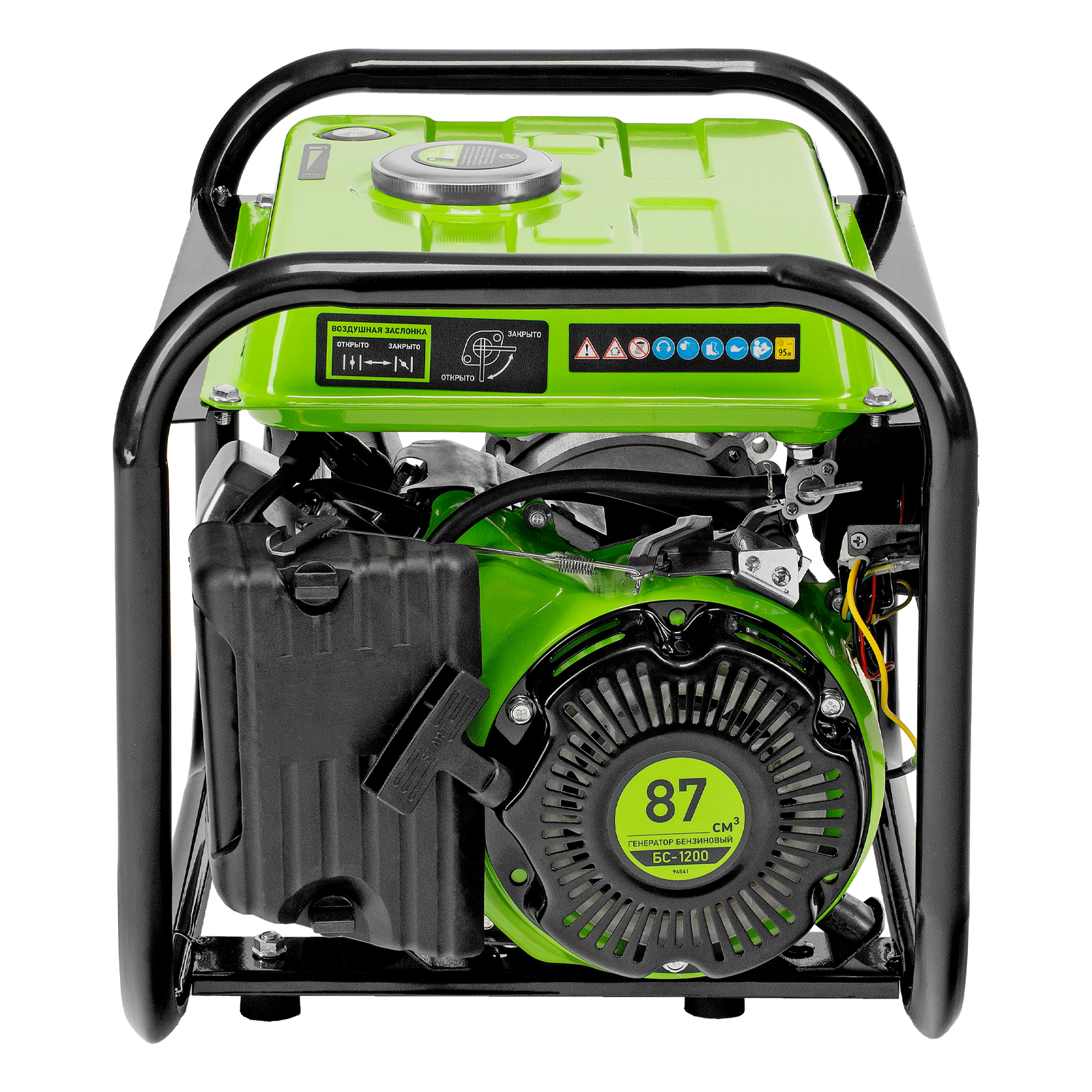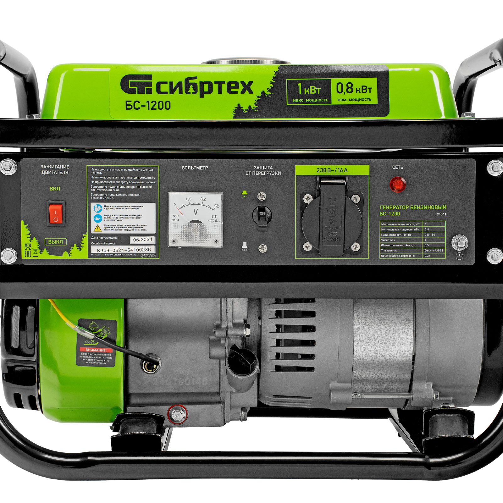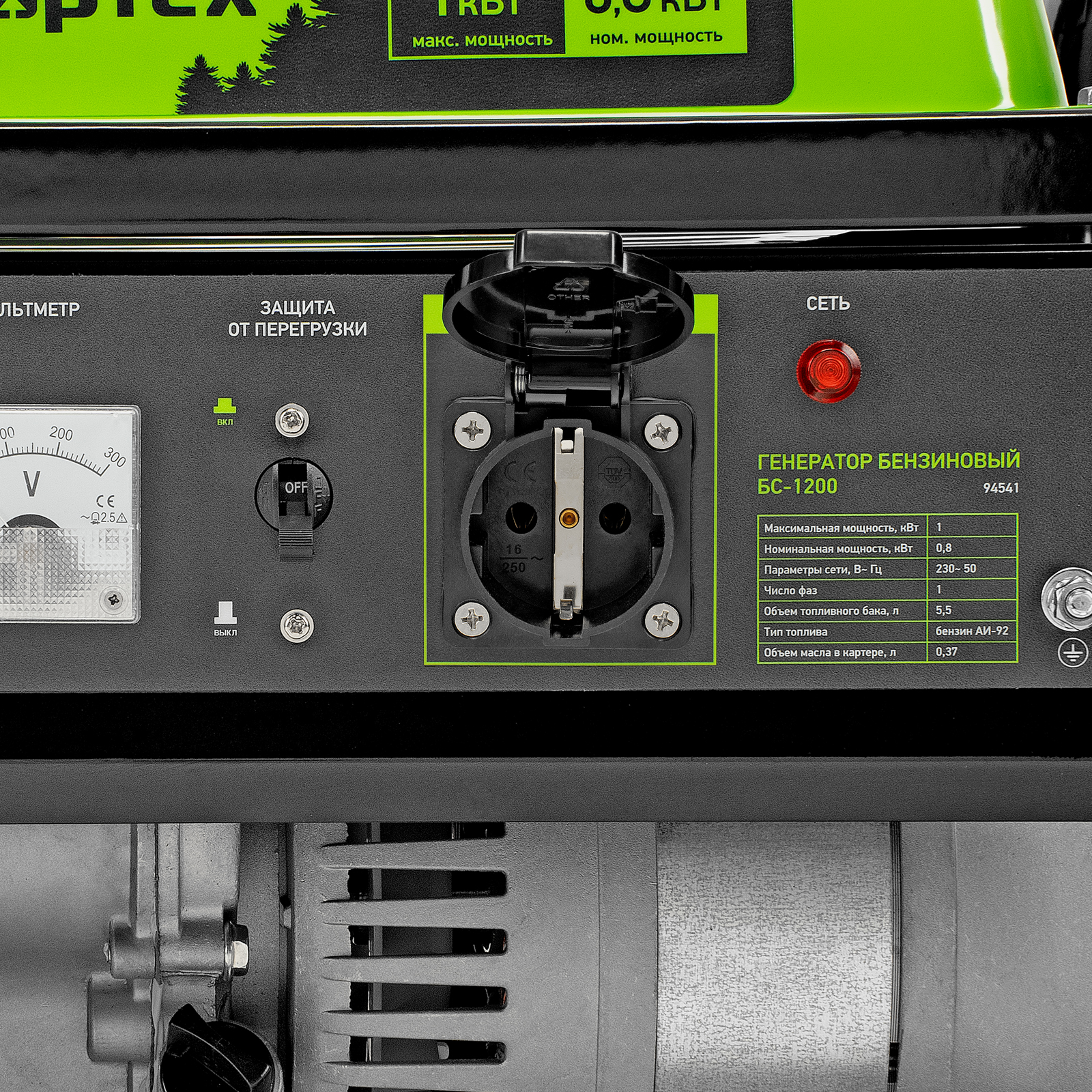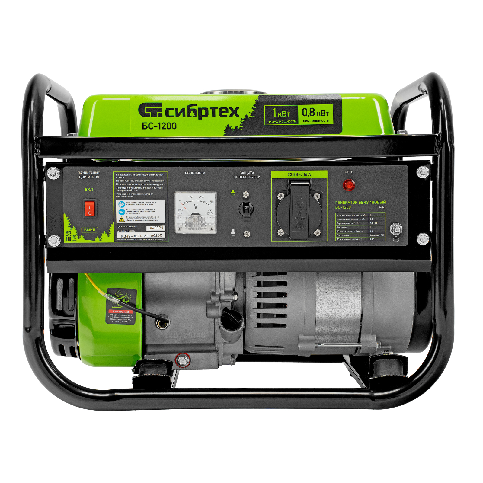 Бензиновый генератор Сибртех БС-1200 94541 на 230 В, максимальной мощностью 1 кВт, с 4-тактным двигателем, с баком на 5,5 л и ручным стартером, может использоваться в качестве простой резервной системы электроснабжения на природе, в мастерской или на даче. Вырабатываемой мощности в 800 Вт хватит для одновременного обеспечения электричеством 4 ламп накаливания, компьютера и роутера. Также возможно подключение одного инструмента с высоким пусковым током (не превышающим 1000 Вт), такого как дрель, перфоратор, углошлифовальная машина.