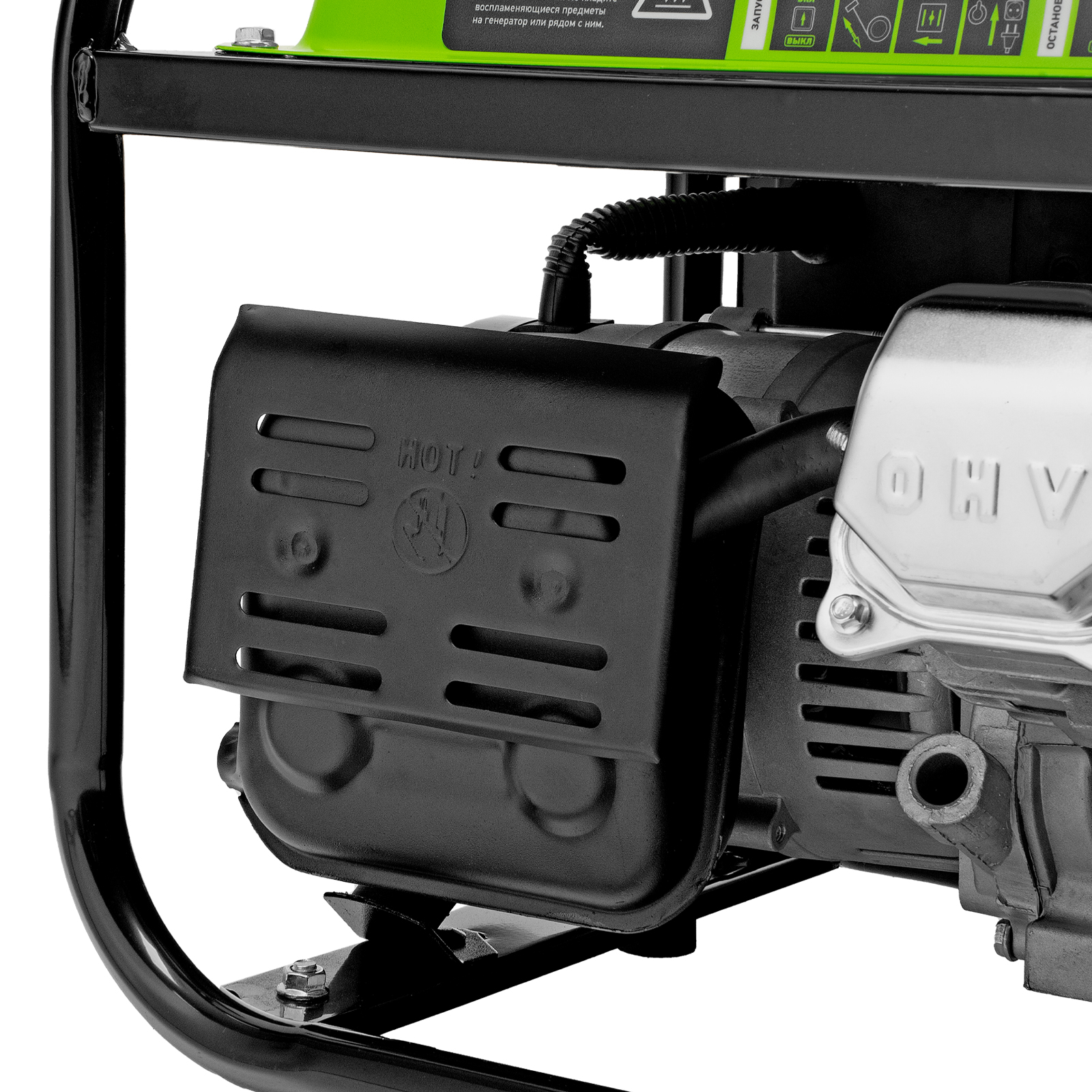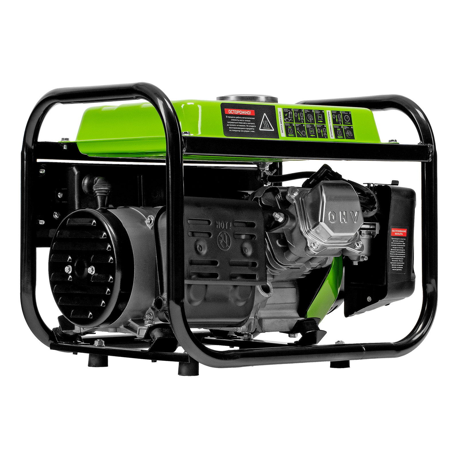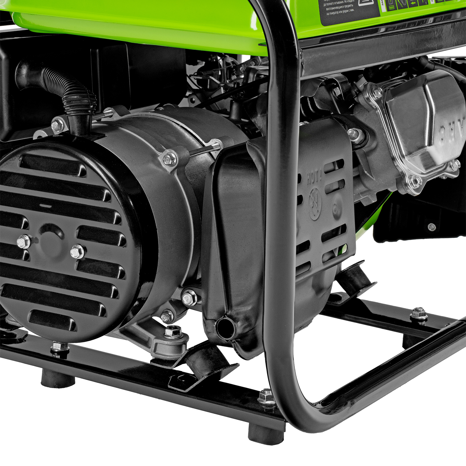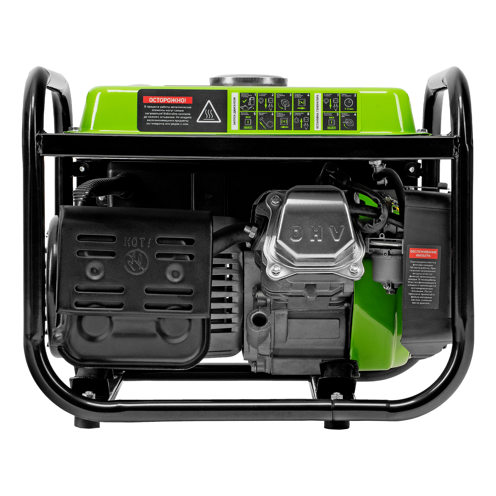 - Прочная конструкция — стальная рама защищает генератор от повреждений, а ее верхние элементы можно использовать как ручки для транспортировки.