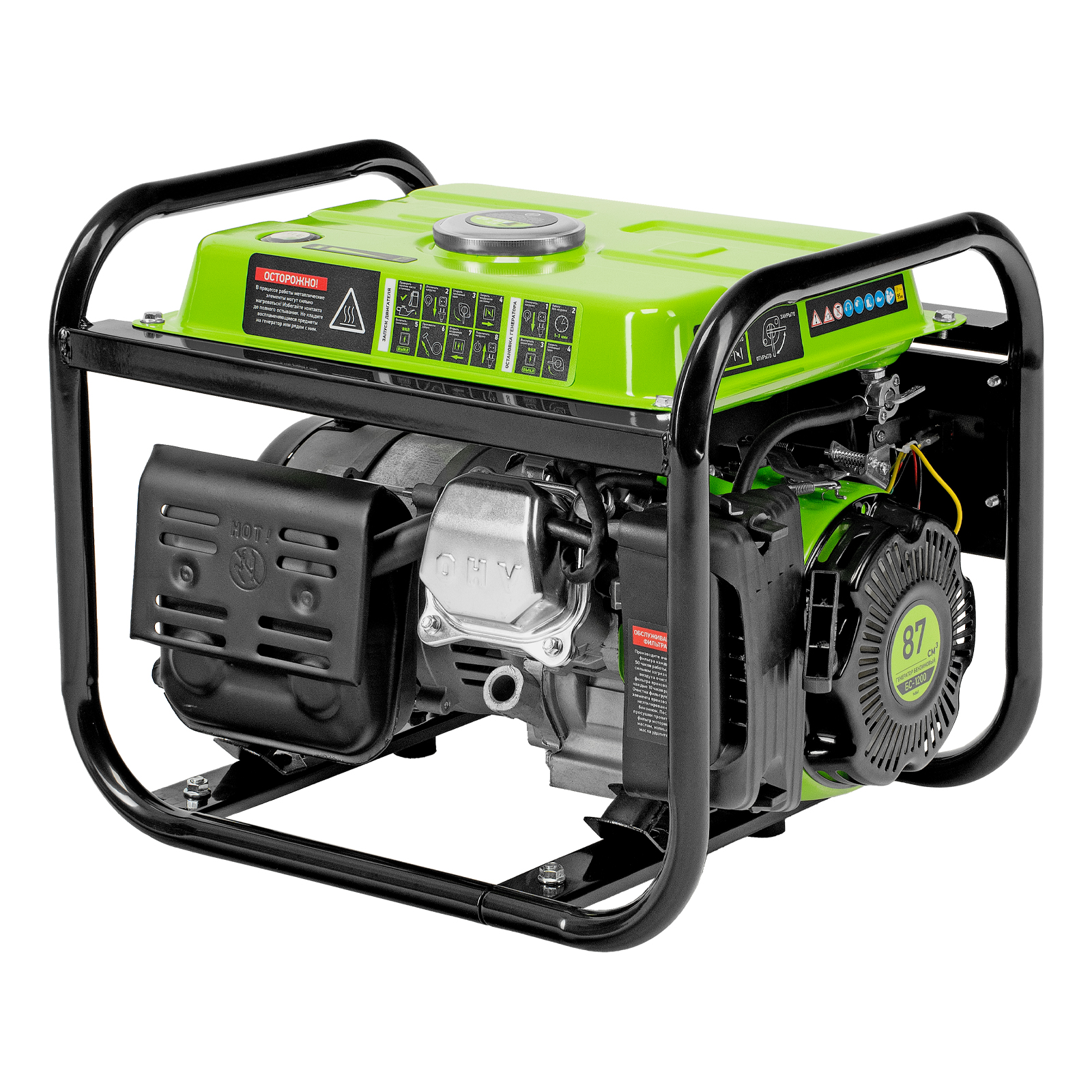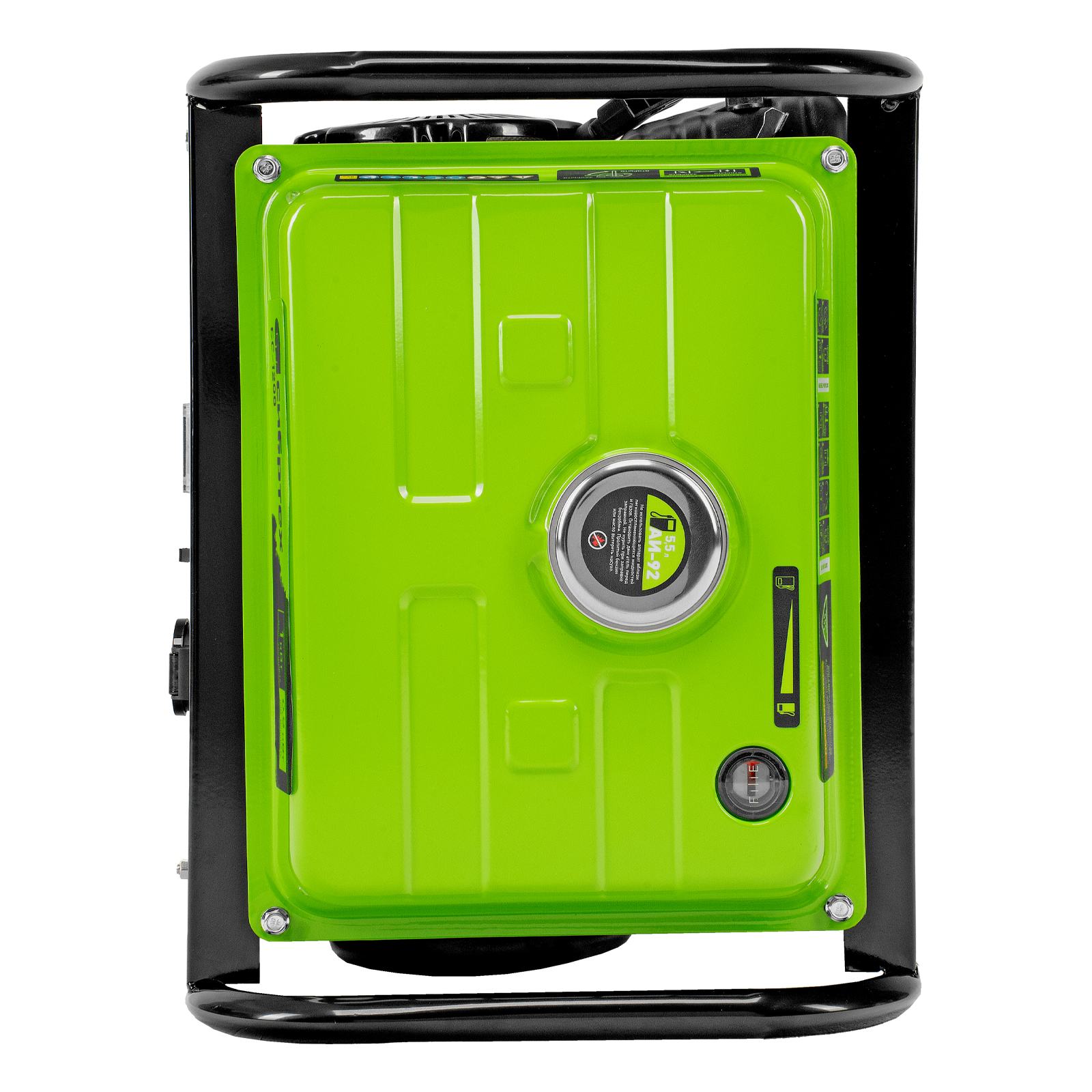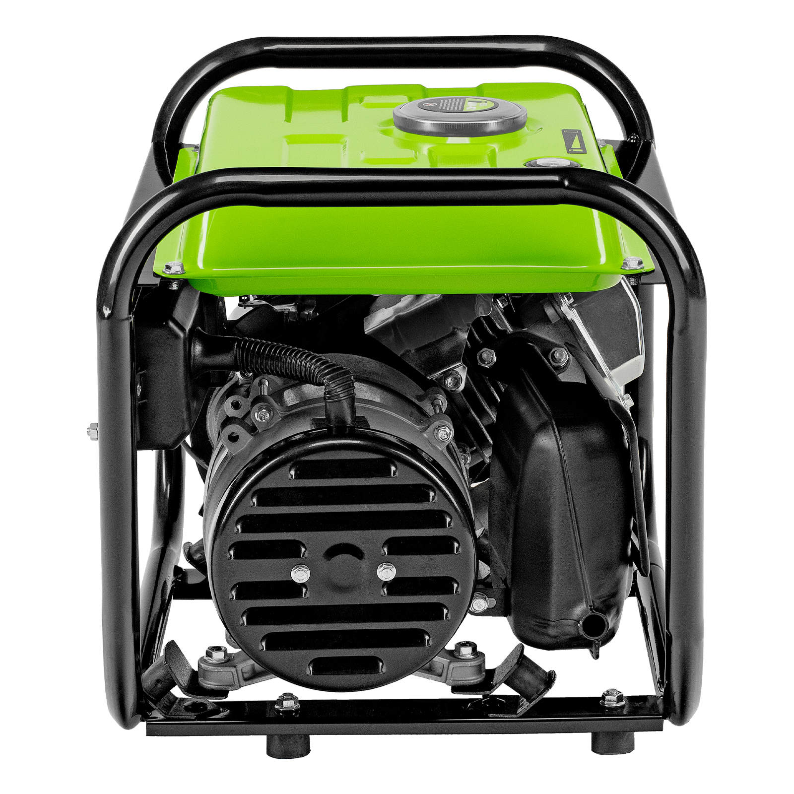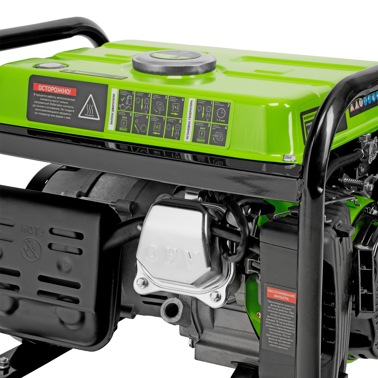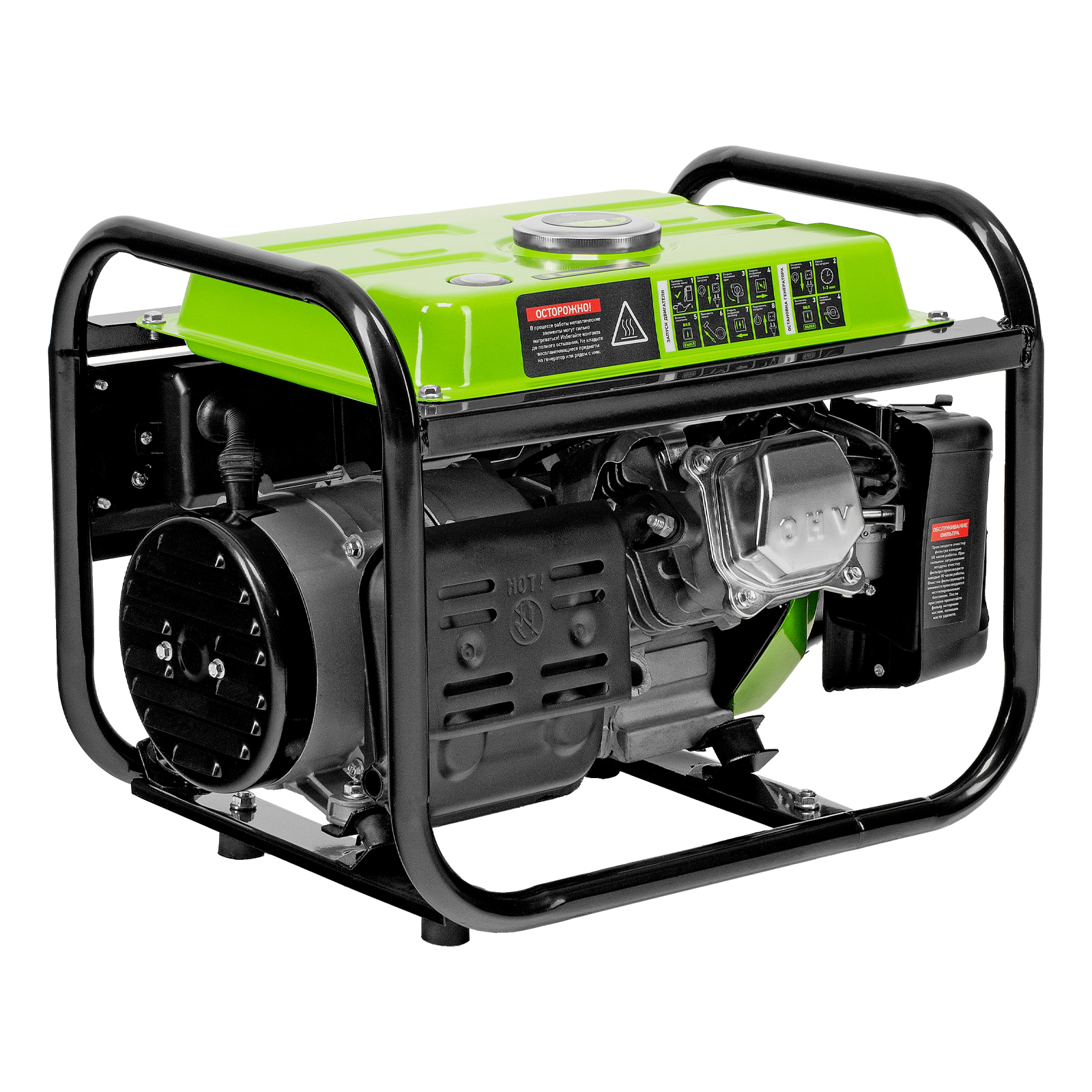- Прочная конструкция — стальная рама защищает генератор от повреждений, а ее верхние элементы можно использовать как ручки для транспортировки.