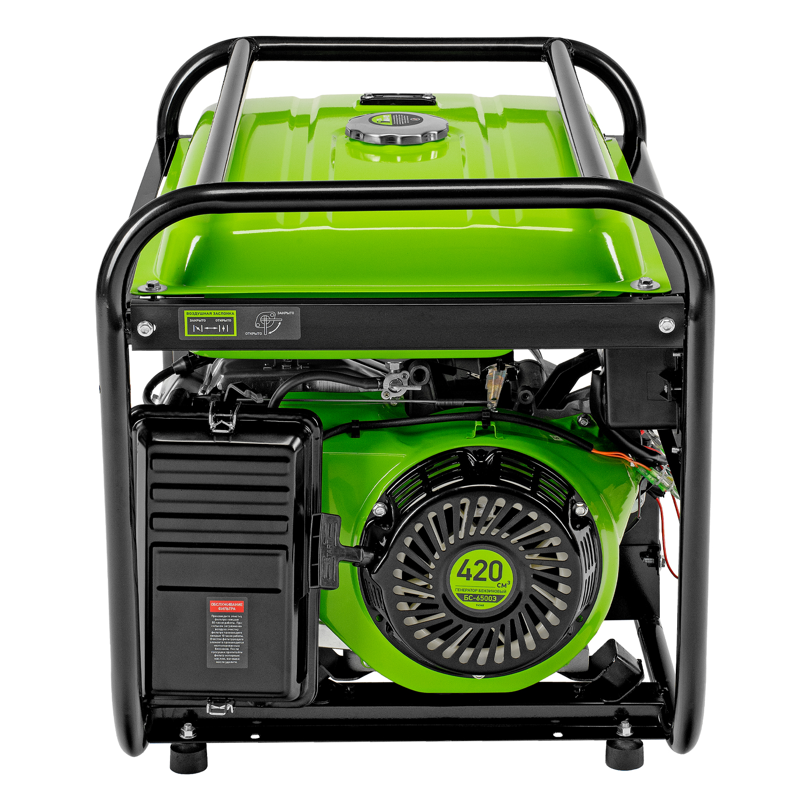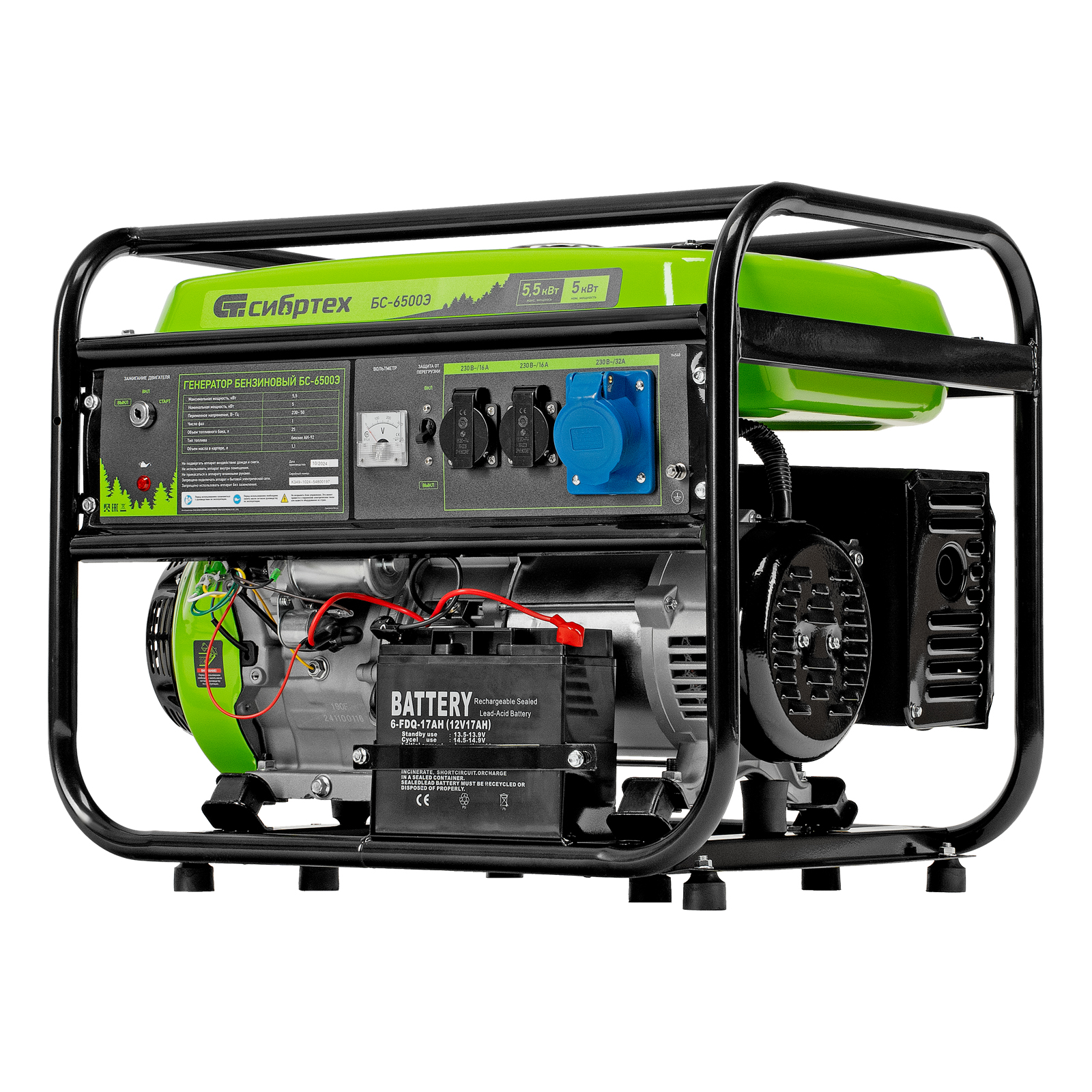 Бензиновый генератор Сибртех БС-6500Э 94548 максимальной мощностью 5,5 кВт, с 4-тактным двигателем, электростартером и баком объемом 25 л, выдает напряжение 230 В и используется для электроснабжения на даче, на строительной площадке, в магазине, в мастерской или гараже. Мощности хватает для обеспечения работы электроинструмента или одновременного подключения 4 ламп накаливания, телевизора, плиты и холодильника. Благодаря электростартеру запуск генератора осуществляется одним поворотом ключа.