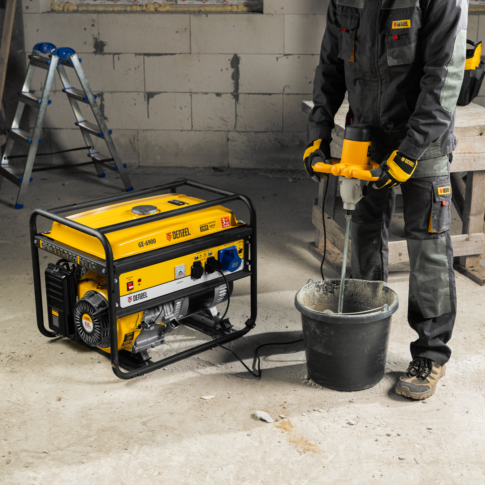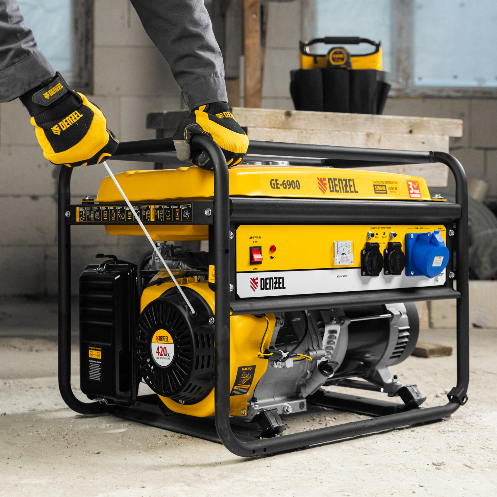 Бензиновый генератор Denzel GE 6900 94637 мощностью 5,5 кВт, 220 В / 50 Гц, с ручным стартом и баком объемом 25 л, подходит для использования в загородном доме, в торговой точке, на стройке или предприятии. Одновременно к нему можно подключить, например, 4 лампы накаливания, холодильник, телевизор и чайник. Силовая розетка позволяет подключать мощное электрооборудование. Полного бака хватает на 10 ч работы без дозаправки.