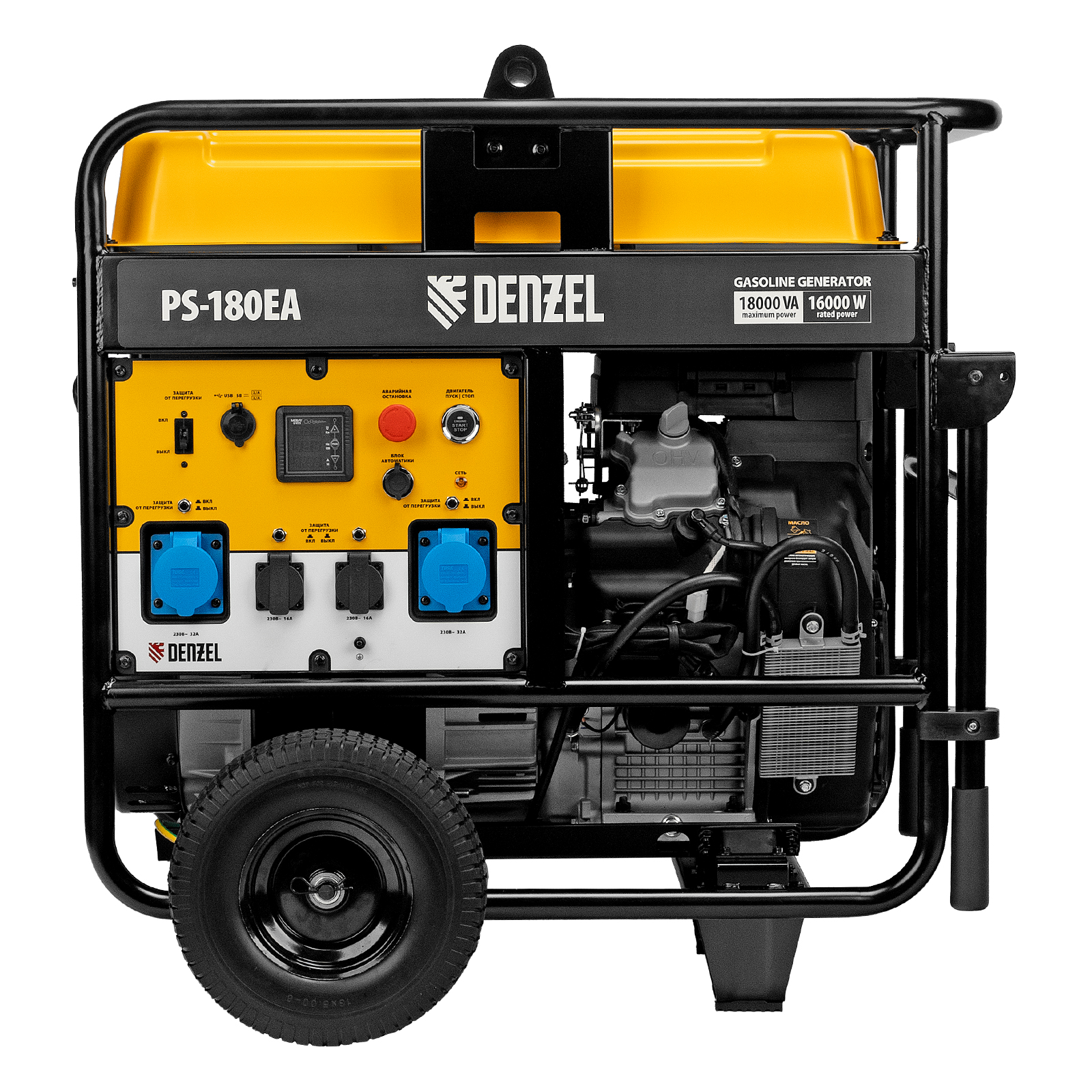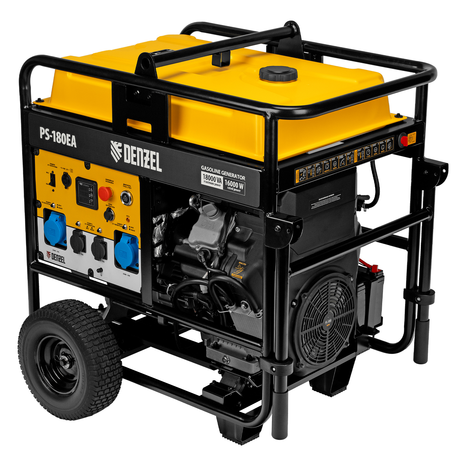 Бензиновый генератор Denzel PS-180EA 946974 максимальной мощностью 18 кВт, с баком объемом 65 л, разъемом ATS и электрическим стартером, поддерживает напряжение в сети 230 В. Предназначен для обеспечения питанием приборов и оборудования в случае отсутствия стационарной сети или перебоев в ее работе. Разъем USB 5 В позволяет заряжать мобильные устройства. Подключение потребителей производится при помощи 2-х розеток 230 В/16 А, а также 2-х силовых розеток 230 В/32 А.,Для работы с мощным оборудованием можно воспользоваться возможностью прямого подключения кабелей через распределительную коробку. Генератор пригодится в загородном доме, на производстве или строительной площадке.