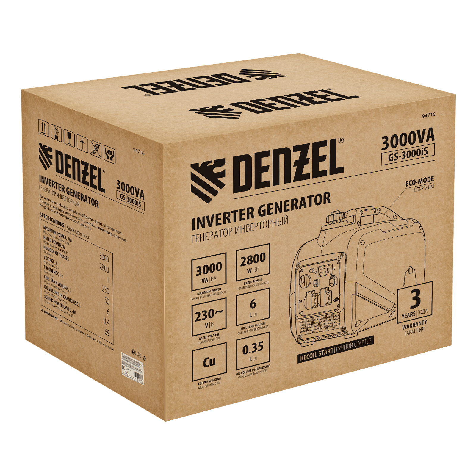 Генератор инверторный GS-3000iS, 3,0 кВт, 230 В, закрытый корпус, ручной старт DENZEL в Санкт-Петербурге