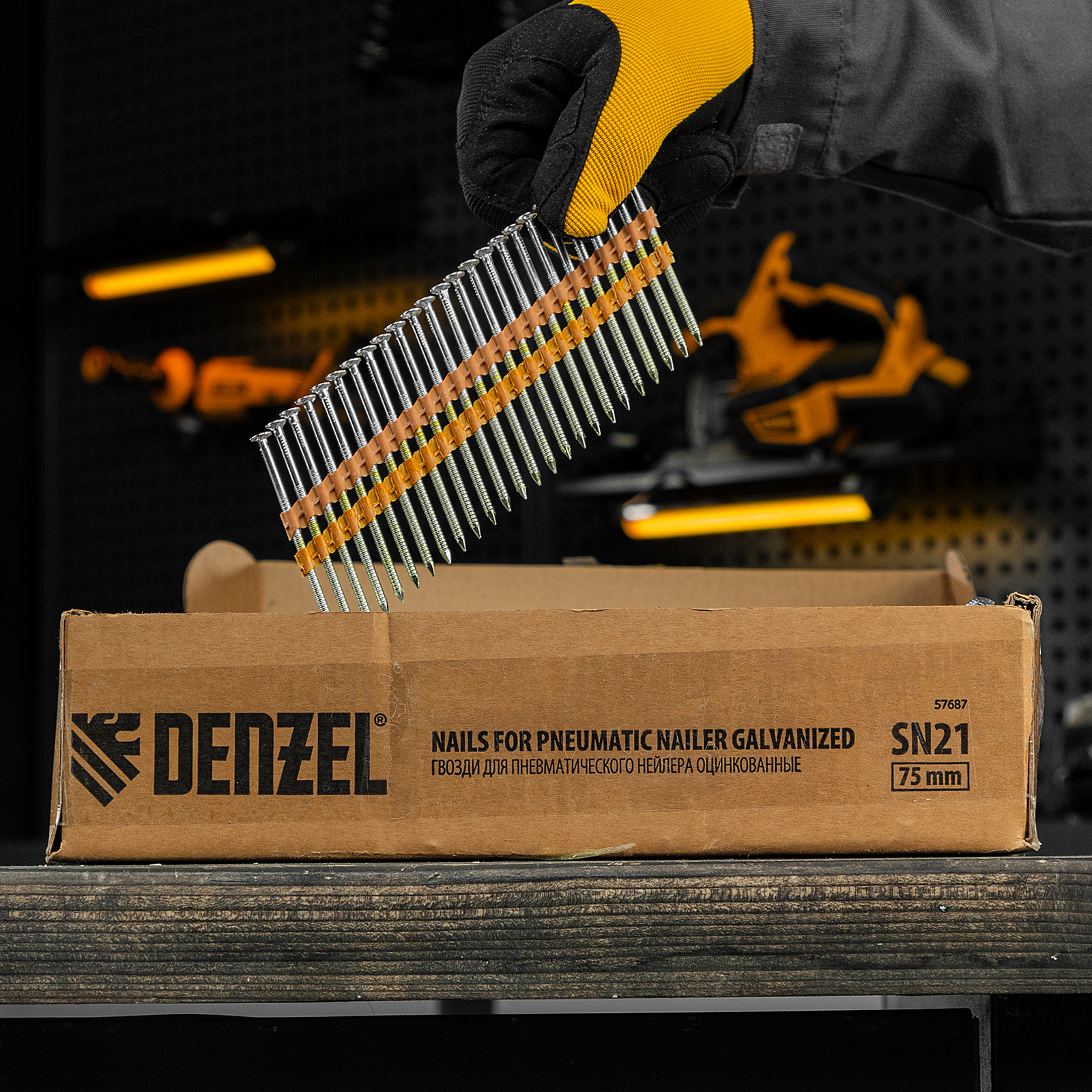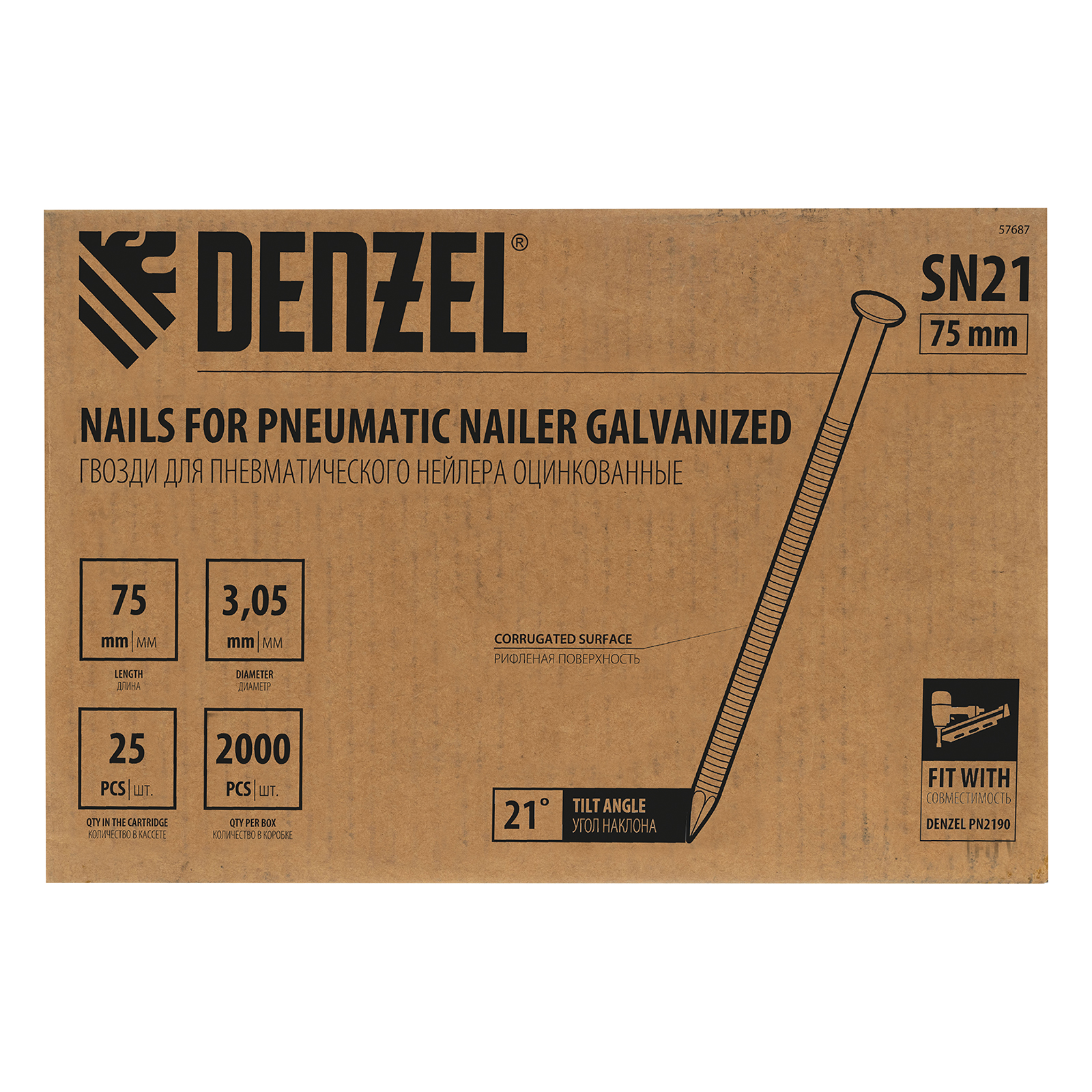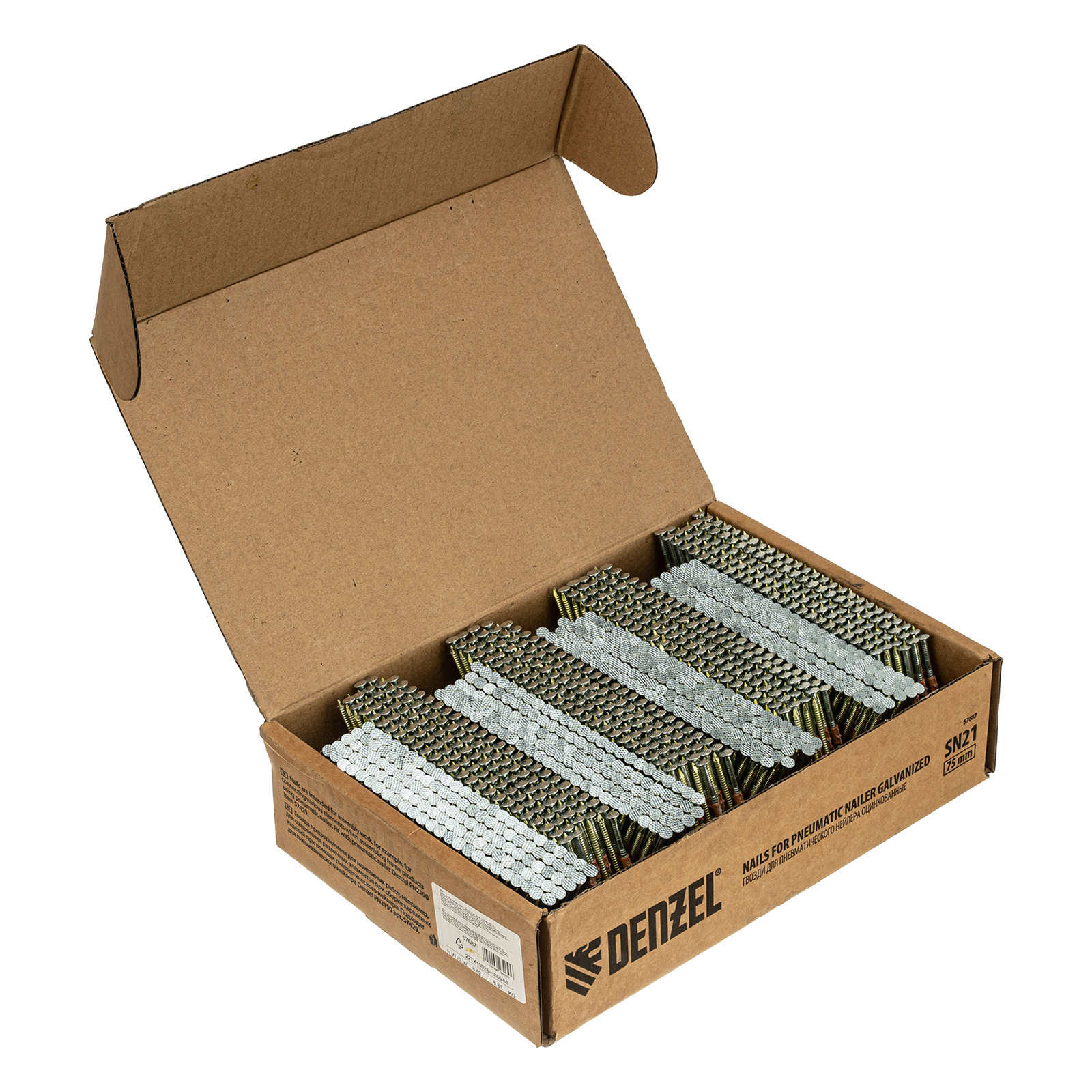 Оцинкованные гвозди Denzel 57687 типа SN21, длиной 75 мм и диаметром 3,05 мм, 2000 шт. в упаковке, — расходники для пневматического нейлера. Используются для скрепления различных материалов, будут полезны во время сборочных и отделочных работ.