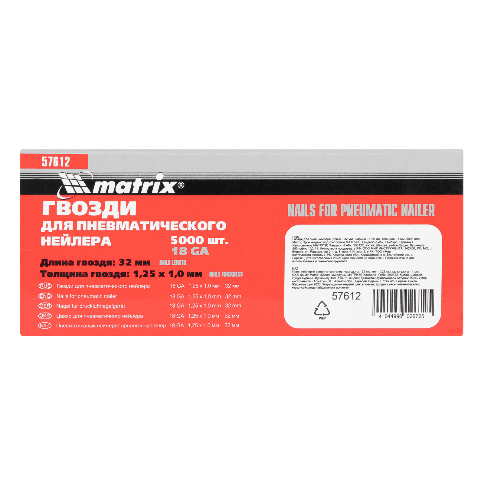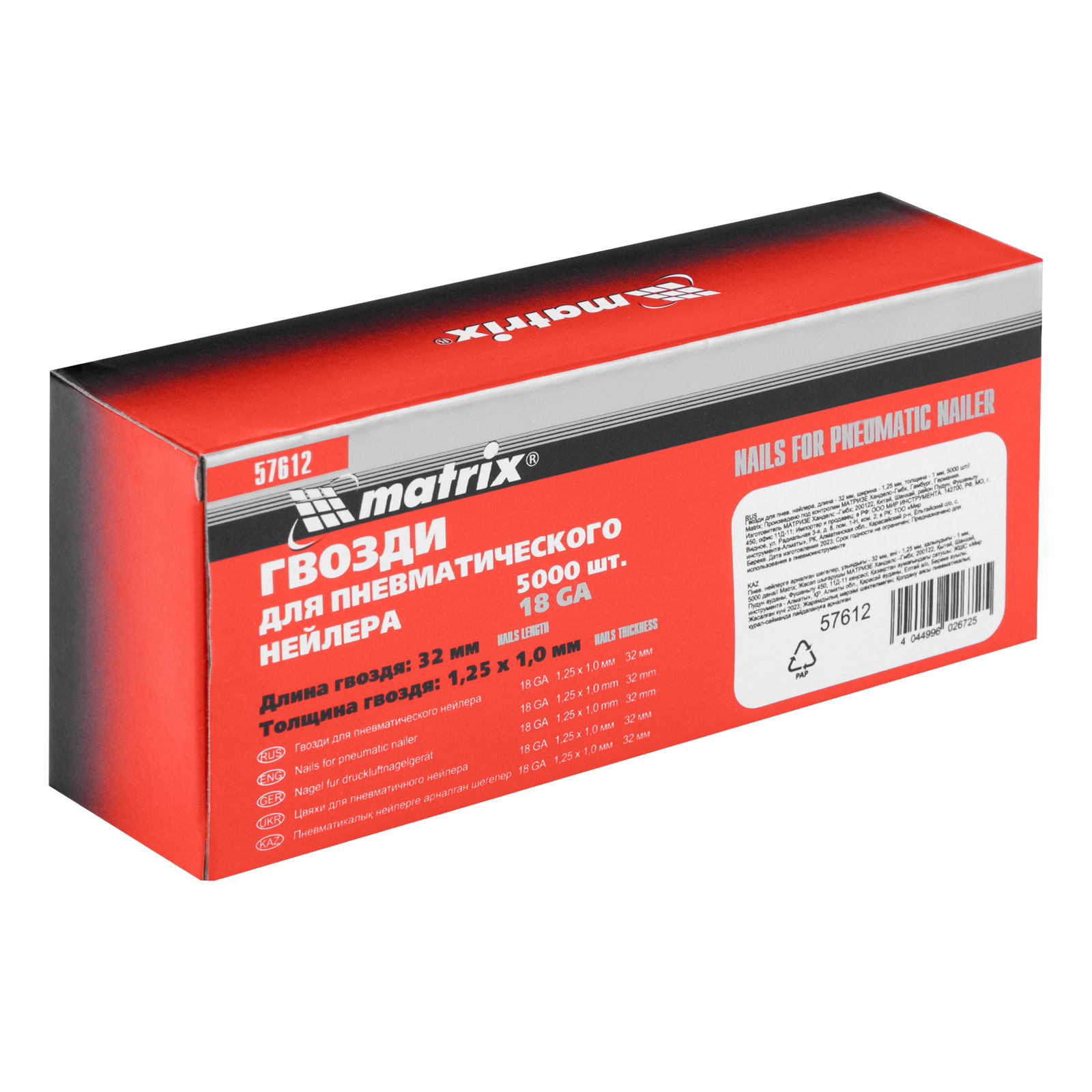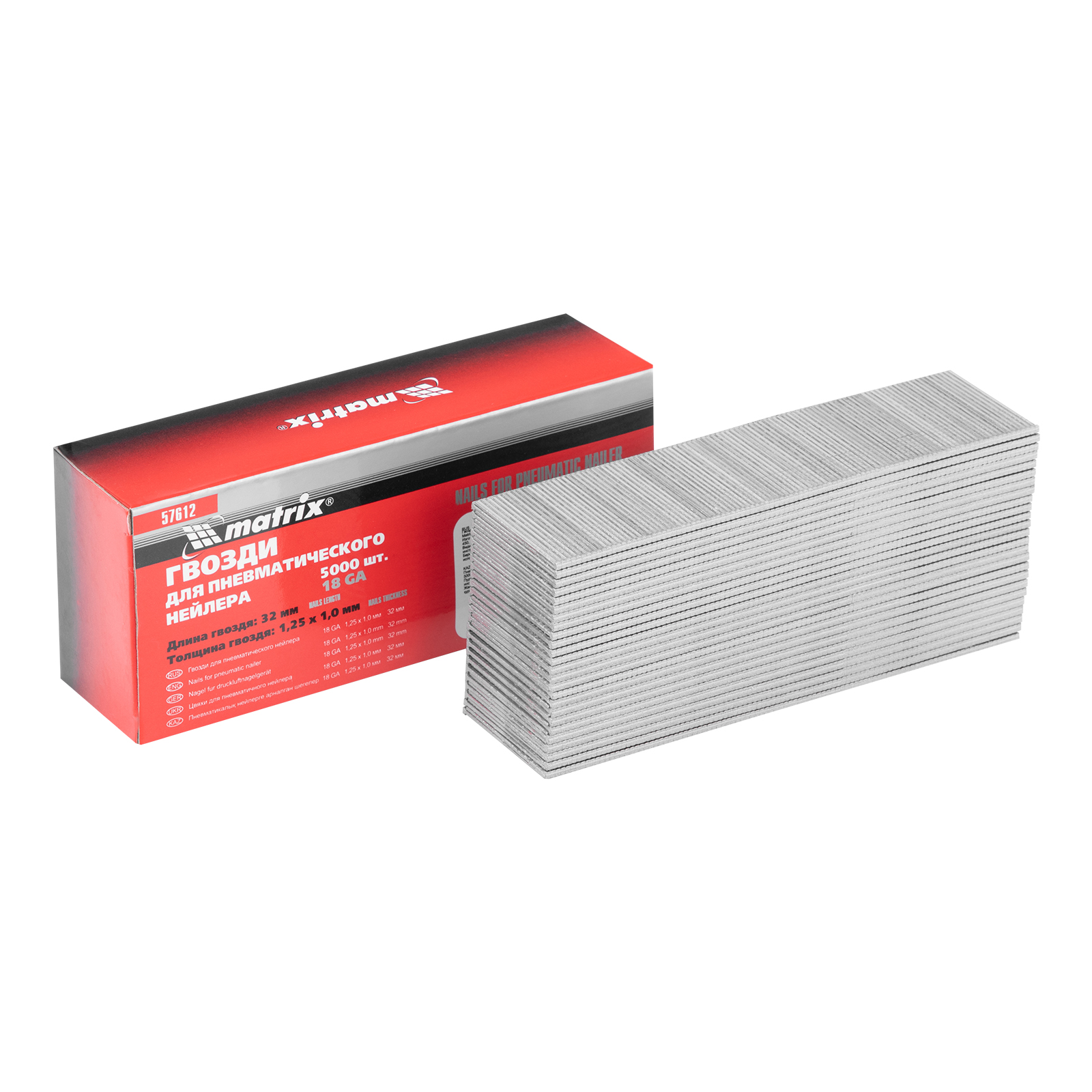 Гвозди для пневматического нейлера, длина 32 мм, ширина 1.25 мм, толщина 1 мм, 5000 шт Matrix