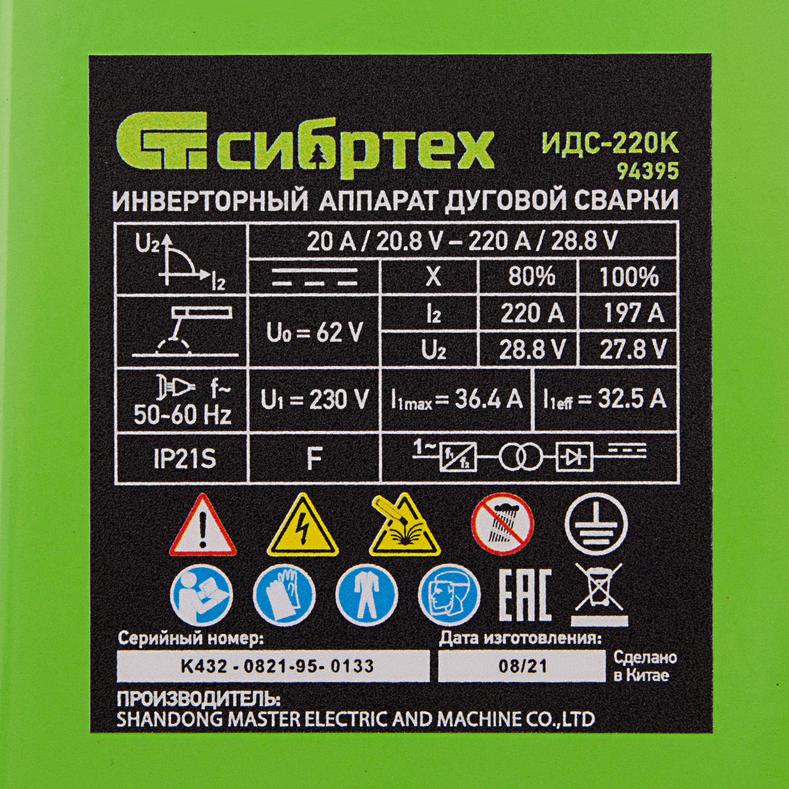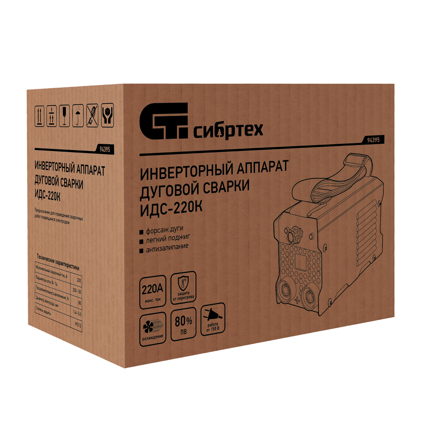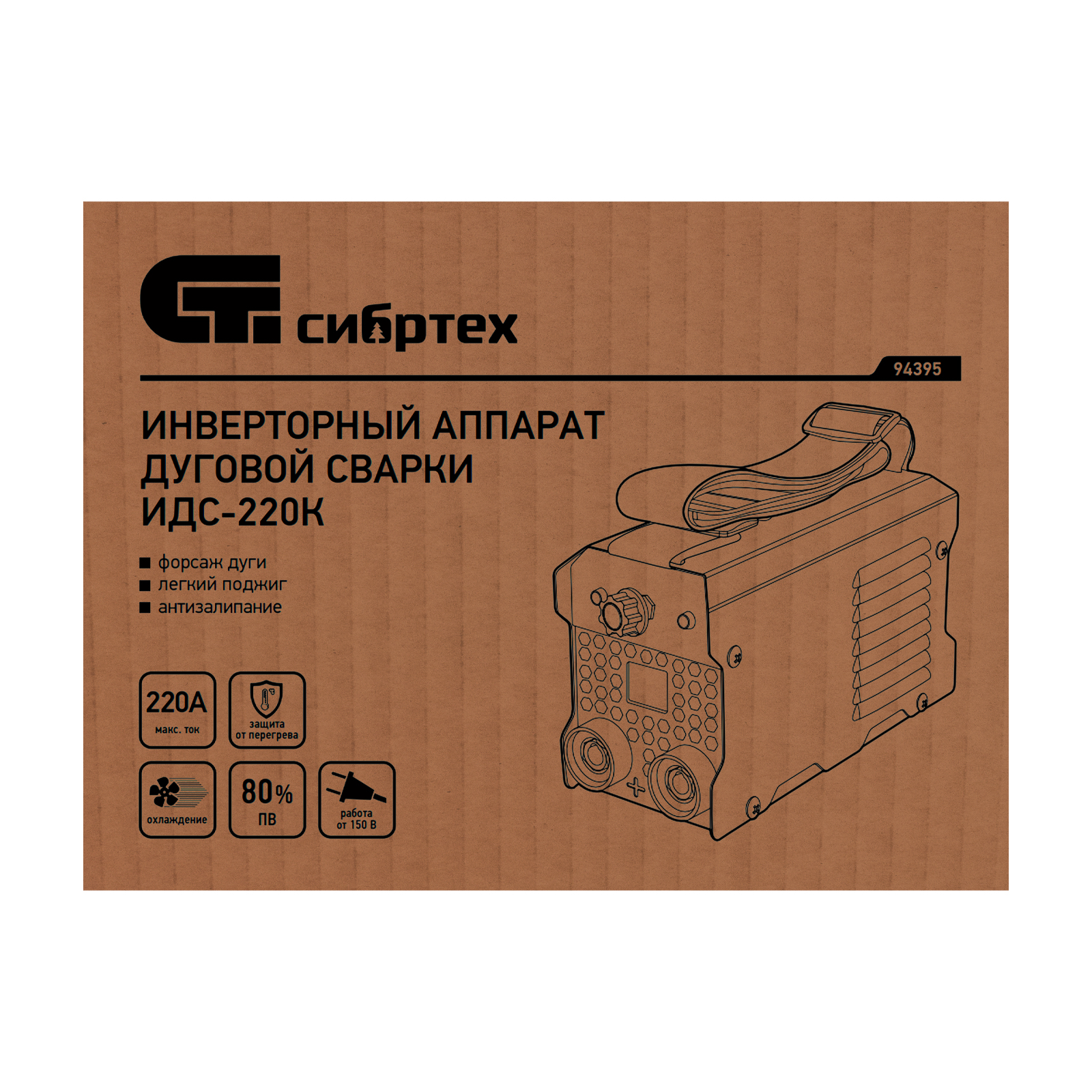 Инверторный аппарат дуговой сварки ИДС-220K, 220 А, ПВ 80%, диаметр электрода 1,6-5 мм Сибртех в Санкт-Петербурге