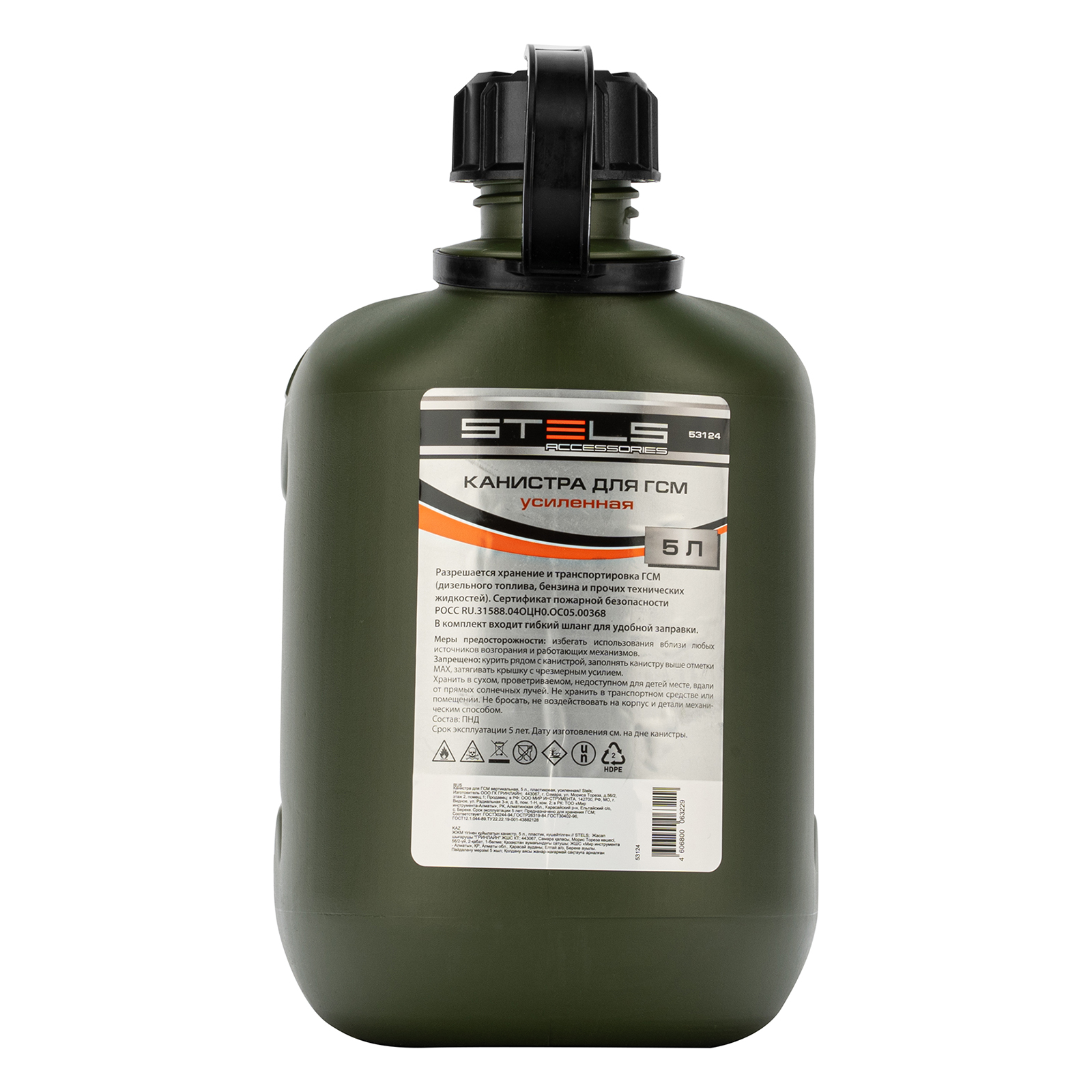 Усиленная пластиковая канистра Stels 53124 объемом 5 л, вертикальная, используется для транспортировки топлива и других ГСМ, а также их хранения в гараже или на даче. Будет полезна для дозаправки автомобиля в дороге. Также пригодится для обслуживания бензотехники: пил, триммеров, газонокосилок и другого оборудования.