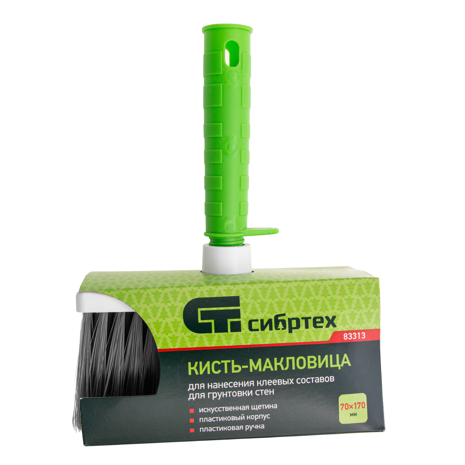Кисть-макловица Сибртех 83313 толщиной 70 мм и шириной 170 мм, с искусственной щетиной, пластиковым корпусом и пластиковой ручкой, используется для нанесения на поверхности грунтовки, водно-дисперсионной краски, побелки, обойного клея, морилки. Подходит для обработки участков большой площади. Искусственная щетина с расщепленными на концах ворсинками хорошо набирает и удерживает лакокрасочные материалы, не деформируется в ходе работы.