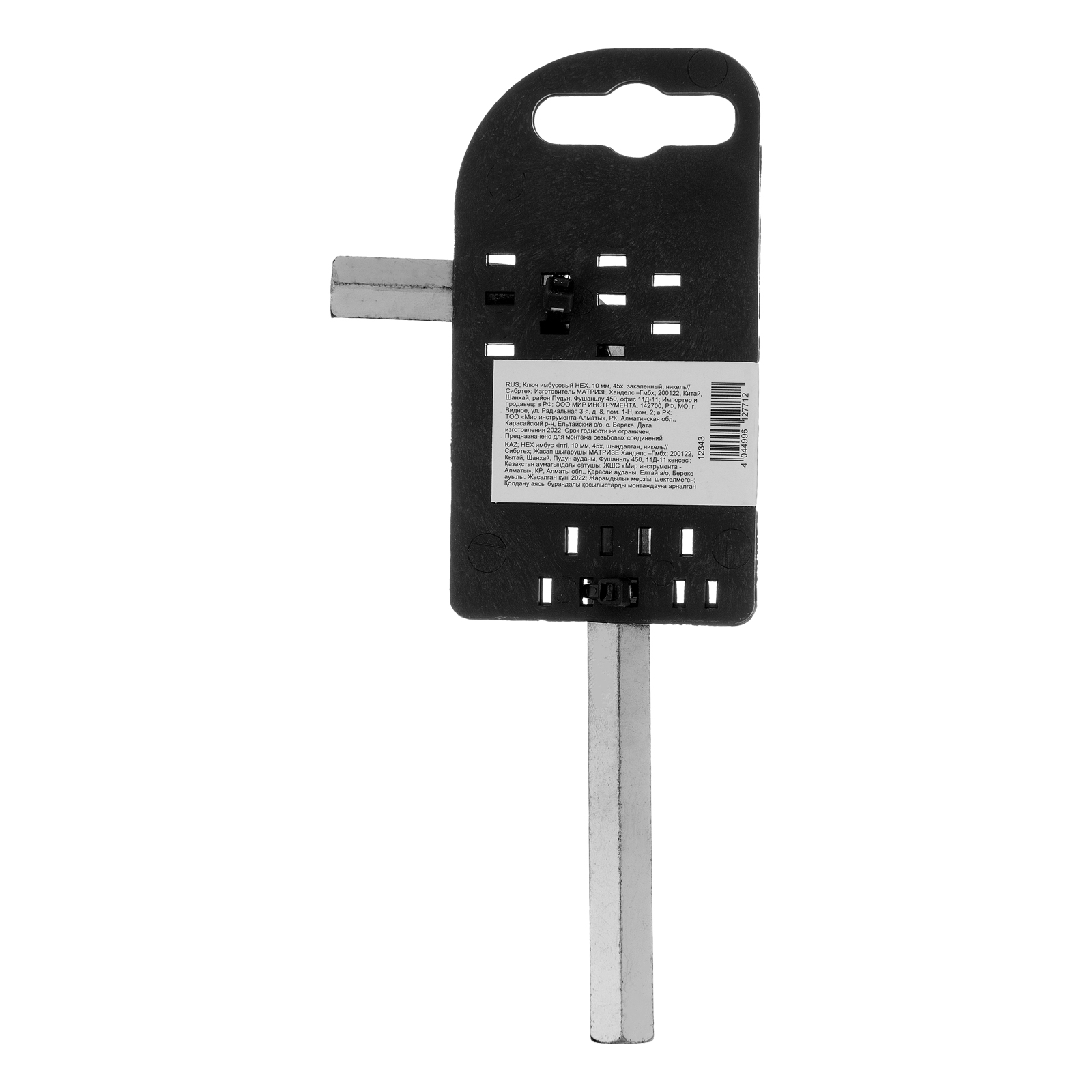 Ключ имбусовый никелированный Сибртех 12343 размером 10 мм, из закаленной стали 45Х, используется для монтажа и демонтажа резьбового крепежа с шестигранным шлицем HEX. Пригодится для сборки мебели, ремонта бытовой техники, велосипедов и автомобилей.