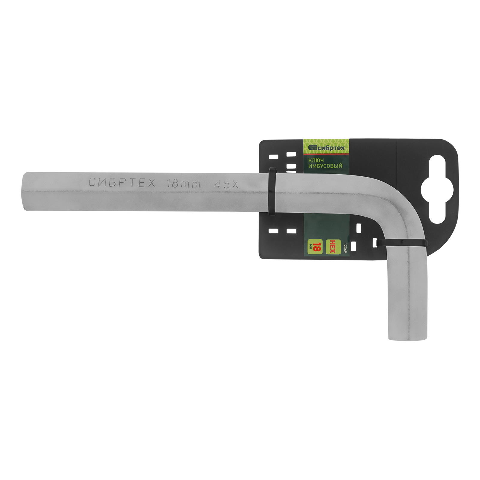 Ключ имбусовый никелированный Сибртех 12349 размером 18 мм, из закаленной стали 45Х, используется для монтажа и демонтажа резьбового крепежа с шестигранным шлицем HEX. Пригодится для сборки мебели, ремонта бытовой техники, велосипедов и автомобилей.