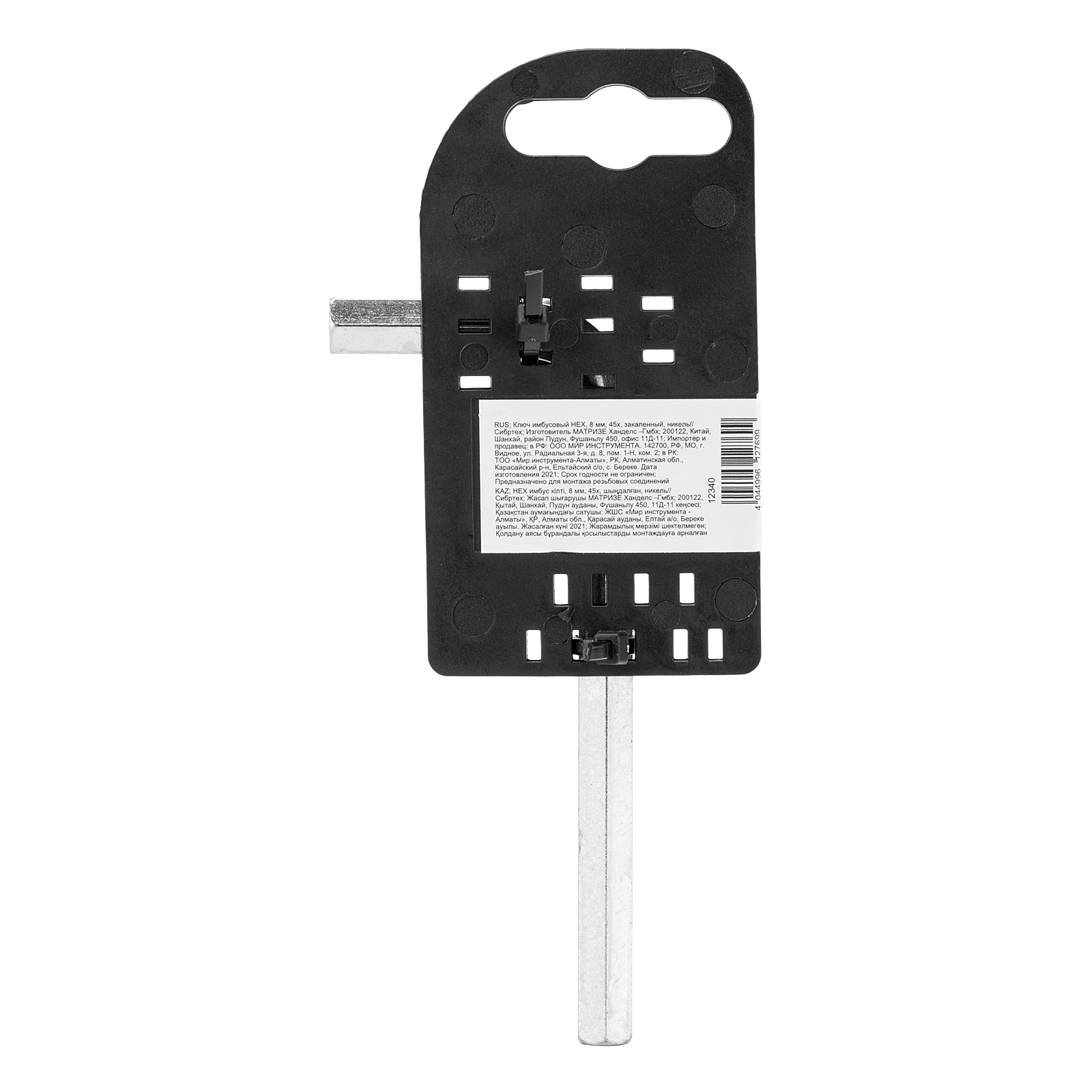 Ключ имбусовый никелированный Сибртех 12340 размером 8 мм, из закаленной стали 45Х, используется для монтажа и демонтажа резьбового крепежа с шестигранным шлицем HEX. Пригодится для сборки мебели, ремонта велосипедов, регулировки пластиковых окон и балконных дверей.
