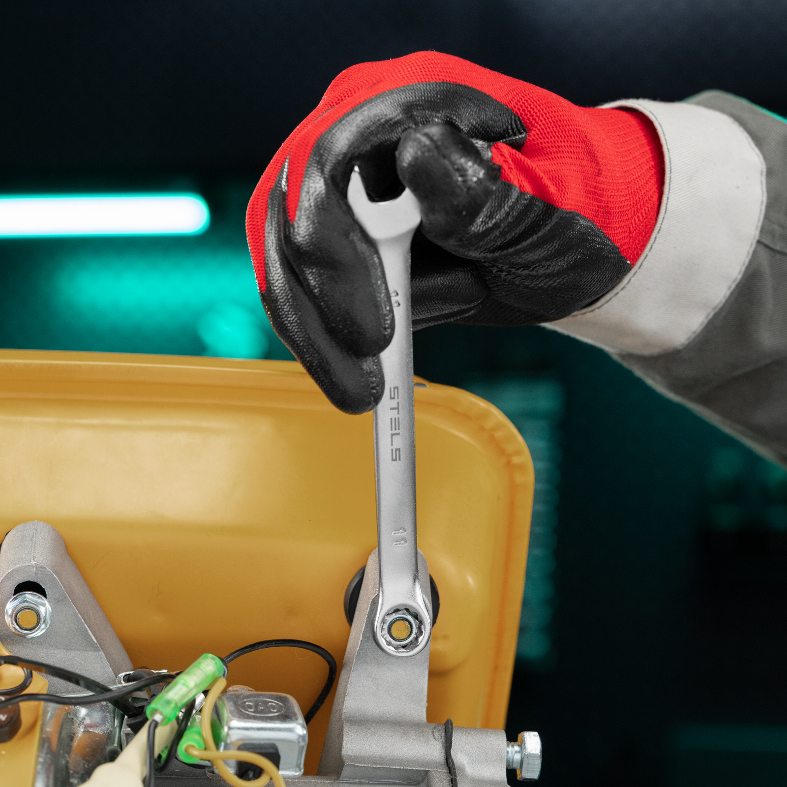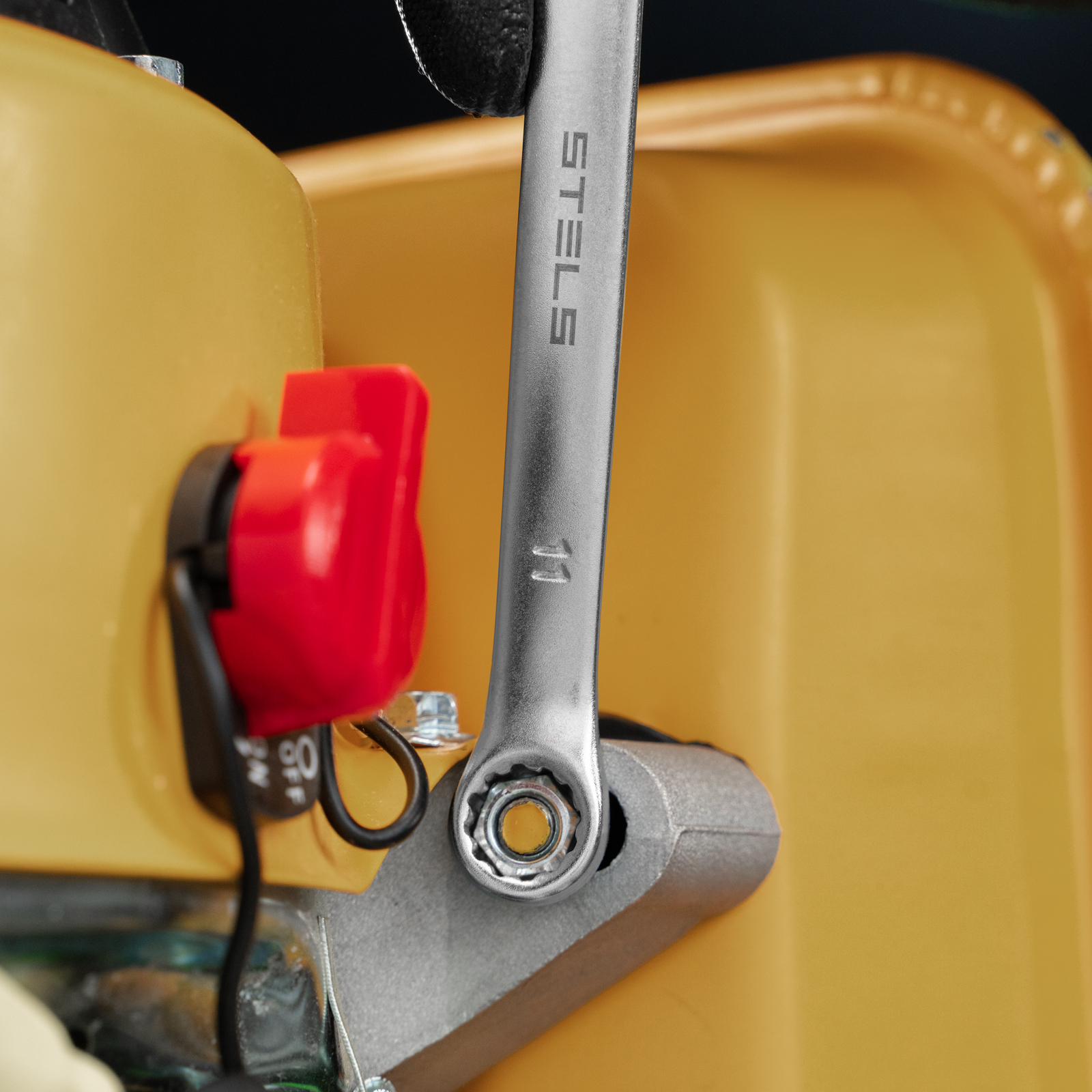 Комбинированный ключ Stels 15207 из стали CrV, 11 мм, покрытый матовым хромом, используется для закручивания и откручивания гаечных и болтовых соединений. Накидная головка имеет 12-гранную внутреннюю поверхность, что облегчает работу с крепежом и уменьшает опасность его повреждения. Ключ применяется в слесарных мастерских и автосервисах, а также будет полезен для решения бытовых задач.