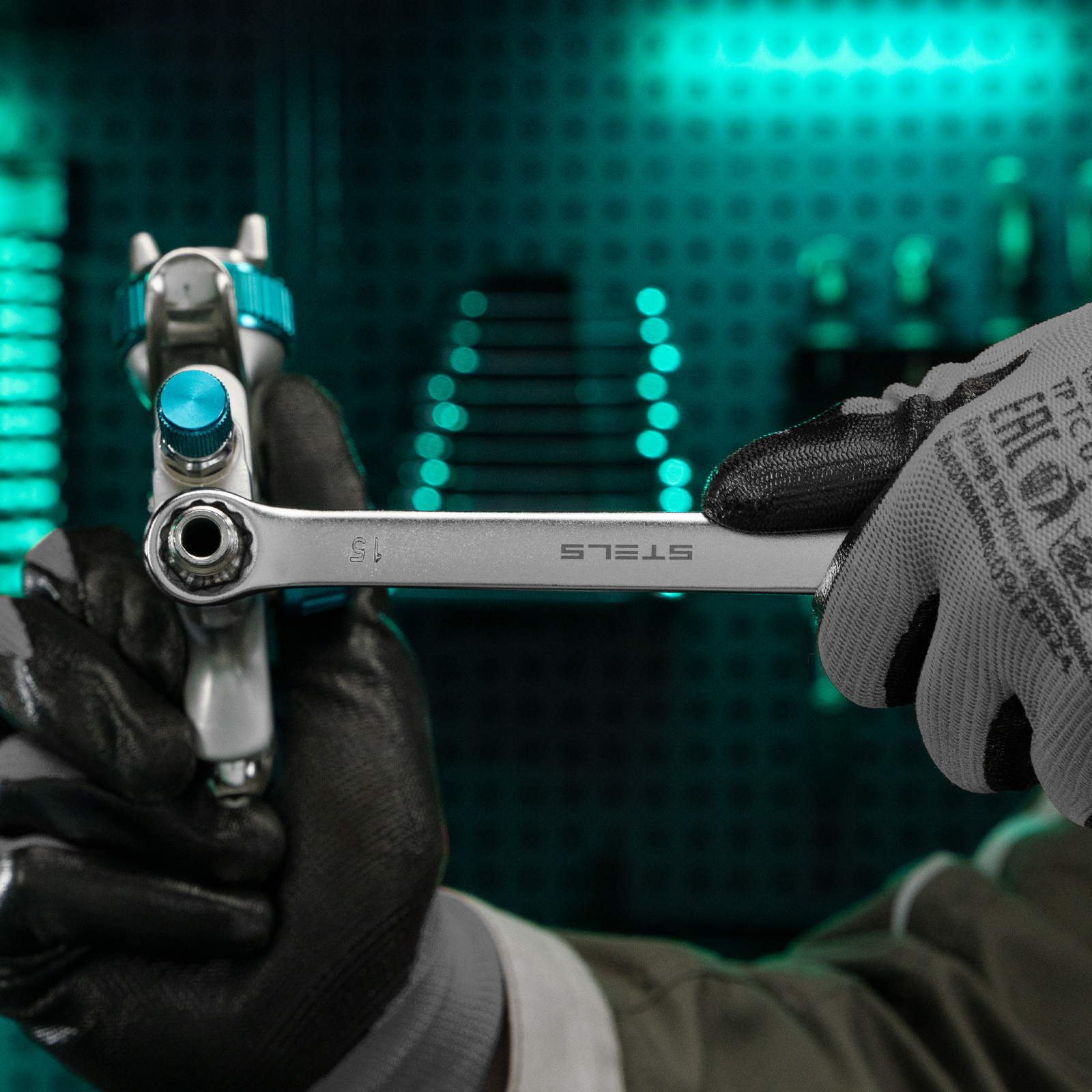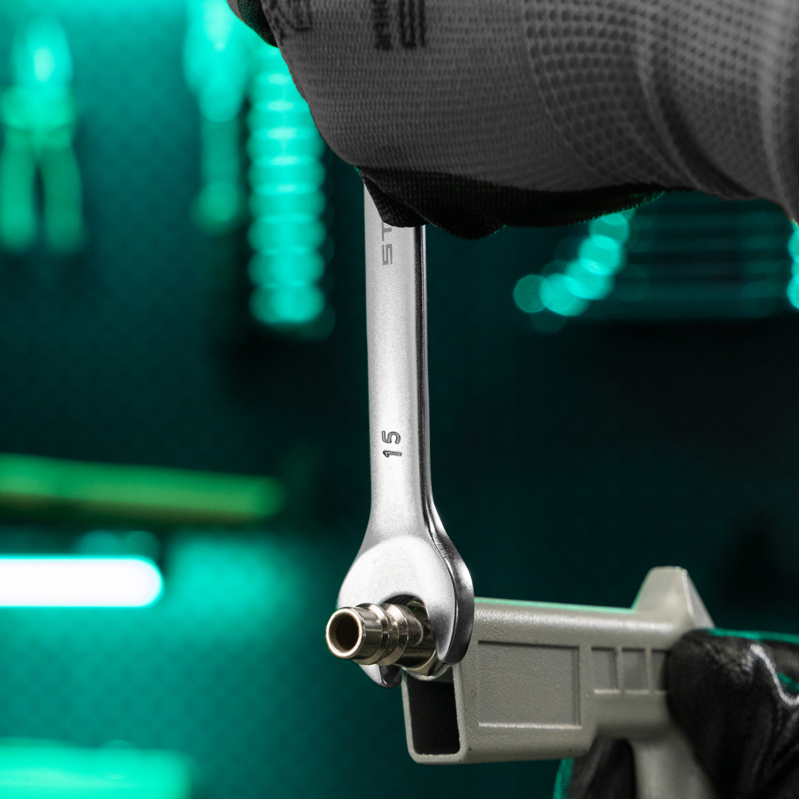 - Комфорт при монтаже в труднодоступных местах — кольцевой зев наклонен под углом в 15 градусов к плоскости ключа.