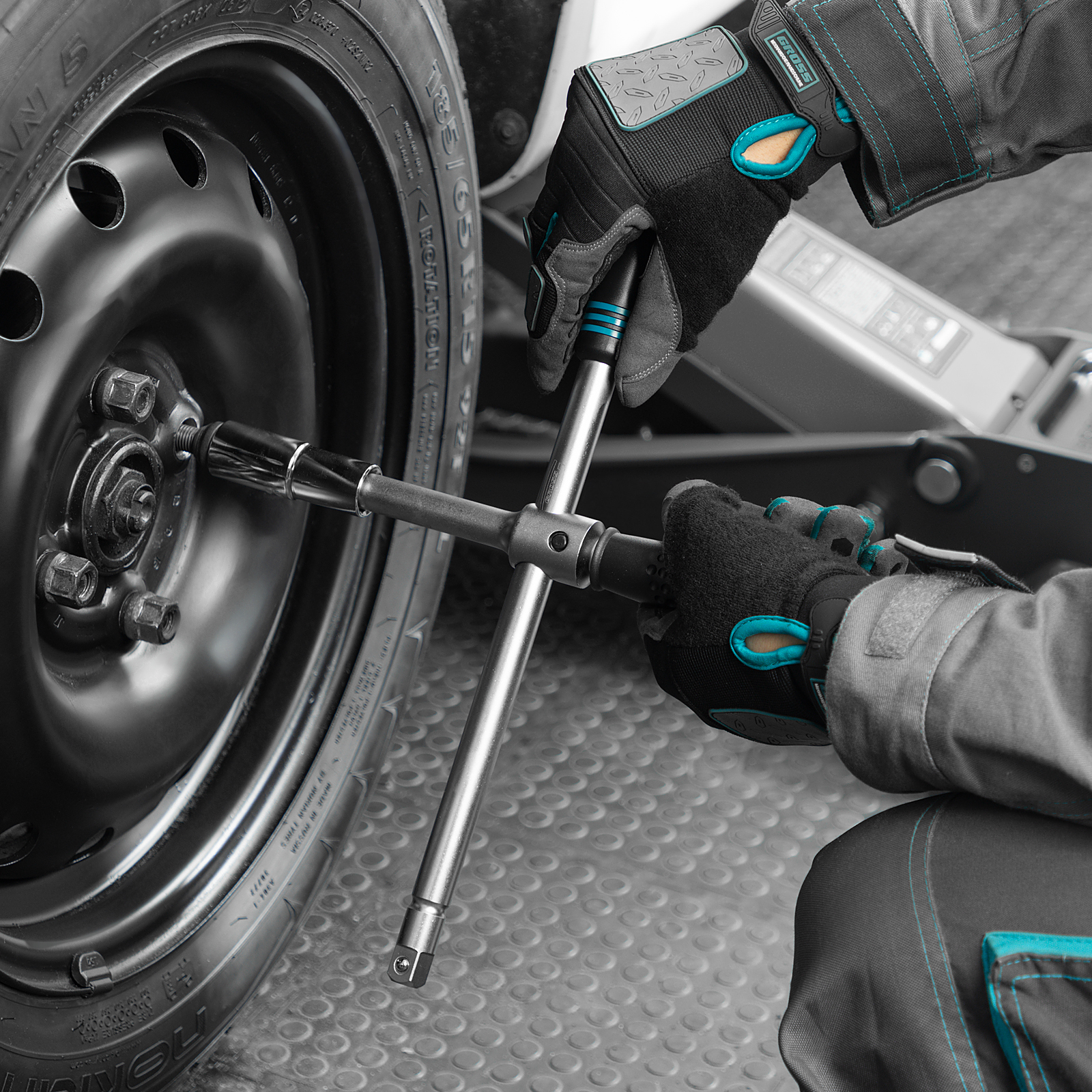 Складной баллонный ключ-крест с изменяющимся рычагом Gross 14270 из стали CrV, хромированный, с головками на 17, 19, 21, 23 мм, предназначен для откручивания и закручивания колесных крепежей. Поставляется с двумя двусторонними торцевыми головками под 4 размера резьбовых соединений. Запатентованный механизм фиксации телескопической рукоятки позволяет изменять длину рычага и оптимально дозировать величину крутящего момента. Инструмент рекомендован для профессионального использования, также может применяться для самостоятельного обслуживания автомобиля.