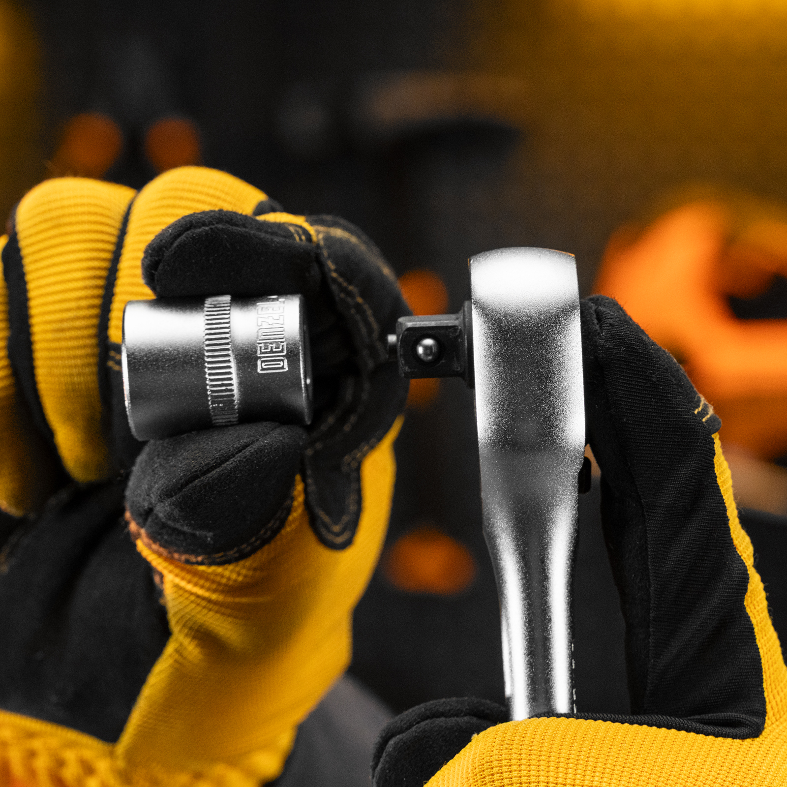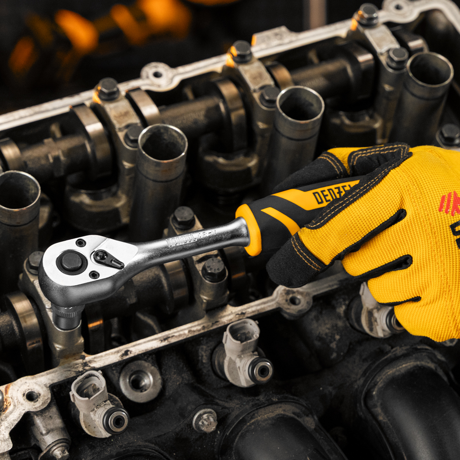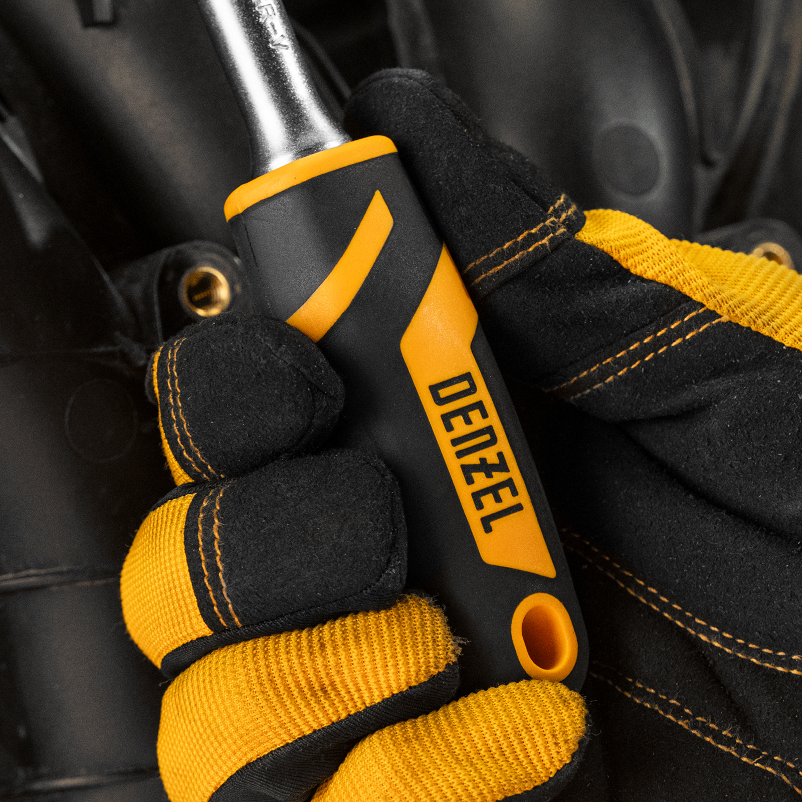 Ключ-трещотка Denzel 14032 из стали CrV, с присоединительным квадратом 3/8", с быстрым сбросом и храповым механизмом с 90 зубьями, предназначен для установки торцевых головок, а также адаптеров и удлинителей с посадочным размером соответствующего размера. Угол поворота трещотки составляет всего 4°, что упрощает работу в труднодоступных местах. Инструмент будет полезен в сервисном центре, на СТО, а также пригодится дома или в поездке.