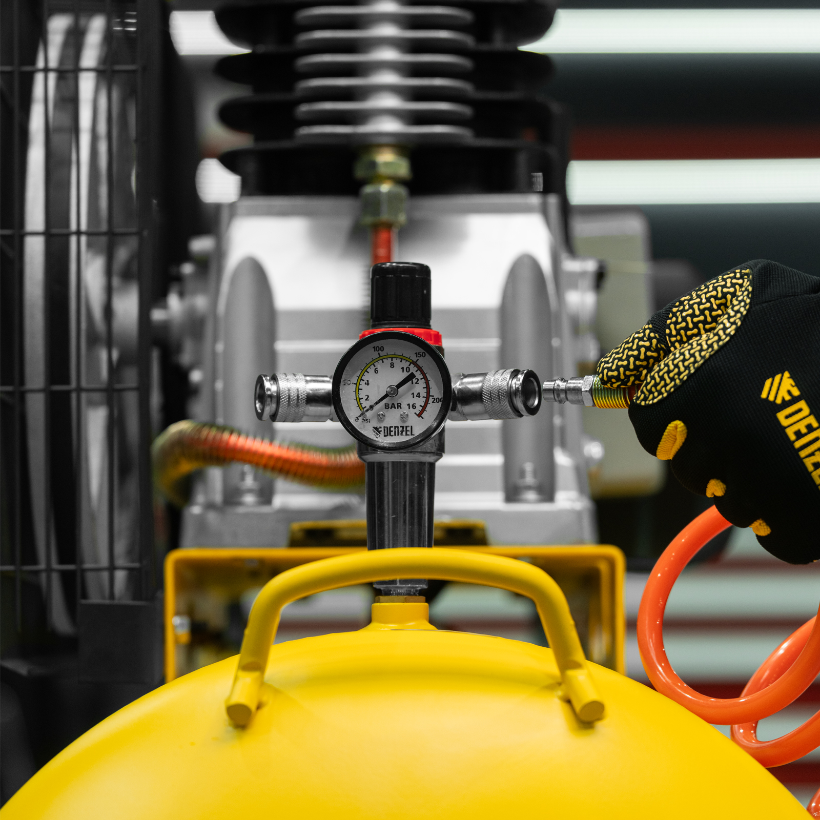 - Автоматический спускной клапан — лишнее давление быстро сбрасывается без вреда для компрессора.