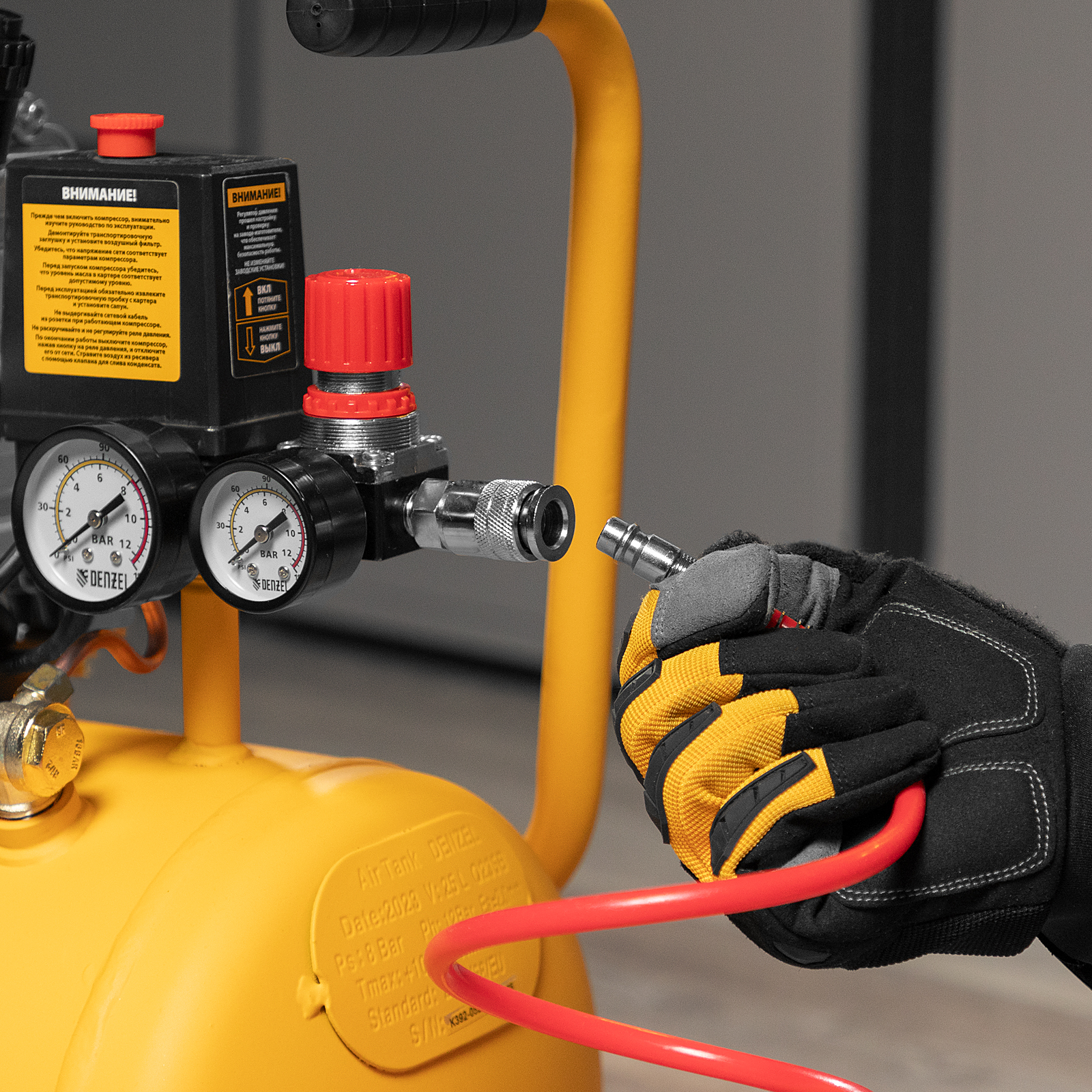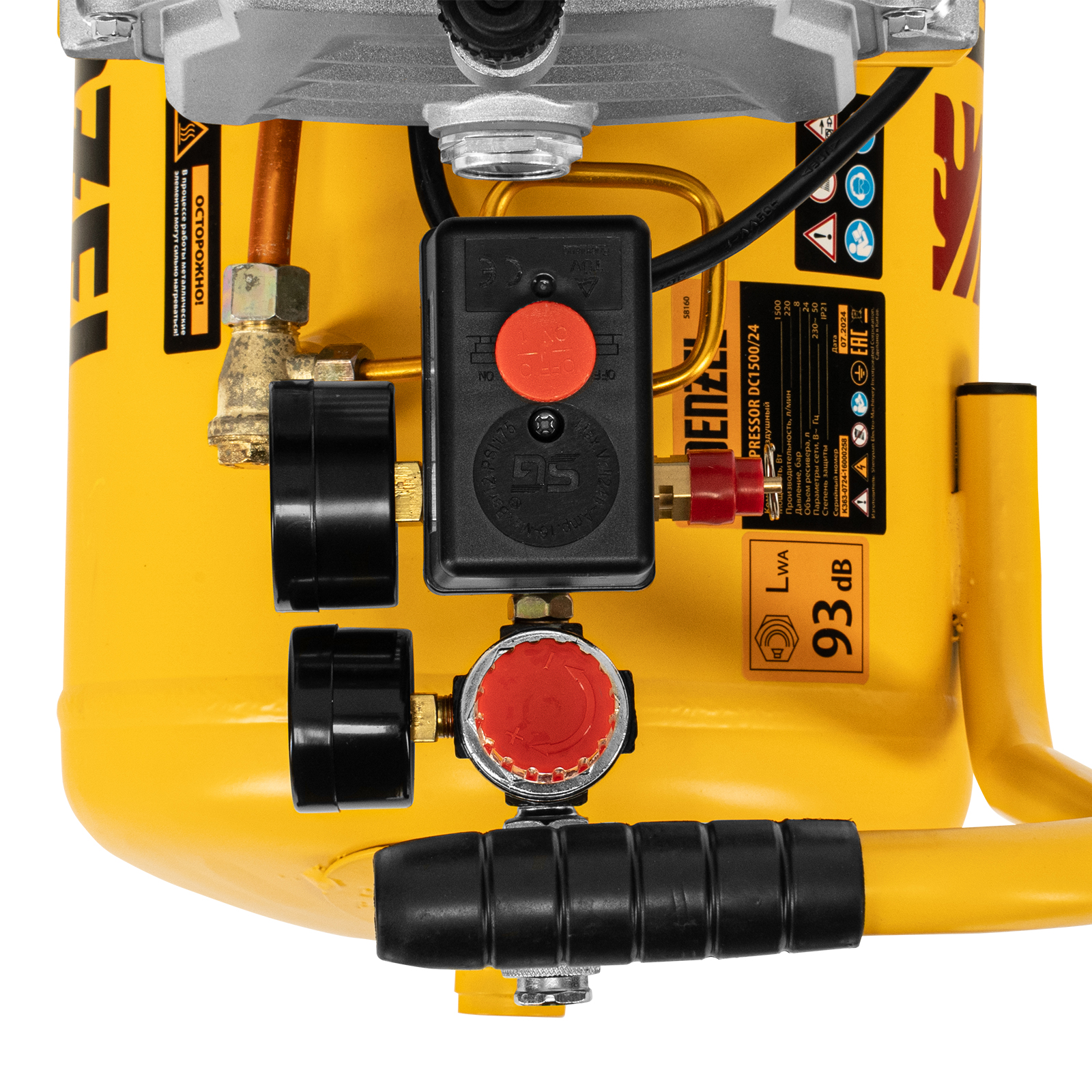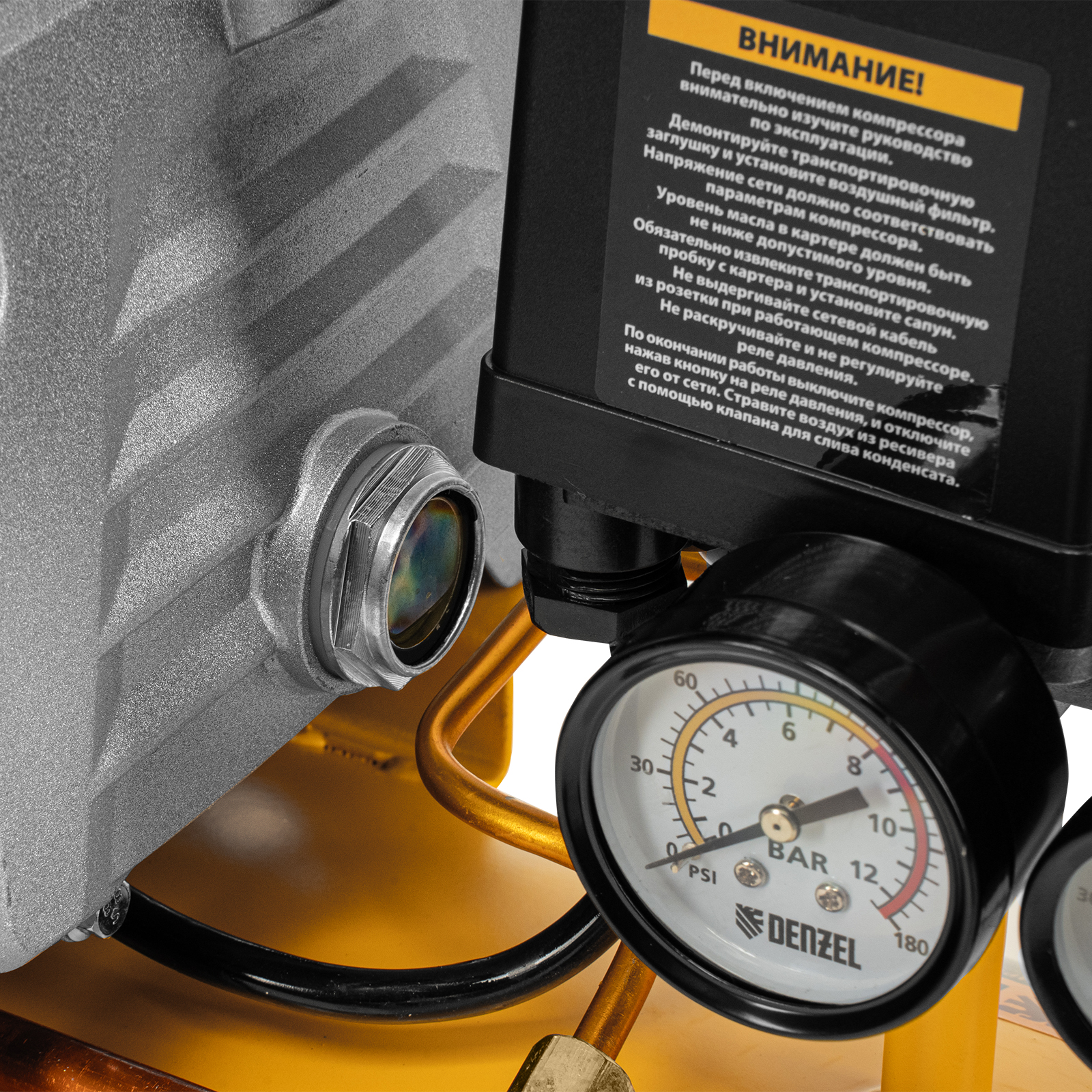 - Контроль рабочих параметров — давление в ресивере и выходной магистрали легко отслеживать благодаря 2 манометрам.