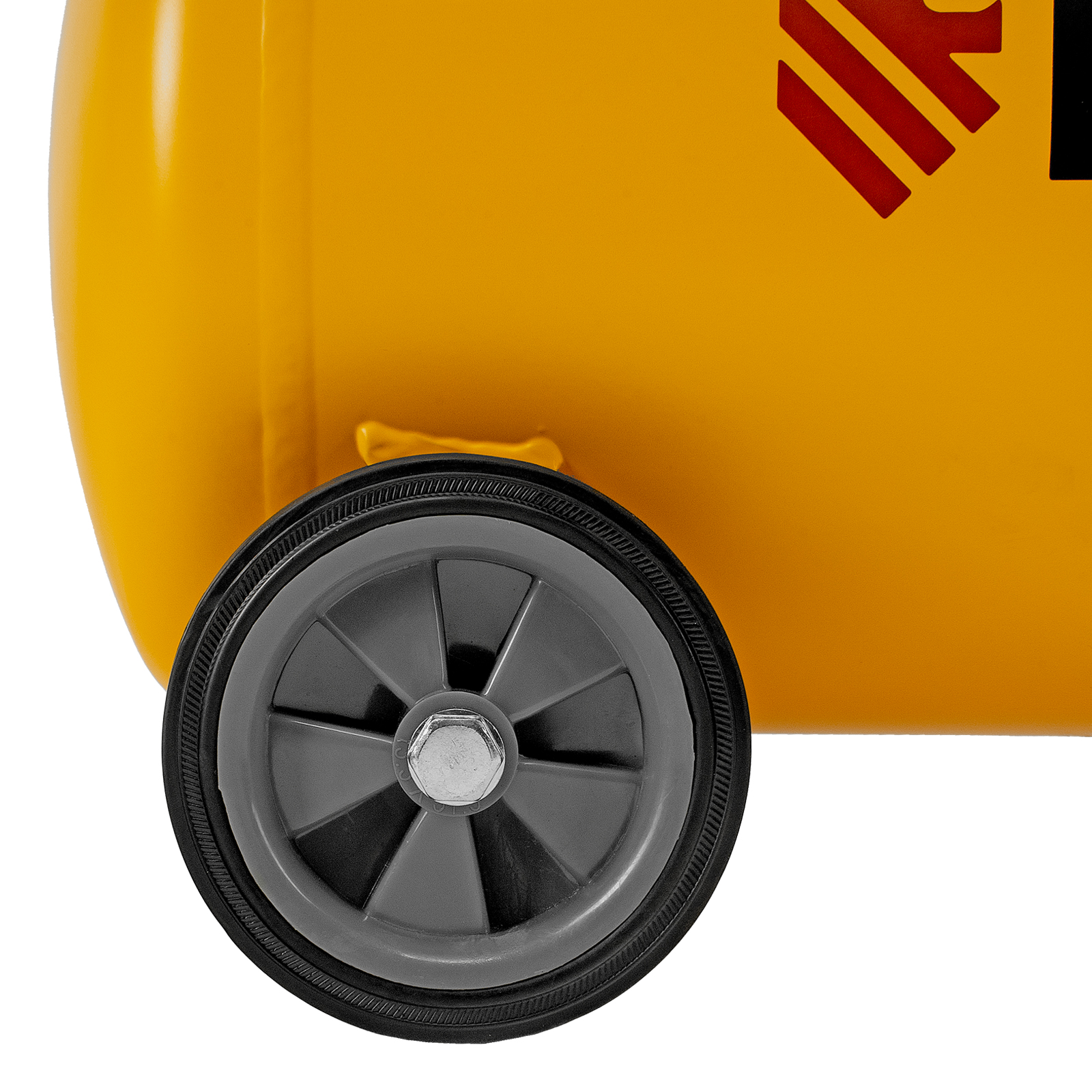 - Мобильность — транспортировочные колеса позволяют легко перемещать компрессор по рабочей площадке.
