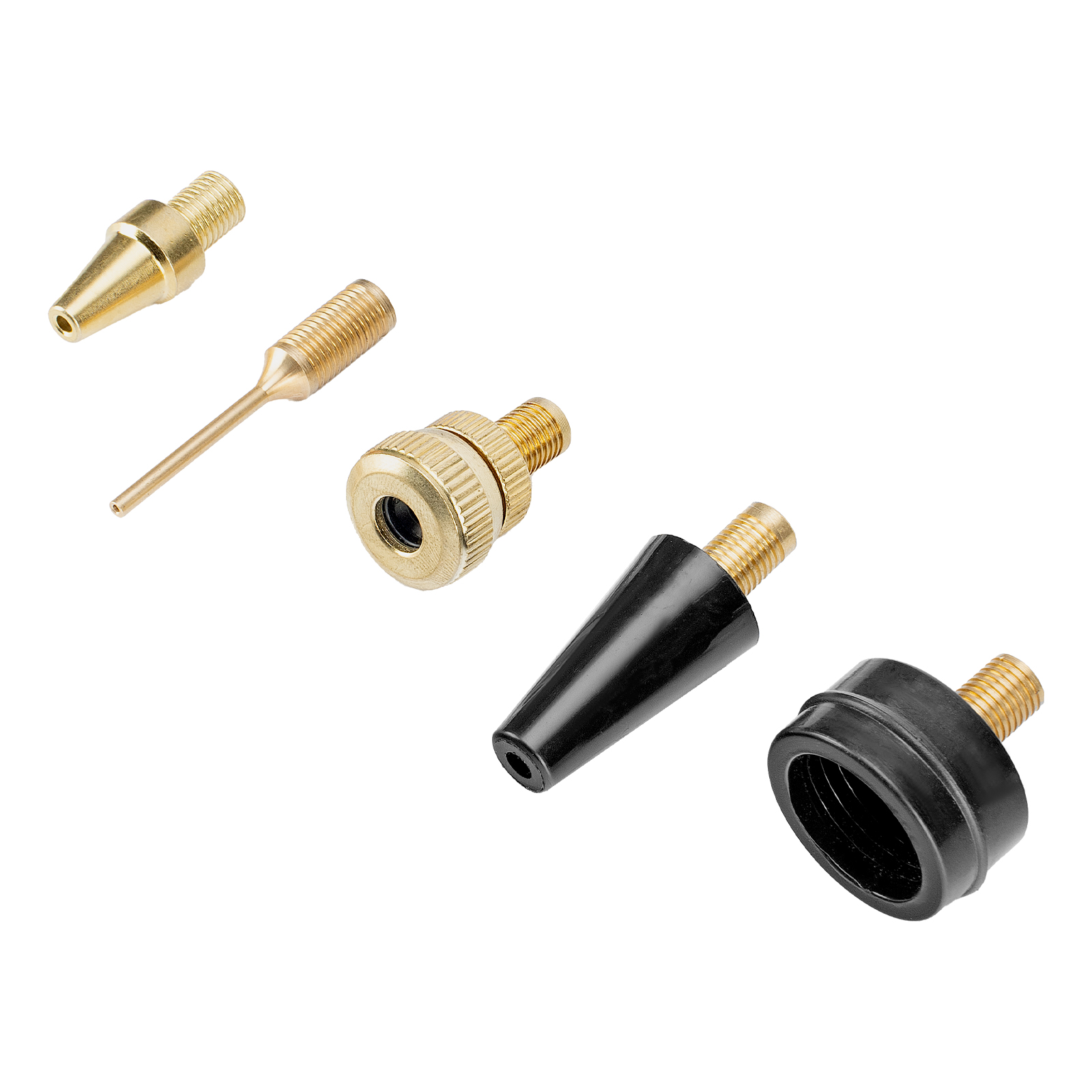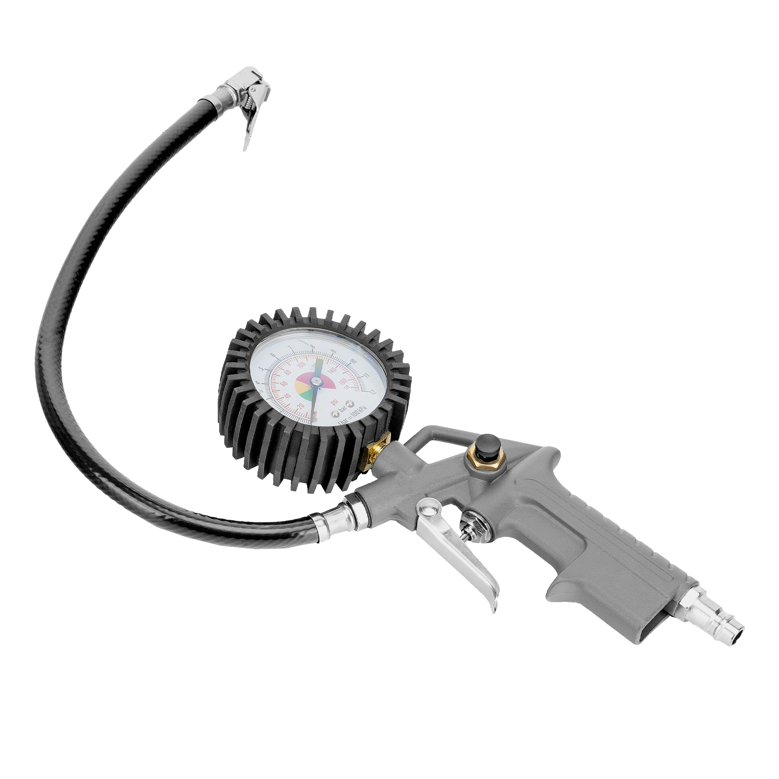 - Набор пневмоинструмента в комплекте — к устройству прилагается пистолет для накачивания с манометром, продувочный пистолет, пневматический шланг, а также набор пневмосопел и переходников.